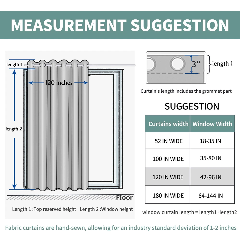 Package Includes: 1 panel of purple blackout curtain; each panel measures 10 Foot(120 Inch) wide by 8 Foot(96 Inch) long. Each curtain panel has 12 silver metal grommets ( inner diameter 1.6 inch ) on top, comparable with most rods. Easy to hang, and slide smoothly. Sliding Door Curtain: These extra wide curtains are wide enough to cover the sliding door as well as other wide windows perfectly. Besides, these sliding door curtains can be used for shared bedroom, apartment, storage, studio, dorms, loft, office, fitting room and etc. Room Divider: Just draw room divider curtains shut when either side needs privacy, these room separating dividers do a great job of blocking the unwanted view of the room and create a private space for you. It also can be a temporary solution for creating new spaces without building walls. Room Darkening and Thermal Insulated: Our blackout curtains can block out sunlight ( Darker colors work better ). These privacy curtains are perfect for night shifts, late sleepers and afternoon naps. Our energy saving curtains insulate against summer heat and winter chill to balance your room temperature, save your energy costs. Tips: Our curtain width is flat width for each panel before hanging, actual coverage width is less. Choose total curtain flat width at least 1.5 - 2 times wider than window and curtain length should to be greater than the window height for perfectly coverage.