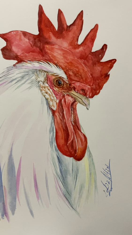 White Rooster. Watercolor original painting . Not a print or a copy . Hot press acid -free watercolor paper 140 lb , 300 gsm . Signed on the front and back by artist Liz Altin . Size 9 x 12 inches . The painting comes is quality zip lock clear disposable plastic bag , strong backing board and is well protected.