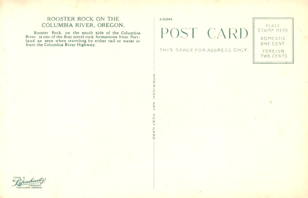 Rooster Rock, a unique rock formation on the south side of the Columbia River near Portland, is a prominent landmark visible from rail, water, and the Columbia River Highway.