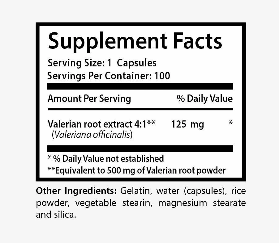 Valerian Root Extract 4:1 125mg Pure & Potent Ingredients Help Promote Relaxation and Tranquil Rest, Sleep Support. One Of Nature's Premier Herbs For Relaxation. Puts Your Mind At Ease So You Can Rest & Rejuvenate. A Traditional Favorite In Europe For Centuries. All-Natural Aid For A Better Night's Rest. 1 Bottle, 100 Capsules Made In USA Valerian Root Extract (Valeriana Officinalis) Overview: Valerian is well known for its sedative qualities and its ability to relax the central nervous system and the smooth muscle groups. It has been used as a sleeping aid for hundreds of years especially when there is excitation or difficulty in falling to sleep due to nervousness. Over 120 chemical components are found in valerian and although a very complex herb, it has not been found to have any negative side effects with moderate use.The use and health benefits of valerian root go back hundreds of years, back to during the 2nd century.It is calming without exerting too sedative an effect and is practically non-addictive. It is a valuable treatment for insomnia, the sedative effect due to the valepotriates and the isovaleric acid. Supplements containing valerian are also sometimes recommended as a herbal help for people with slipping problems. The potential benefit in this regard appears to be related to chemicals in the plant that bind to certain receptors in the brain. At least two double-blind studies have demonstrated that valerian extract can significantly reduce the amount of time it takes people to fall asleep without changing the normal stages of sleep. The Health Benefits of Valerian Root Extract: A type of valerian known as Valeriana wallichii, may help you sleep better, according to a laboratory animal study published in the July 2012 issue of the journal "Phytomedicine." Participants who took doses of 200 and 300 milligrams per kilogram of body weight fell asleep faster and woke up fewer times during the night. Total sleep time increased and brain levels of the neurotransmitters norepinephrine and serotonin were improved. Additionally, slow brain waves during non-REM sleep increased, indicating improved sleep quality. Researchers concluded that Valeriana wallichii's sleep benefits may be related to its effects on levels of neurotransmitters and certain other amino acids in the brain. Valepotriates and sesquiterpenes in valerian root have sedative effects that aid in inducing sleep. The sleep-wake cycle in humans is regulated by melatonin, a hormone secreted by the pineal gland in the brain. Melatonin is often given to people for healthy sleep. However, valerian root is a better alternative remedy for sleep problems in both adults and children. Valerian Root Extract Help Reducing Sleeplessness: Valerian is a popular plant in the all-natural world because of its beautiful appearance and lovely aroma that is very noticeable when the stem is placed in water. The valerian flower blooms during the summer, generally between June and September although it might bloom outside of this range as well. The benefits of valerian are heralded and well-known as it has been used for centuries as a calming agent for people. Valerian root is widely known for its calmative effects and is largely used to help sleeping problems. It has anxiolytic and tranquilizing properties, and sleep-inducing and calming effects on the nervous system.Valerian root is therefore very efficient in reducing sleeplessness and helping people who have to deal with restless nights.The valerian root has been one of the most popular substances for a variety of ailments. For years, it has been used as a sleep aid for people who have stress and have trouble sleeping through the night. The most beneficial thing to note about valerian is that it does not give you the groggy or sleepy feeling the next day after using it. How Does Valerian Work? Valerian is a beautiful looking flowering plant with clusters of white and light pink small flowers, somewhat resembling hyacinths. Centranthus ruber, commonly known as red valerian due to its fuchsia flowers, looks very much like valerian, but is a completely different plant with none of the health benefits of the original. Valerian has been carefully studied for over 100 years and is described in over 650 scientific publications. Plant scientists have identified specific valerian compounds that interact with the human brain in specific ways. Alkaloids such as actinidine, chatinine, syanthine, valerianine, and valerine have the same function in the human brain as catnip does for cats. If you feel like purring after you take valerian, it was probably due to the alkaloids. In the valerian plant itself, these compounds serve to lure insects to parts of the plant they can't eat. Flavanones such as hesperidin, 6-methylapigenin, and linarin may lower blood pressure and may stop muscle twitches. This indirectly reduces activity in the brain. In the plant itself, the compounds help it deal with drought, and a valerian plant that has been drought-stressed during the summer is more likely to put you to sleep when you use it to make a supplements. The use of valerian in supplement is on the rise due to the many health benefits it provides. It is a common recipe in supplements specially designed to deal with sleep problems and low moods. Gamma aminobutyric acid, also known as GABA, is the chief inhibitory compound in the human nervous system. This compound defends the valerian plant in nature from being eaten by goats and sheep. If a goat or a sheep walks into a field of valerian and starts munching away, the GABA in the plant will sedate the animal so that it leaves more valerian plants alone. Irioids, such as the two valepotriates isovaltrate and valtrate are thought to be more directly responsible for the soporific effects of the plant. These compounds interact with the same receptors in the brain. Because valerian seems to become more effective with continued use, there may be a cumulative effect, or valer