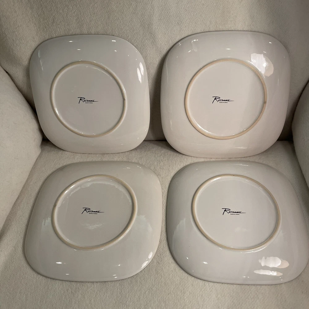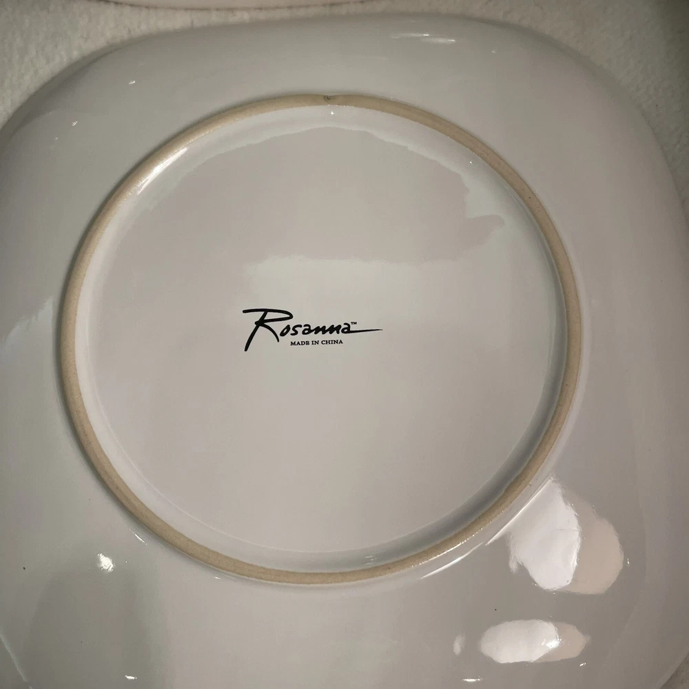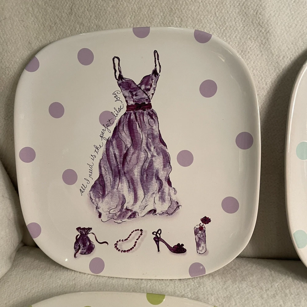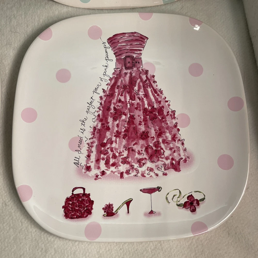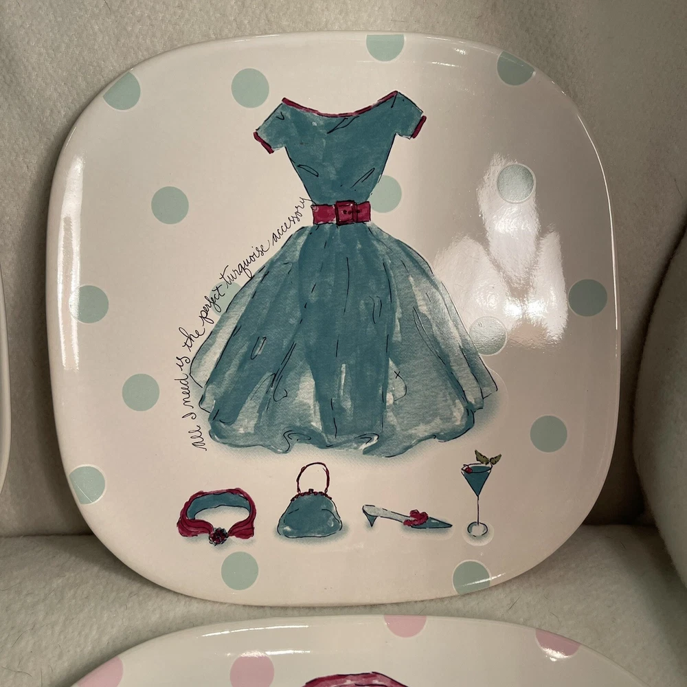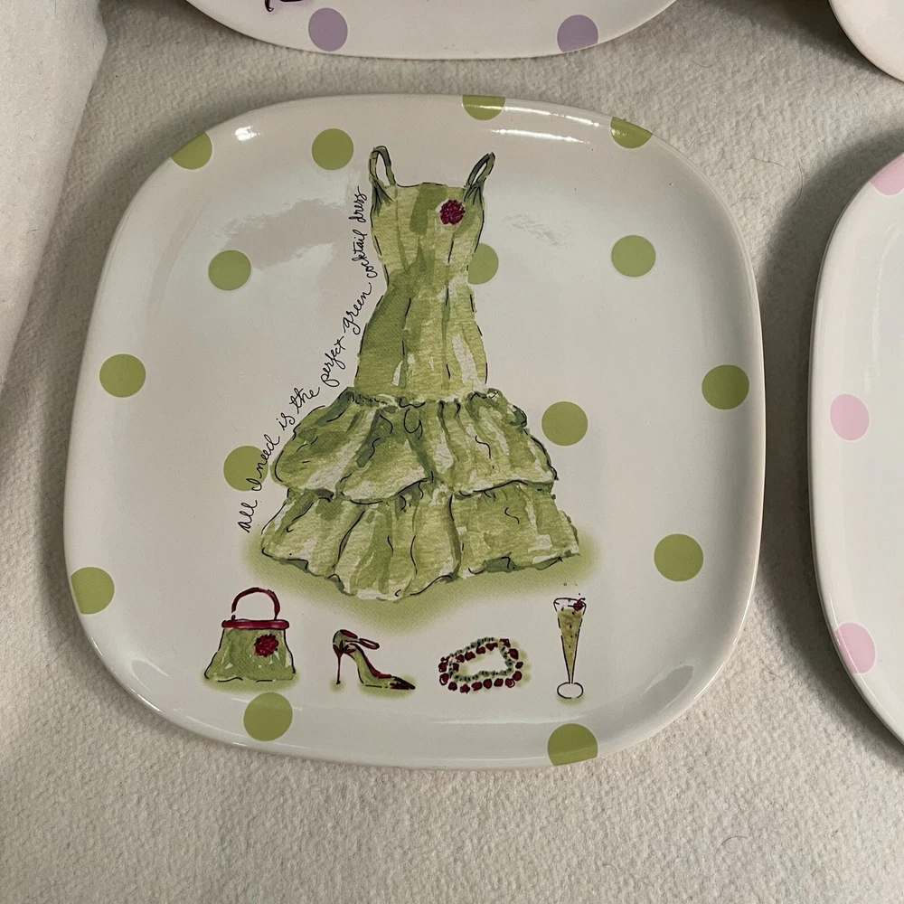 The Rosanna Dessert Plates set features four square ceramic plates with a novelty theme of "All I Need 4 Different Dresses." Each plate showcases a unique art deco design of clothing, handbags, and shoes in a multicolor palette. The plates are 8.25 inches in length and width, making them suitable for various occasions. They are microwave and dishwasher safe, providing convenience for everyday use or special events. This 2018 collection from Rosanna is a stylish and practical addition to any dining table. Excellent condition. No chips or cracks. New without tags.