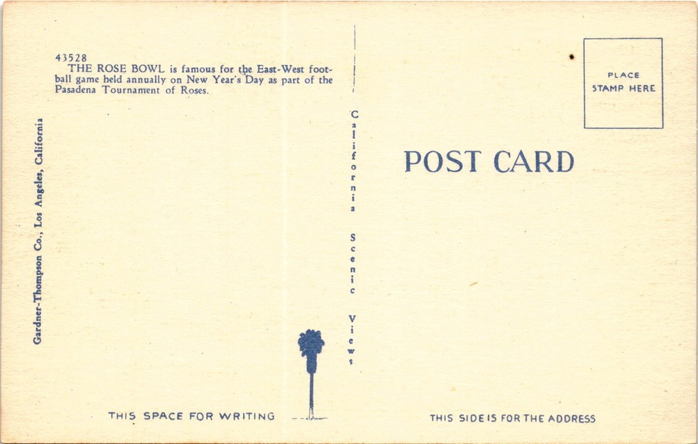 MAKE AN OFFER. THE MORE YOU BUY THE BETTER DEAL I WILL ACCEPT The postcard features an image of the Rose Bowl in Pasadena, California, known for hosting the annual East-West football game on New Year's Day as part of the Pasadena Tournament of Roses. The Rose Bowl is a historic stadium that has been the home of the UCLA Bruins football team since 1982.