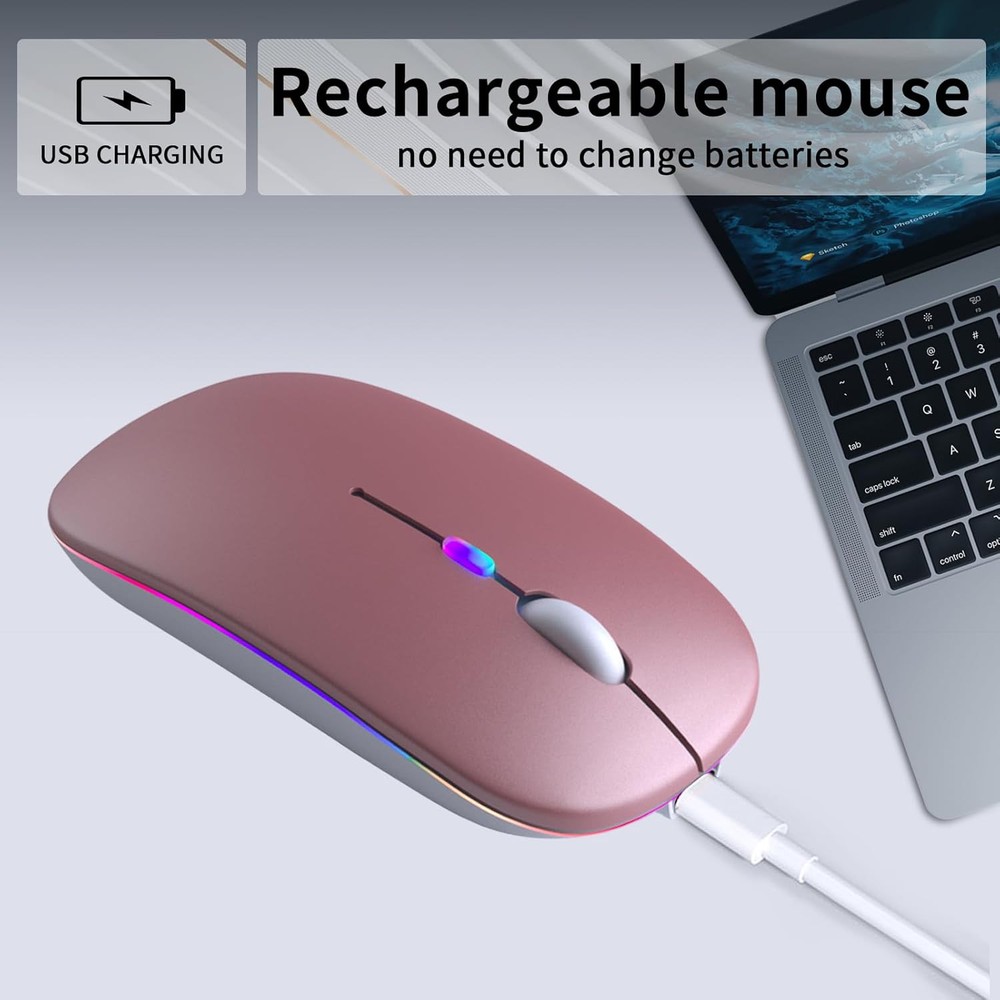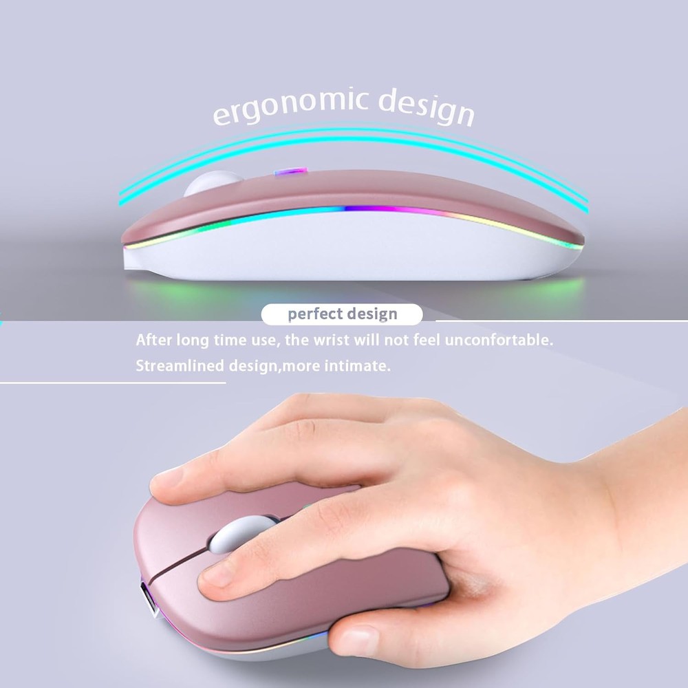 Wireless Bluetooth Mouse, Rechargeable LED Dual Mode Mouse Rose Gold Product Details Product Dimensions: 4.4 x 2.3 x 0.1 inches Item Weight: 2.1 ounces Manufacturer: KANMABPC Country of Origin: China Brand: KANMABPC Color: Rose Gold Connectivity Technology: Bluetooth Special Feature: Wireless, Portable, Rechargeable, Soundless, LED Lights Movement Detection Technology: Optical 【Rechargeable Silent Mouse】: Built-in rechargeable battery, no need change battery.it can be easily charged using the included USB cable. 2 hours charging, you can use it for 7-15 days. Special soundless design for the right and left buttons, Noiseless click, no worrying about disturbing others beside you, let you concentrate on work. 【Colorful Light】: 7 different color changes randomly while in use, offering soothing lighting, creating cool and fancy atmosphere for work and play.This wireless mouse Bluetooth with lights can give you more fun during office time. 【Energy Saving】: The mouse will be in sleep mode in 5 mins of inactivity. You can choose use the 2.4G wireless mouse when the mouse botton switch is on the 2.4G mode,or connect your laptop's Bluetooth to use the Bluetooth mouse, easy to switch,suitable for any occasion. 【Portable Mouse and Operation Notice】: Size About 4.4 x 2.3 x 1.1 inch,it can be easily put into your laptop bag and ultra-space saving.Slim and lightweight,durable ergonomic mouse is perfect for travel.The USB receiver is stored inside the back of the mouse.No need for a driver,Plug and Play!Automatic sleep mode and wake-up mode are installed to save energy.Pls Turn off the mouse LED light when not in use to expand the using life. 【WIDE COMPATIBILITY】: Accurate wireless bluetooth mouse with a working distance up to 10 meters (33 feet) for fast data transfer without delay or loss. Compatible with Windows XP, Vista, 7, 8, 10, 11, Windows ME, Mac OS and more. Also supports bluetooth connection, this LED wireless + bluetooth mouse is perfect for desktop, laptop, tablet, PC, Macbook, iPad and other bluetooth devices. for home, office, travel and more. Colorful LED rechargeable dual-mode Bluetooth mouse (Bluetooth 5.2+USB 2.4G) Note: Cannot be set to a specific color. One mouse, multiple devices Just press the mode switch button at the bottom of the mouse to control the device you want. Wide Device Compatibility Windows 8, Windows 10 or later, Android 5.0 or later, Mac OS X10.10 or later, iPad OS 13 or later, Chrome OSTM. charging function Built-in 500mA rechargeable Li-ion battery provides 7-15 days of working time and 1 month of standby time. It can be easily recharged with the included USB cable, eliminating the need for battery changes. Support charging while using, more power saving and more to charge it with phone charger adapters. portable The lightweight and slim design makes it ideal for travel and fits easily in a laptop bag or pocket. (Measures approximately 4.4 x 2.3 x 1.1 inches) Package Included: 1 wireless bluetooth dual-mode mouse 1 x USB receiver (in the mouse's battery compartment) 1 x USB charging cable 1 x User Manual