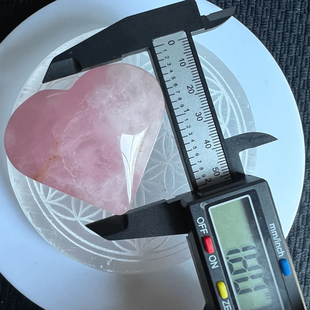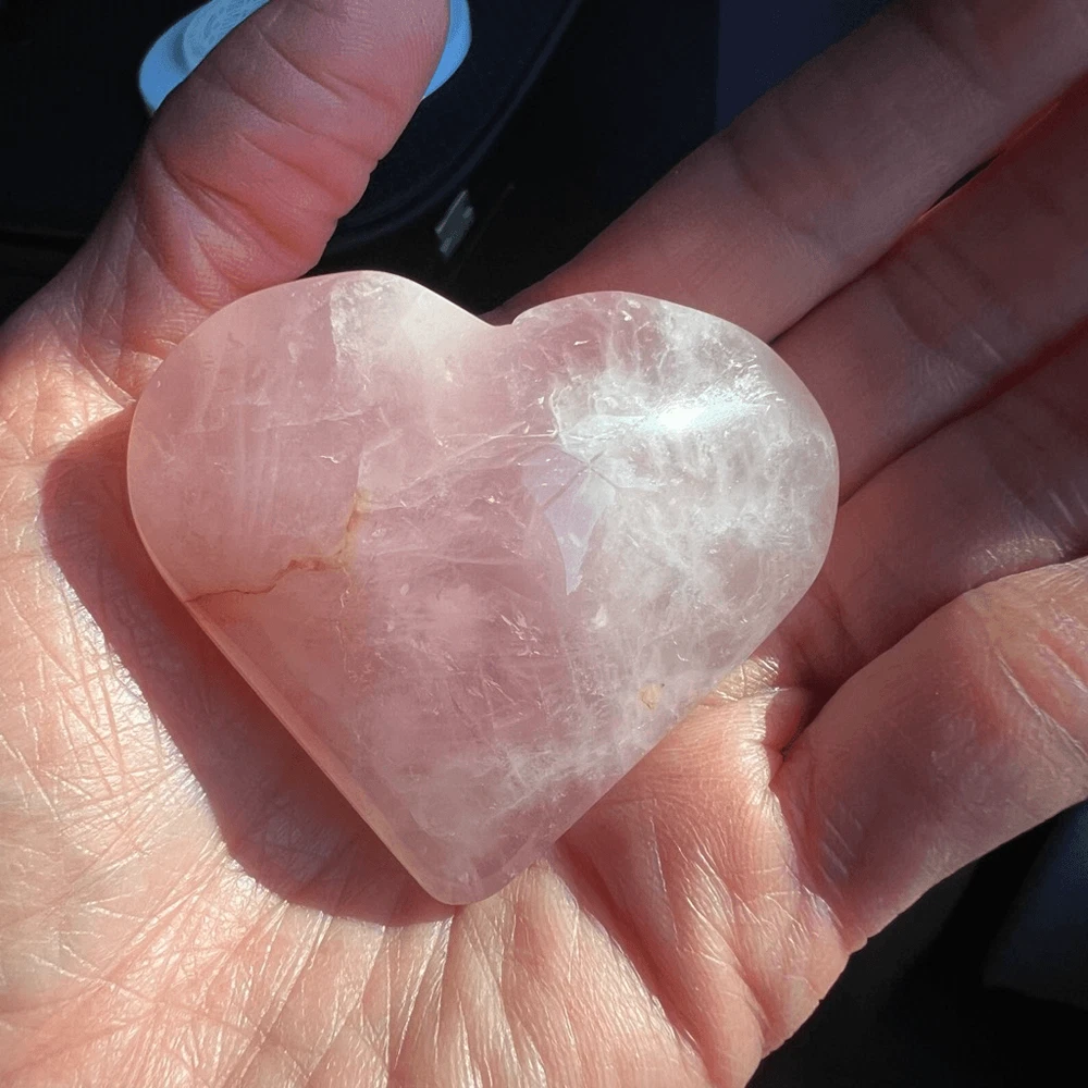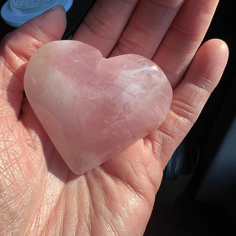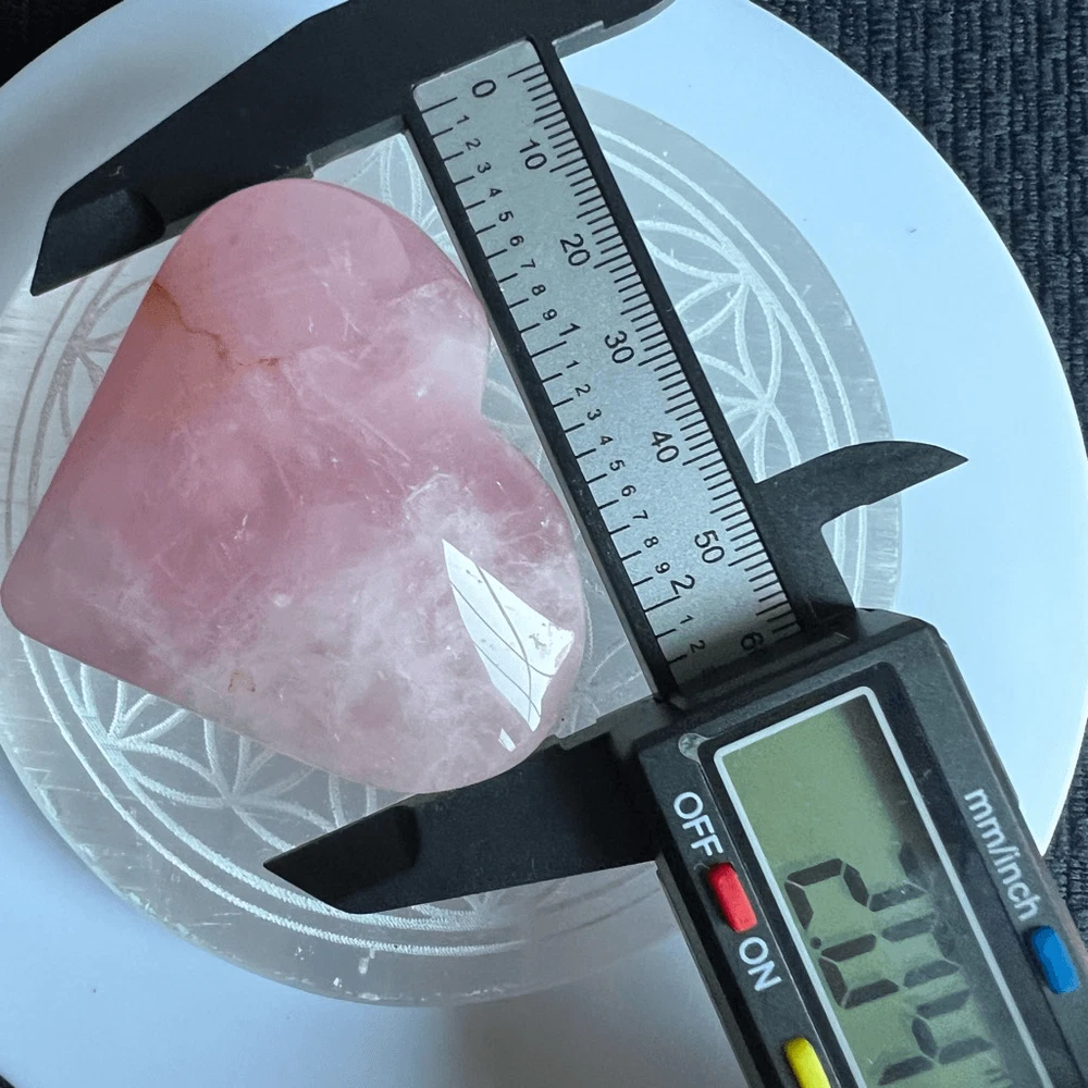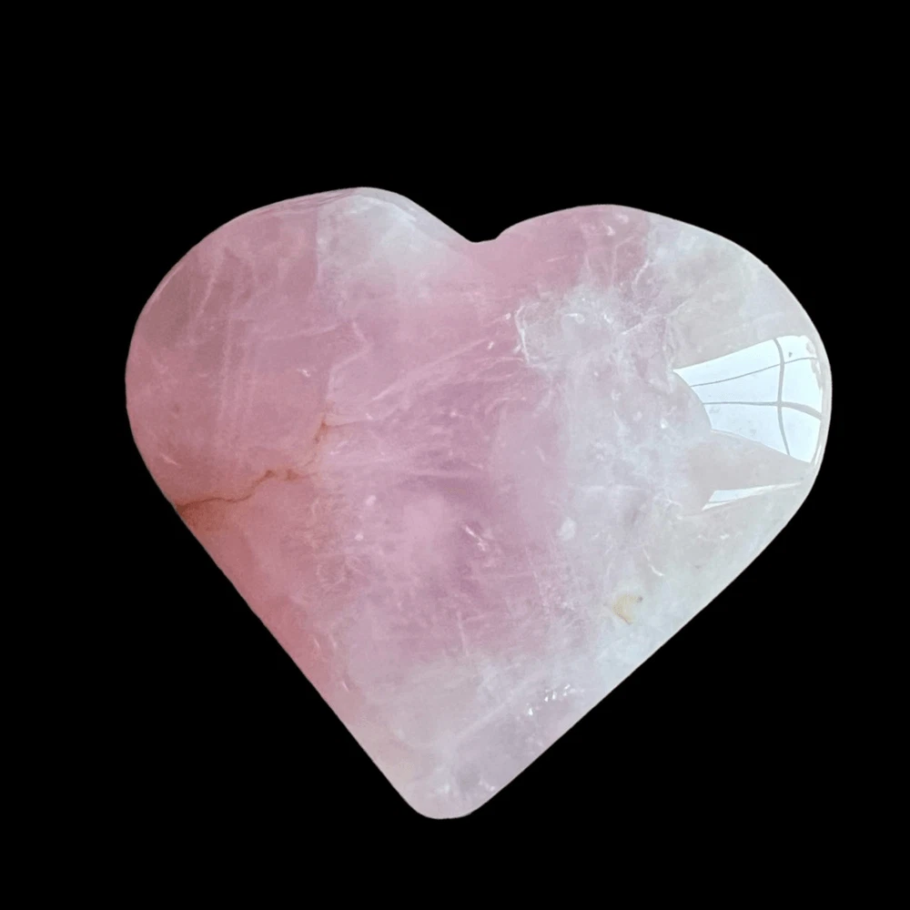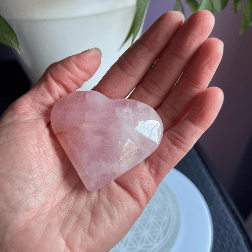 Rose Quartz Heart Carving Meditation Healing Stone (#1) A rose quartz heart carving is a delicate gemstone sculpture, intricately crafted from the soothing pink-hued mineral, rose quartz. Its smooth surface and heart shape symbolize love and compassion. Rose quartz is renowned for its emotional healing properties, fostering self-love, harmony, and deepening relationships. Believed to enhance empathy and promote feelings of peace, this gentle crystal is cherished for its calming energy and ability to open the heart chakra, encouraging unconditional love and emotional healing in its beholder. Approximate Measurements 54.0 grams 1.80” x 2.4” x 0.77” Please note natural stones are one of a kind and tend to have imperfections. Certian Lighting may alter the crystal’s color display in photos. Smoke Free | Pet Free Environment