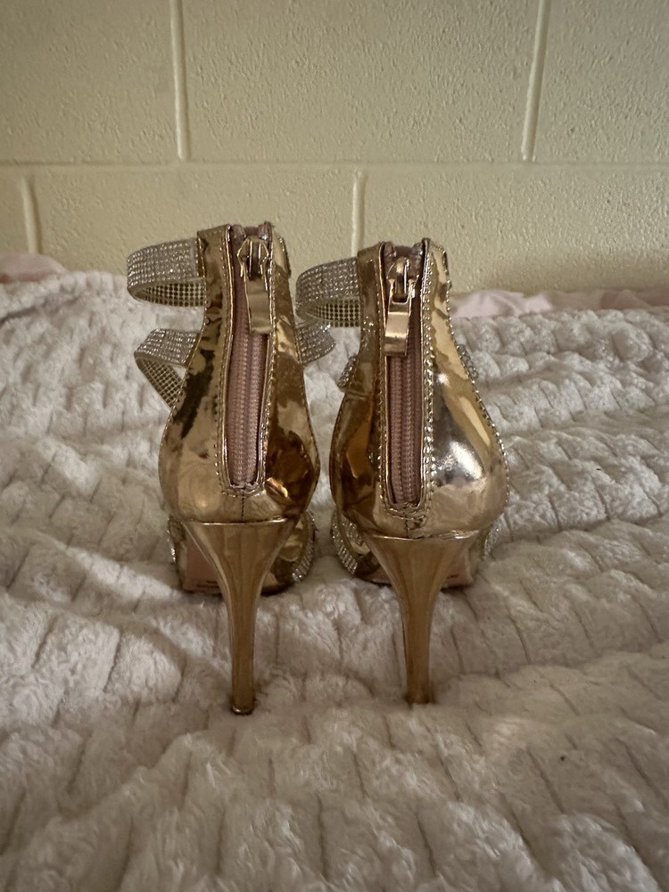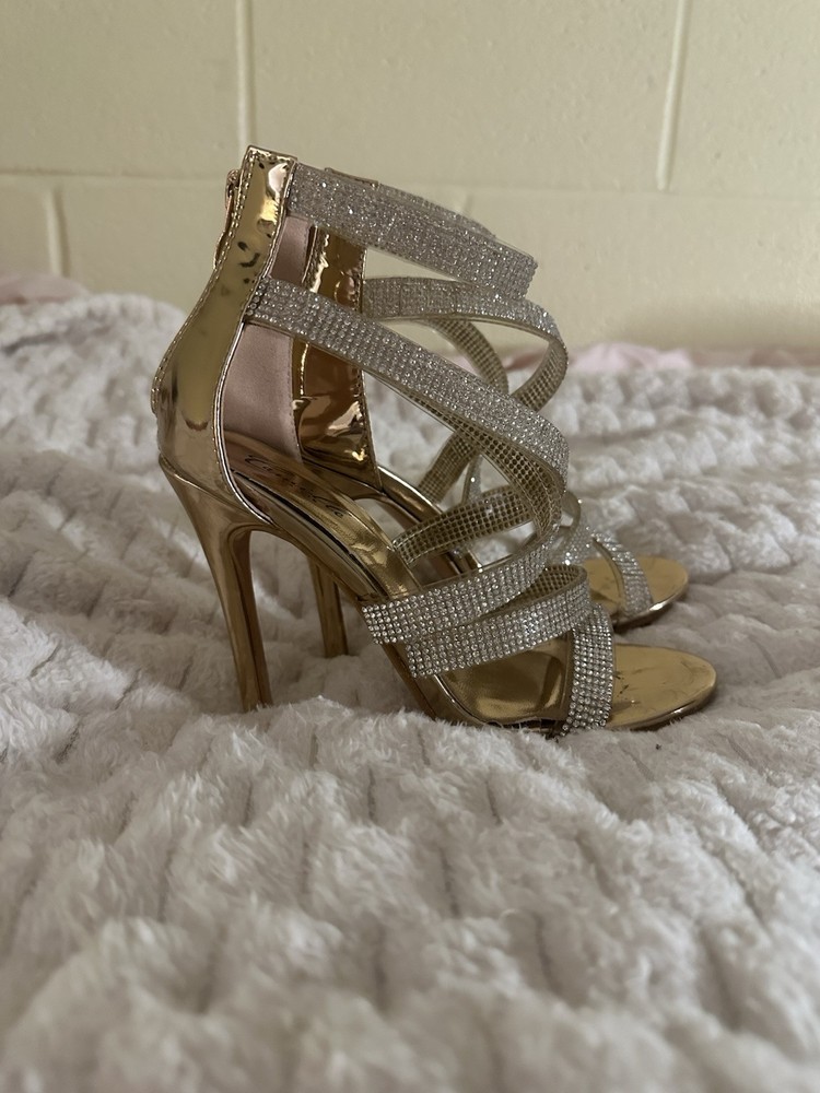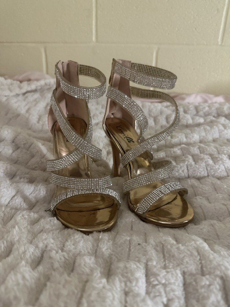 Features:Ankle StrapCustomized:NoHeel Height:Ultra High (4 in & Higher)Heel Style:StilettoVintage:NoUS Shoe Size:5.5Accents:RhinestoneOccasion:Party/CocktailPattern:SolidDepartment:WomenStyle:StrappyUpper Material:SyntheticType:HeelColor:GoldTheme:MetalCountry/Region of Manufacture:ChinaBrand:Camille La Vie