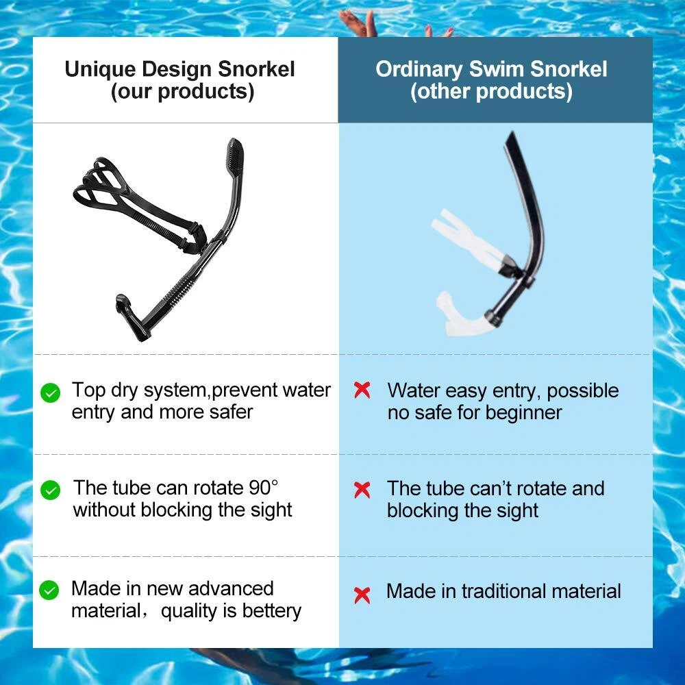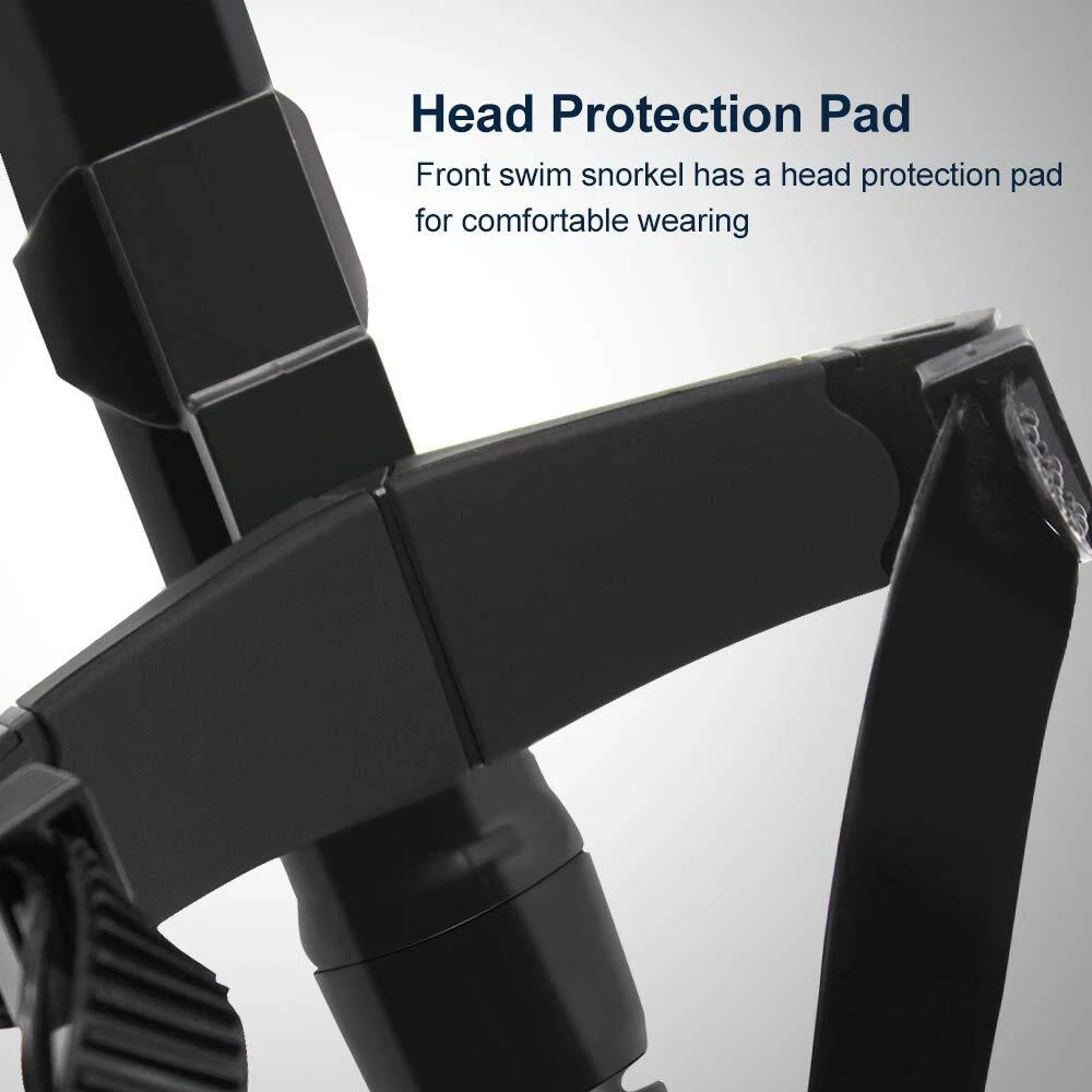The swim snorkel allows swimmers to focus on freestyle stroke technique without interruption. The full dry snorkel head prevent water enter the snorkel body and reduce the risk of choking water. With the curved shape design of front snorkel, promotes proper head position. Swimmers can relax in the water while maintaining proper body alignment and improving stroke technique for maximum efficiency. With reinforced stability, the swim front snorkel allows swimming with the full range of motion, including flips turns. Full dry snorkel head allows swimmers the ability to focus on stroke technique without turning the head to breathe. Stays in place for freestyle, butterfly, and breaststroke. Unique rotating design, when you rest, you can rotate the tube to the side without obstructing your sight. The soft silicone pads fit snugly on the forehead without gaps and make you feel good to wear. The tube body is multiple fixed not easy to move while swimming. Comfortable mouthpiece made with a soft and flexible -silicone. Adjustable head bracket makes for quick strap adjustments and universal fit. -way purge valve allows water to flow out of the tube without entering the mouthpiece.