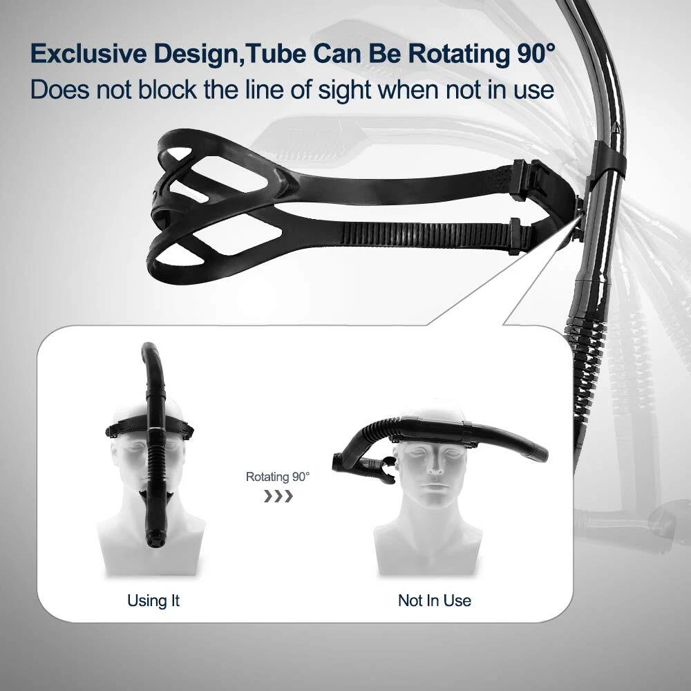 The swim snorkel allows swimmers to focus on freestyle stroke technique without interruption. The full dry snorkel head prevent water enter the snorkel body and reduce the risk of choking water. With the curved shape design of front snorkel, promotes proper head position. Swimmers can relax in the water while maintaining proper body alignment and improving stroke technique for maximum efficiency. With reinforced stability, the swim front snorkel allows swimming with the full range of motion, including flips turns. Full dry snorkel head allows swimmers the ability to focus on stroke technique without turning the head to breathe. Stays in place for freestyle, butterfly, and breaststroke. Unique rotating design, when you rest, you can rotate the tube to the side without obstructing your sight. The soft silicone pads fit snugly on the forehead without gaps and make you feel good to wear. The tube body is multiple fixed not easy to move while swimming. Comfortable mouthpiece made with a soft and flexible medical-grade silicone. Adjustable head bracket makes for quick strap adjustments and universal fit. One-way purge valve allows water to flow out of the tube without entering the mouthpiece.