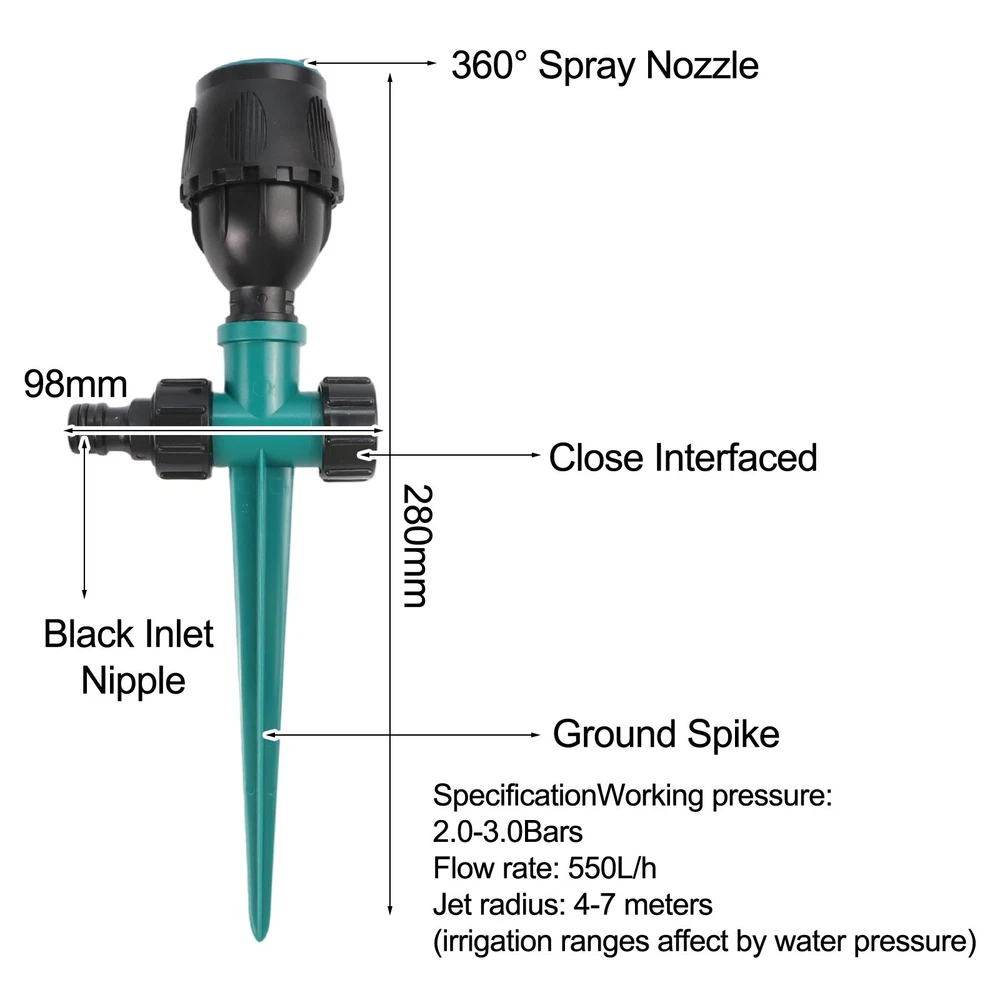 Product Description Features: * brand new and high quality *Stable & Lawn Spike Sprinkler: Compared with the butterfly base lawn sprinkler, this water garden sprinkler lengthen the spike can be fixed securely in the uneven or sloping ground, spike into the ground and connect to a tap, the lawn sprinkler will be prevented from shaking or falling down due to water pressure. *Automatic for 360 Rotation Small Lawn Sprinkler: The automatic sprinkler attachment can be rotated for 360 degree to make sprays, Water sprinkler for garden lawn spray range from 13ft-23ft under 29-44KPI water pressure, the fine spray jet can provide more even coverage for your garden. *Easy to Install and Use: Convenient garden sprinkler , attach the hose to quick hose connector, then connect to the lawn sprinkler . Irrigation rotates for 360 degrees without any other auxiliary devices, only through the water supply pressure in the household *Garden Sprinklers for Large Areas Coverage: Water sprinkler for garden have 2 water inlets design which allow to tandem 2 or more sprinklers to suitable for larger areas of lawn. *Multipurpose Application: Water sprinkler garden can be used for lawn, agriculture, nursery, fields and lawn irrigation, it can also be used for children playtime, let your kids have fun by using this garden lawn sprinkler and feel cool in hot day. Specifications: *Material:Acrylonitrile Butadiene Styrene *Colour: green *Size: 18 x 48 x 74mm *Maximum flow rate:550 Litres Per Hour Package Contents: 1*Sprinkler Nozzle Note: 1. The real color of the item may be slightly different from the pictures shown on website caused by many factors such as brightness of your monitor and light brightness. 2. Please allow slight manual measurement deviation for the data. Payment Payment must be completed within 5 days. If you have any problems about payment, please contact us via ebay message. Delivery details We only ship to confirmed ebay Order addresses. Please comfirm that your Order address is in line with your shipping address. Please kindly note that the c ombined shipping is not provided because the shipping fee is calculated by weight. Also, the each additional item means exactly the the same color and size. It takes about 7 -15 working days to US; about 10-30 working days to other countries. Transit time may be a little delayed because of the bad weather and customs inspection . If you do not receive your item within 30 working days since payment finished, please contact us immediately for further assistance. Contact us We strive for 100% customer satisfaction! Positive Feedback is very important to us. If you have any questions, p lease feel free to contact us via "Ask seller a question" . We will reply your email within 24 working hours.