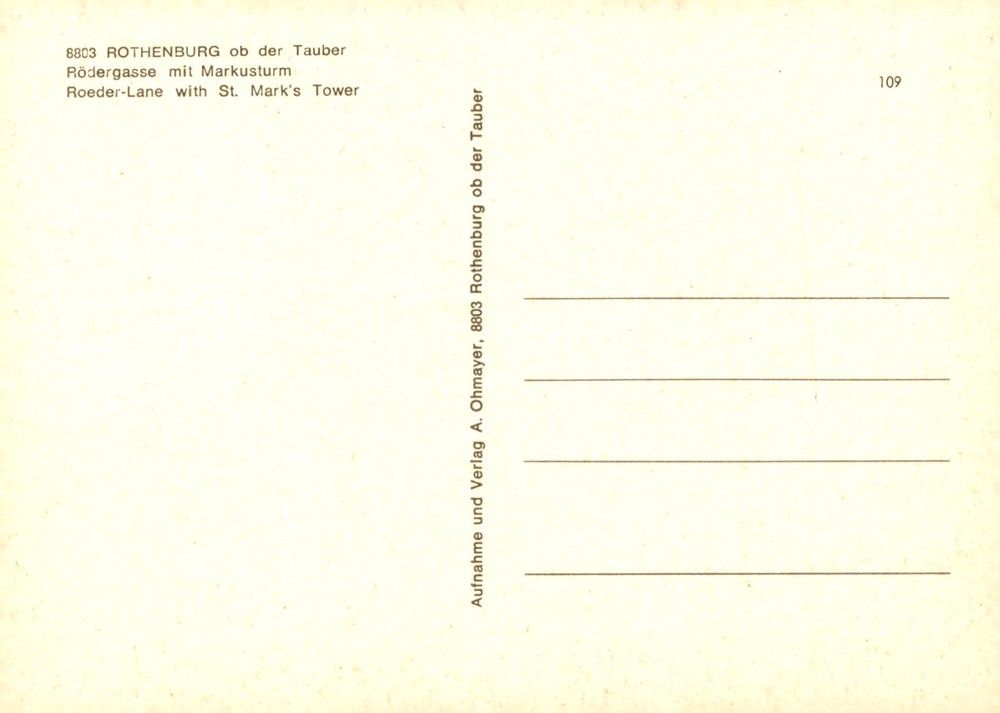 Capture of Roeder-Lane showcasing the iconic St. Mark's Tower in Rothenburg ob der Tauber.