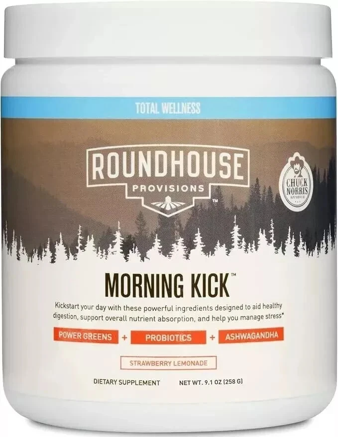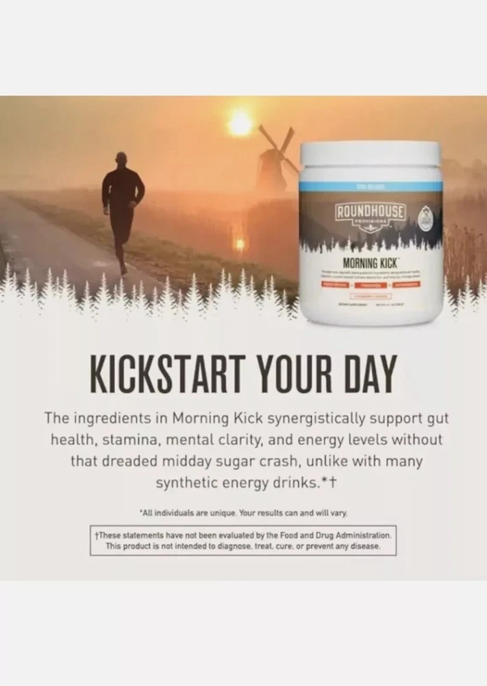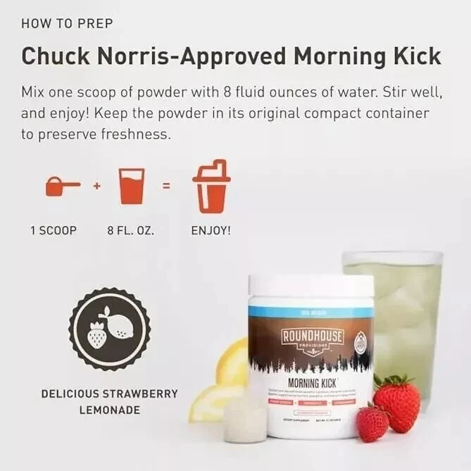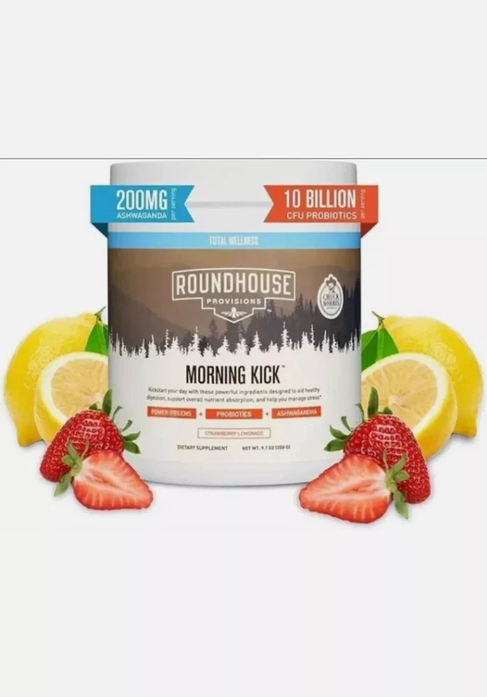 ๐ Roundhouse Morning Kick - Digestion Support, Strawberry Lemonade (9.1 oz) ๐ Start your day right with Roundhouse Morning Kick, a delicious strawberry lemonade-flavored drink mix designed to support digestion, boost energy, and enhance overall wellness. Packed with powerful probiotics, digestive enzymes, and essential nutrients, itโs a perfect addition to your morning routine. ๐ ๐น Key Features: ๐ฟ Supports Digestive Health: Contains probiotics and digestive enzymes to improve gut health โก Boosts Energy: Provides a natural energy lift to keep you active throughout the day ๐ Delicious Flavor: Refreshing strawberry lemonade taste that youโll love ๐ช Nutrient-Rich Formula: Includes essential vitamins and minerals to support overall wellness โ Easy to Use: Just mix with water and enjoy a refreshing morning drink ๐ Gluten-Free & Non-GMO: Made with high-quality, clean ingredients ๐น Why Choose Roundhouse Morning Kick? ๐ Morning Kick is more than just a drink mixโitโs a comprehensive solution for better digestion and sustained energy. Whether youโre kickstarting a busy day or recovering from a workout, this blend is designed to keep you feeling great. ๐น How to Use: Mix one scoop with 8-12 ounces of water, stir well, and enjoy daily, preferably in the morning.