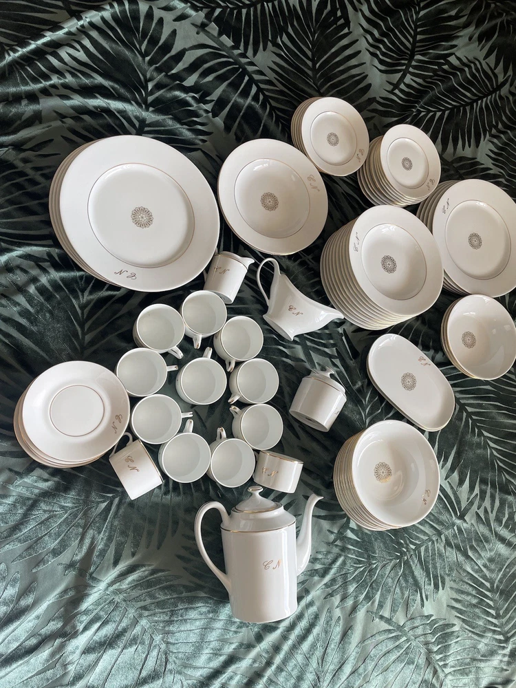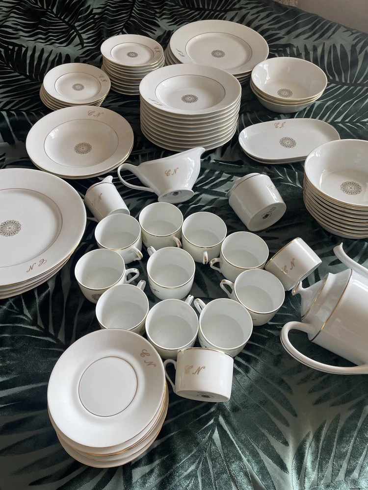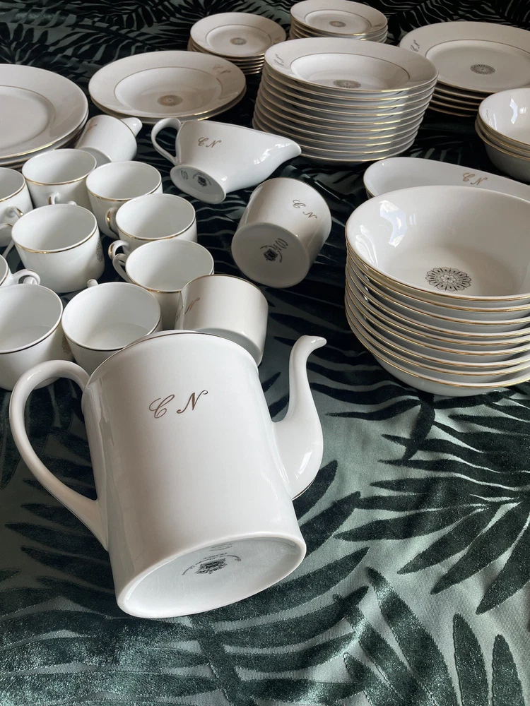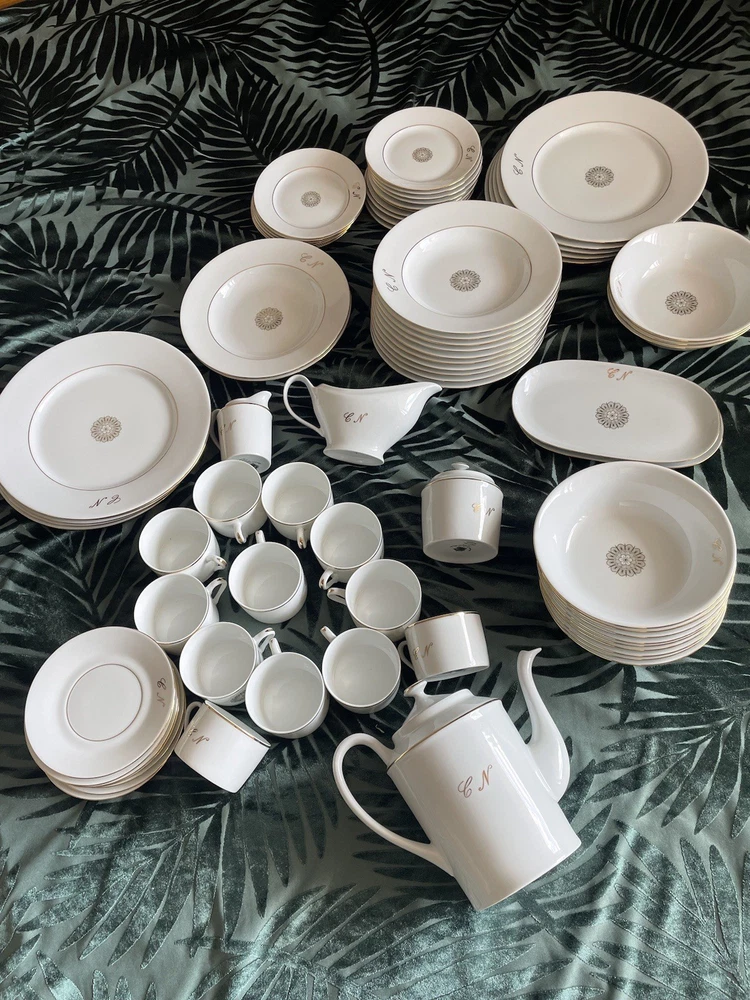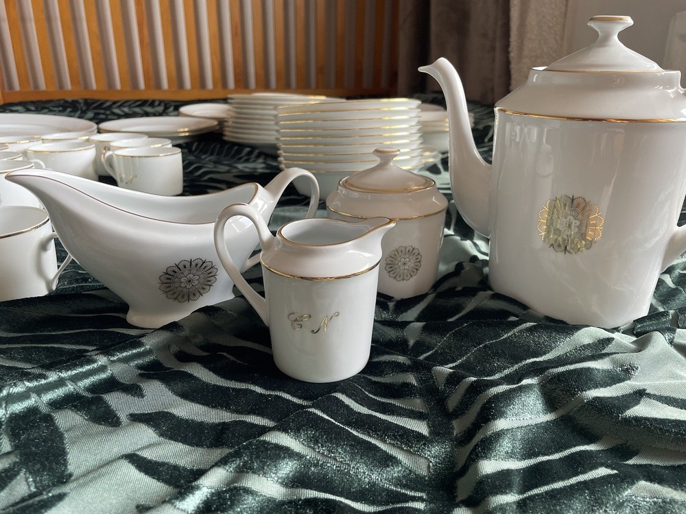 This exclusive De Limoges Porcelain France Set contains of 75+1 dinning items: 1)1 Teapot: Large teapot with 24K gold trim and monogrammed; 2) 12Tea/Coffee Cups with 24K gold trim all monogrammed; 3) Saucers: 1 small and 1 big with 24K gold trim, monogrammed; 4) 1 Creamer with 24K gold trim, monogrammed; 5) 1 Sugar Bowl with 24K gold trim and monogrammed; 6)10 Serving Platters: Oval-shaped platters for serving, with a gold floral design in the center, with 24K gold trim, monogrammed 7)13 Serving Platters: Oval-shaped platters for serving, decorated with a gold floral design in the center, with 24K gold trim, monogrammed; 8) 2 Serving Platters: Oval-shaped platters for serving, with 24K gold trim, monogrammed; 9) 10 Dinner plates with 24K gold trim, monogrammed; 10) 12 Dessert plates, with 24K gold trim, monogrammed; 11) 10 soup plates, 24 gold trim , monogrammed 11) 1 Additional medium Saucer with silver trim from Crown Mig Fine China Personal pick up /Delivery available within Uk( reasonable distance). Please contact for more details