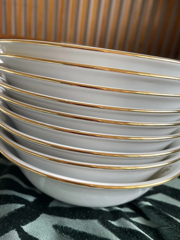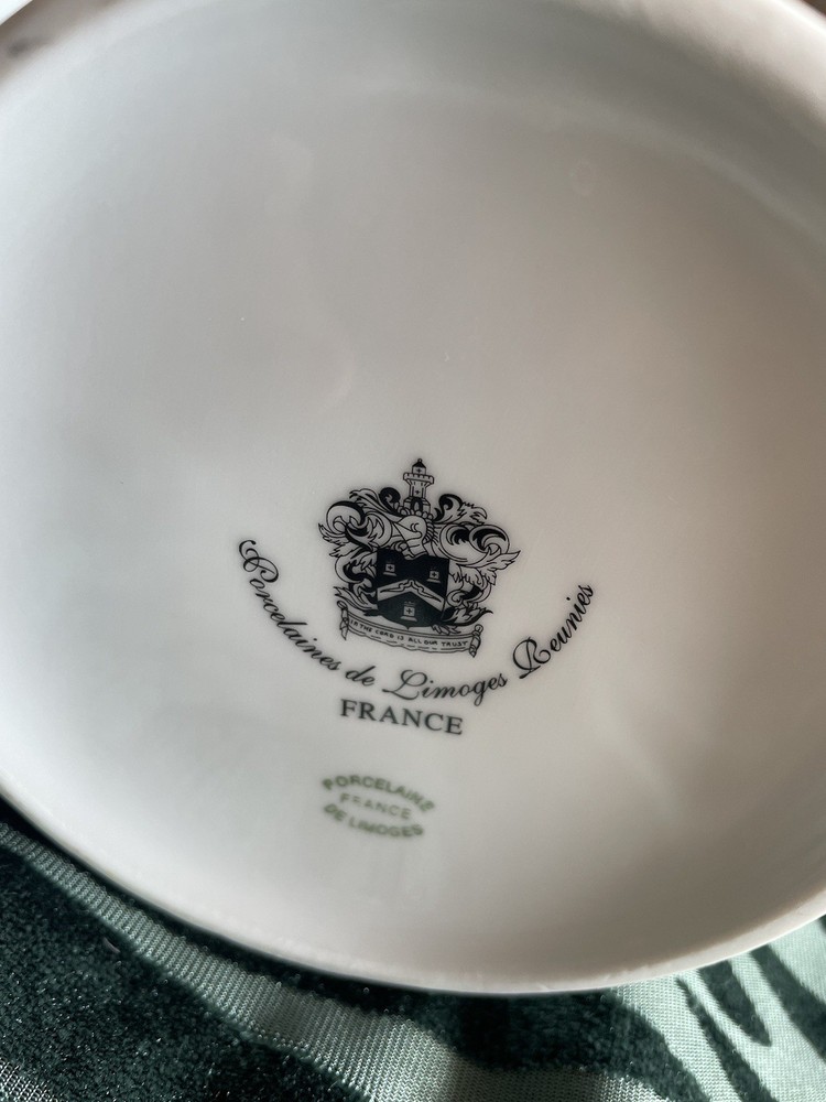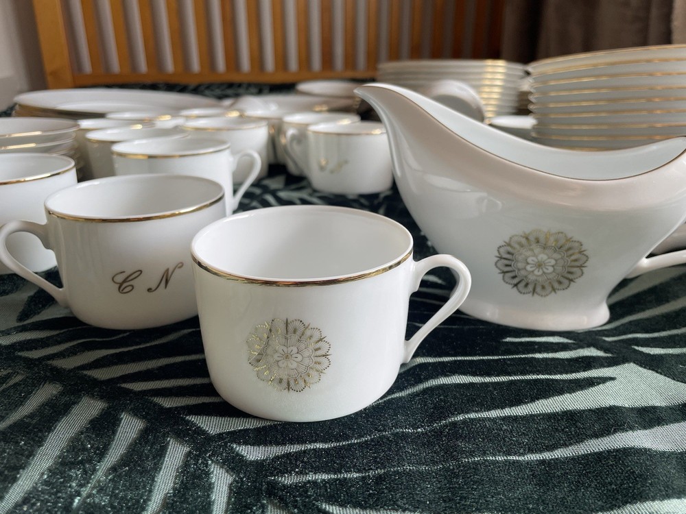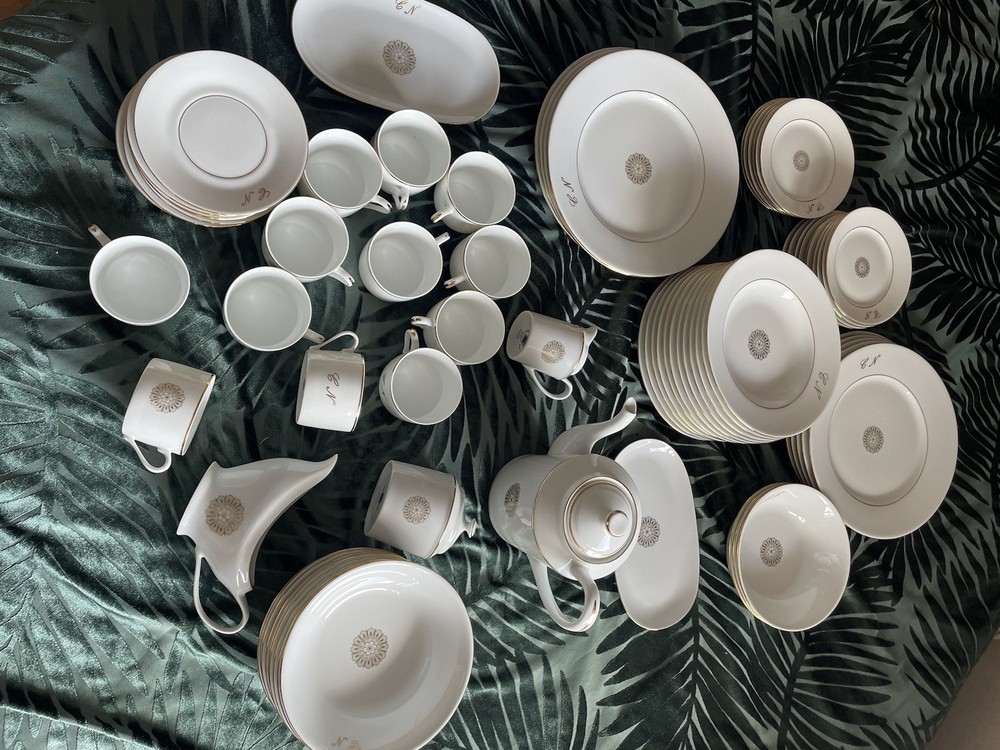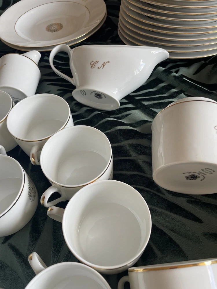 This exclusive De Limoges Porcelain France Set contains of 75+1 dinning items: 1)1 Teapot: Large teapot with 24K gold trim and monogrammed; 2) 12Tea/Coffee Cups with 24K gold trim all monogrammed; 3) Saucers: 1 small and 1 big with 24K gold trim, monogrammed; 4) 1 Creamer with 24K gold trim, monogrammed; 5) 1 Sugar Bowl with 24K gold trim and monogrammed; 6)10 Serving Platters: Oval-shaped platters for serving, with a gold floral design in the center, with 24K gold trim, monogrammed 7)13 Serving Platters: Oval-shaped platters for serving, decorated with a gold floral design in the center, with 24K gold trim, monogrammed; 8) 2 Serving Platters: Oval-shaped platters for serving, with 24K gold trim, monogrammed; 9) 10 Dinner plates with 24K gold trim, monogrammed; 10) 12 Dessert plates, with 24K gold trim, monogrammed; 11) 10 soup plates, 24 gold trim , monogrammed 11) 1 Additional medium Saucer with silver trim from Crown Mig Fine China Personal pick up /Delivery available within Uk( reasonable distance). Please contact for more details