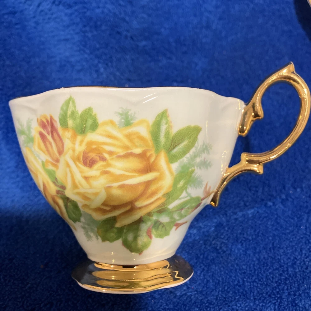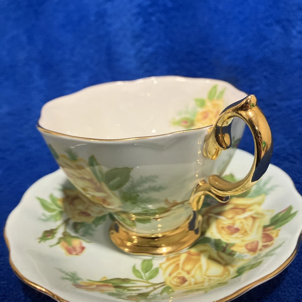 Royal Albert yellow rose pattern tea cup and saucer. No chips cracks or crazing in the glaze. Gold glaze around edge of cup and saucer as well as the handle. Set in very good condition. Combine shipping when purchasing multiple cups and saucers.
