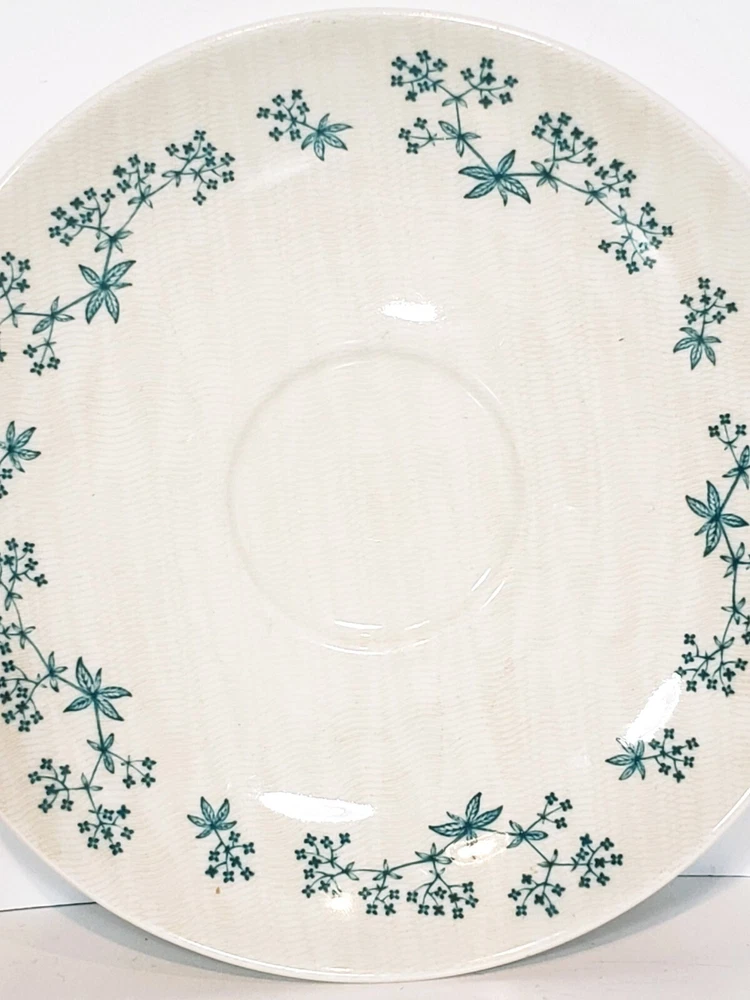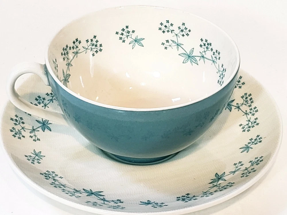 Royal Doulton April Showers Set Of 2 Tea Cups & Saucers D6435. 4 pcs 2 sets beautiful light blue color made in England . Saucers have a pattern the looks like crazing measures 6" across no chips or cracks. Tea cups are 3 3/4" across 2 1/4" tall one has a small mark on the inside see pictures it does not go all the way through besides that they are very pretty no chips or cracks .
