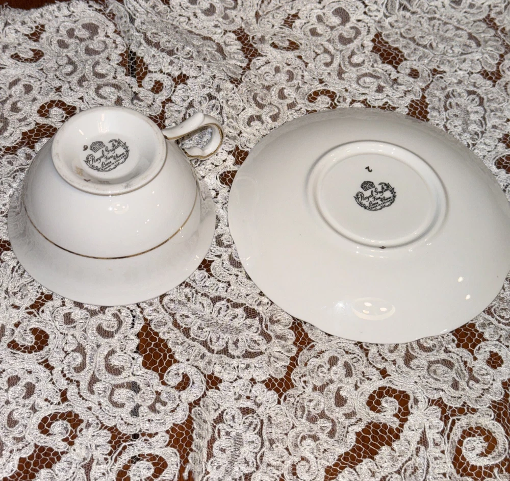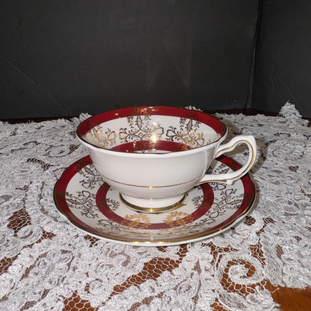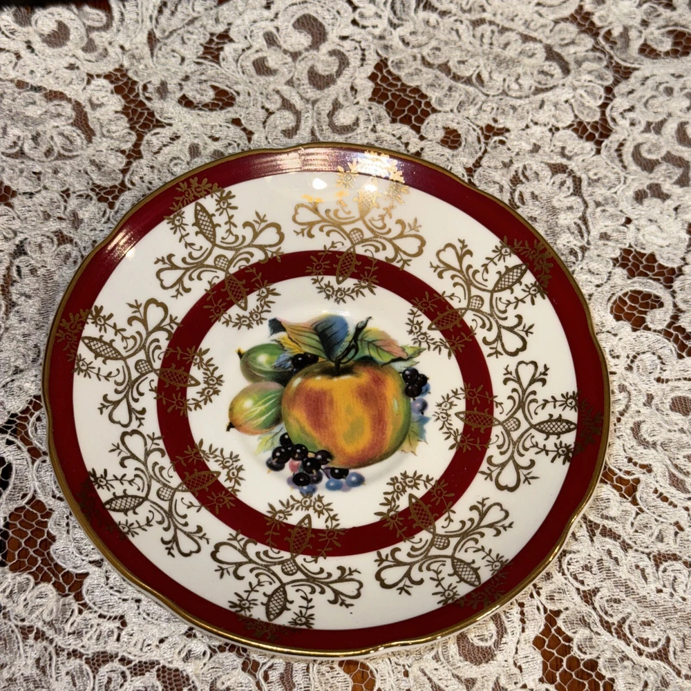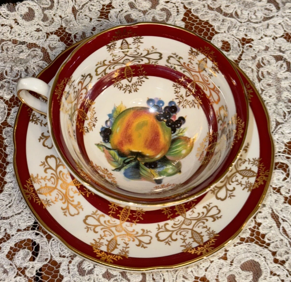 Sought after elegant burgundy tea cup and saucer set features a mix of peach or apple with blueberries and elderberries, all accented with gold. The set is made of fine bone china and was crafted in England Please let me know if you have any questions Check out the other teacups and saucers offered for sale in my store for sales and new inventory coming soon