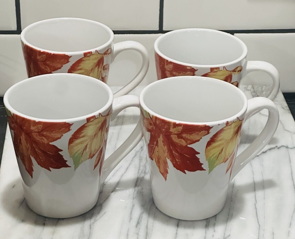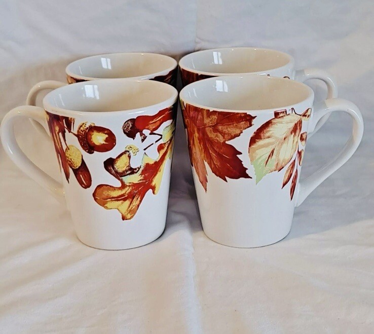 The set includes four medium-sized Royal Norfolk coffee cups featuring a contemporary design with painted leaves and acorns, perfect for Thanksgiving celebrations. The 12 oz ceramic cups are suitable for both hot and cold beverages and are decorated in a multicolor pattern. They are part of the Food & Drink theme, with a capacity to serve four individuals. These original coffee mugs are designed for unisex adults in a contemporary style, manufactured in 2023.