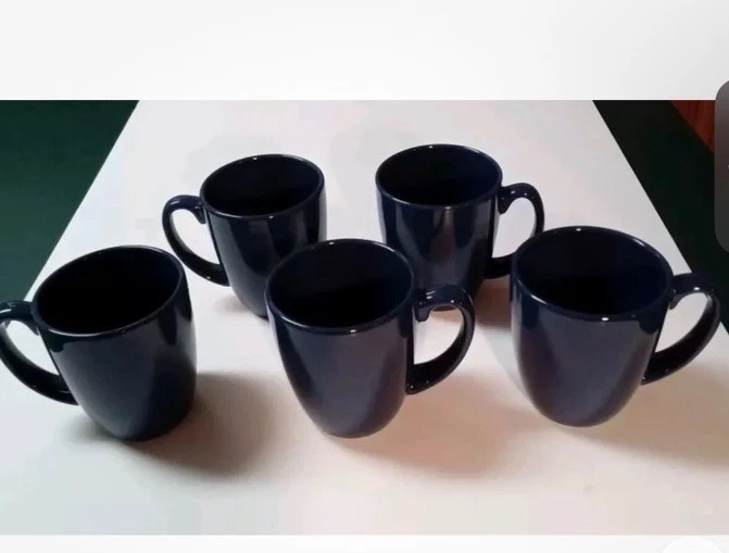 The Royal Norfolk Stoneware Black Coffee Mugs Cups set includes five round, 12-ounce mugs with a contemporary style. They are machine washable and made of glossy black stoneware material. Each mug features a handle for easy holding and has an approximate height of 4 inches and diameter of 3.25 inches. These mugs are from the Coordinates product line, manufactured in China in 2023, making them a modern addition suitable for all occasions. Perfect for coffee lovers, this set is a practical and stylish choice for everyday use.