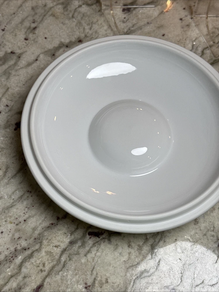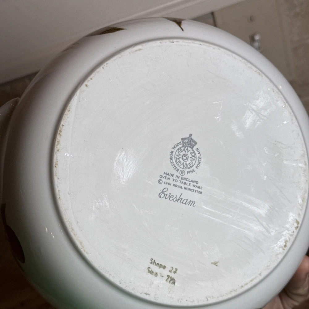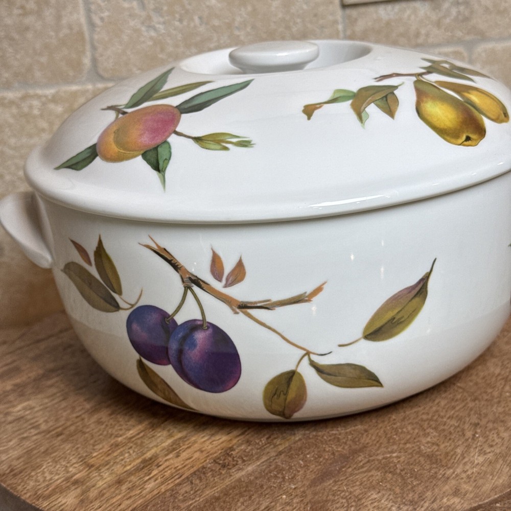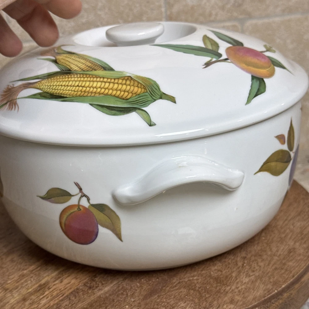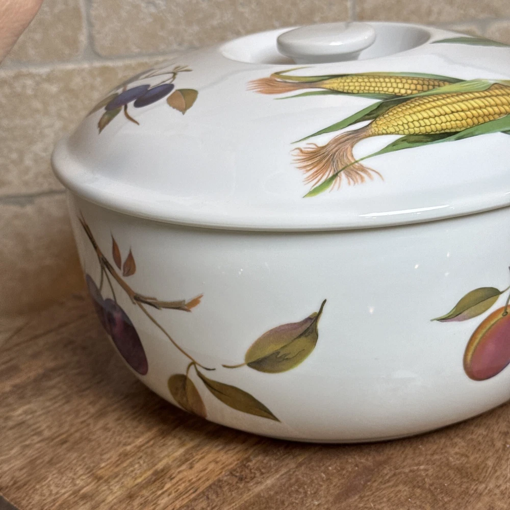 We have 4 total and all are in mint condition! A beautifully colored Royal Worcester Covered Casserole Dish decorated with sprigs of various fruits and ears of corn. The dish features gold colored handles with the lid highlighted in gold trim around the edge circumference and a gold knob. It is Made in England and hallmarked on the bottom. The Evesham pattern was first introduced in 1961 and is no longer being made. Capacity 2 1/2 Qt. to top. It measures approx. 10" Handle to Handle x 8 1/4" Diameter x 4" H. Overall height with the lid measures approx. 6"