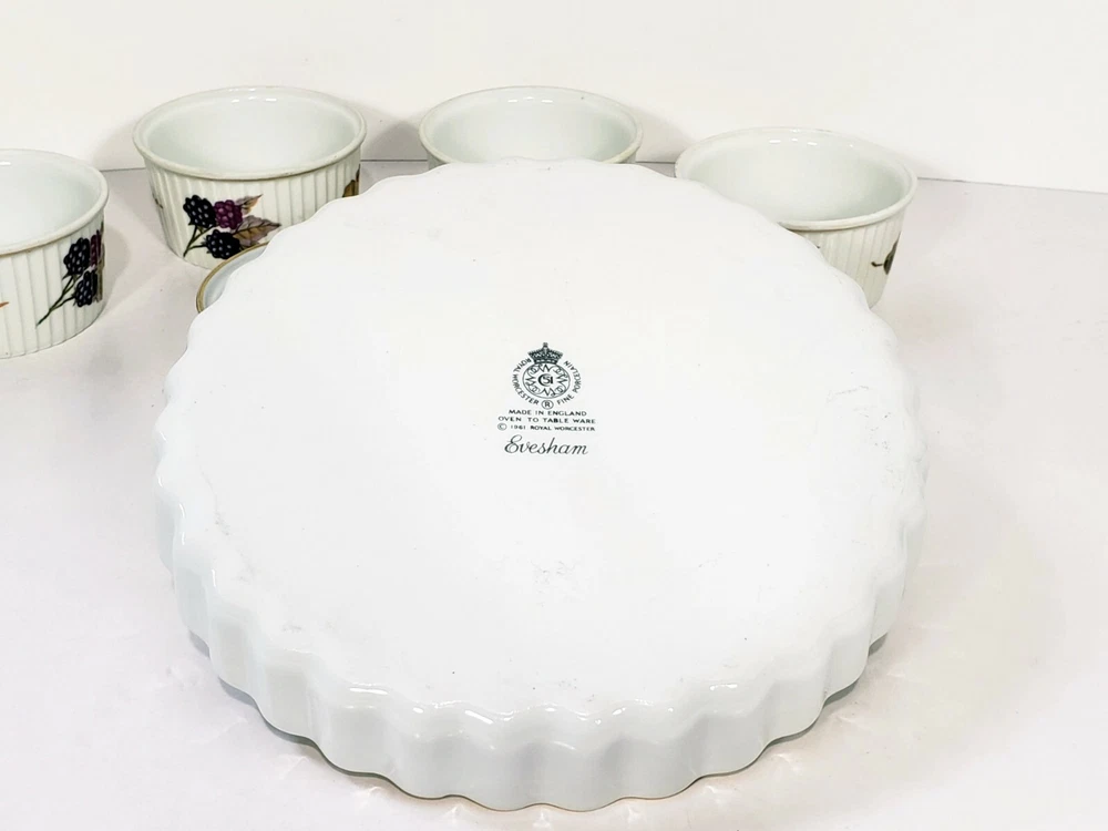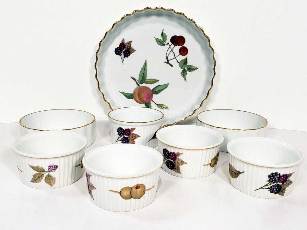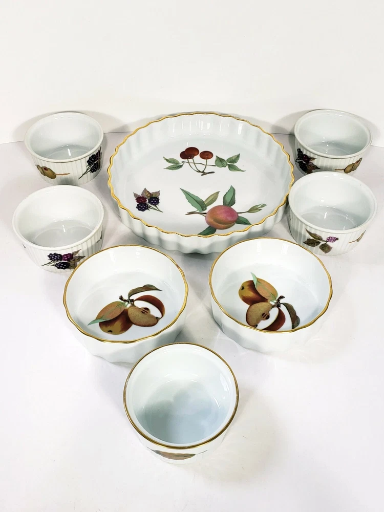 Royal Worcester Evesham Tarte Dish Ramikins Custard Cups Lot Of 8. All included 7 1/2" porcelain tarte dish Two 4" x 1 1/2" porcelain custard / souffle/ Ramikins Five 3"x 1 3/4" porcelain Ramikins All pcs are in excellent condition no chips or cracks