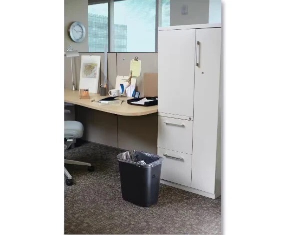 This Rubbermaid Commercial Deskside Plastic Wastebasket is a versatile and stylish addition to any room. With a capacity of 7 gallons, it is suitable for general waste, paper waste, and indoor use. The rectangular shape and slim design make it a perfect fit for any desk or countertop, while the heavy-duty construction ensures that it will last for years to come. The trash can features a solid pattern and is made from chrome and plastic materials, giving it a modern and sleek appearance. It also has stackable features, making it easy to store and transport. This wastebasket is branded and comes with a model number FG295600BLA. It is suitable for use in various rooms such as the entryway, garage, bathroom, kitchen, bedroom, living room, sunroom, home office/study, and utility/laundry room.