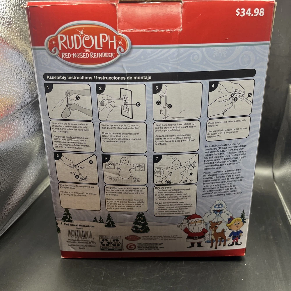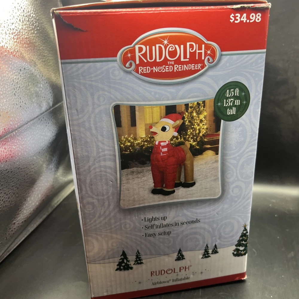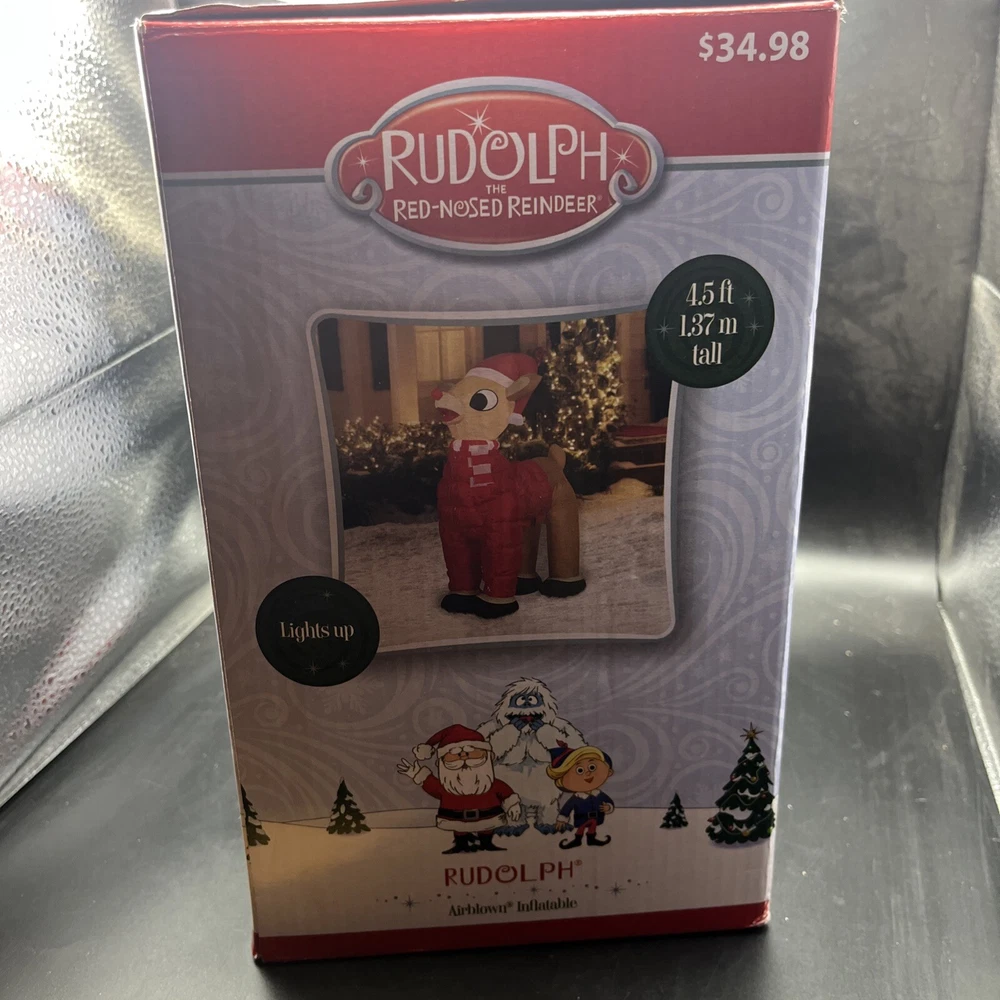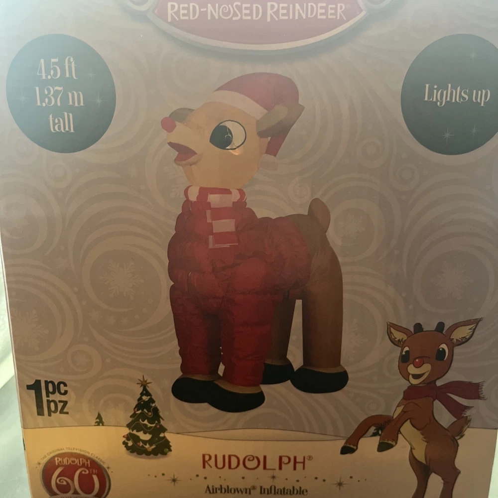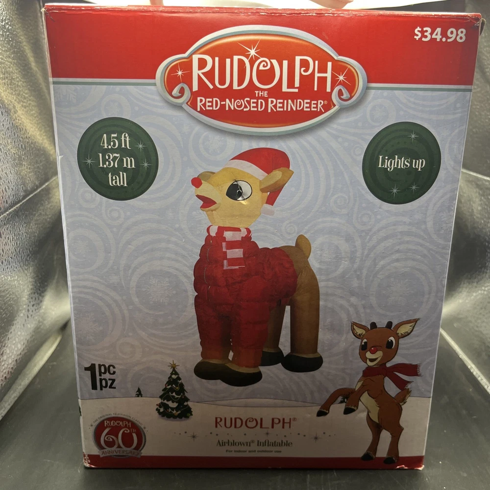 This is a Rudolph the Rednosed Reindeer 4.5 Ft. Christmas Yard Inflatable Decor featuring LED lighting technology. It is designed for festive holiday occasions and operates through a wall plug-in power source. The inflatable decoration showcases multicolor lights and is ideal for adding a touch of Christmas spirit to your yard.