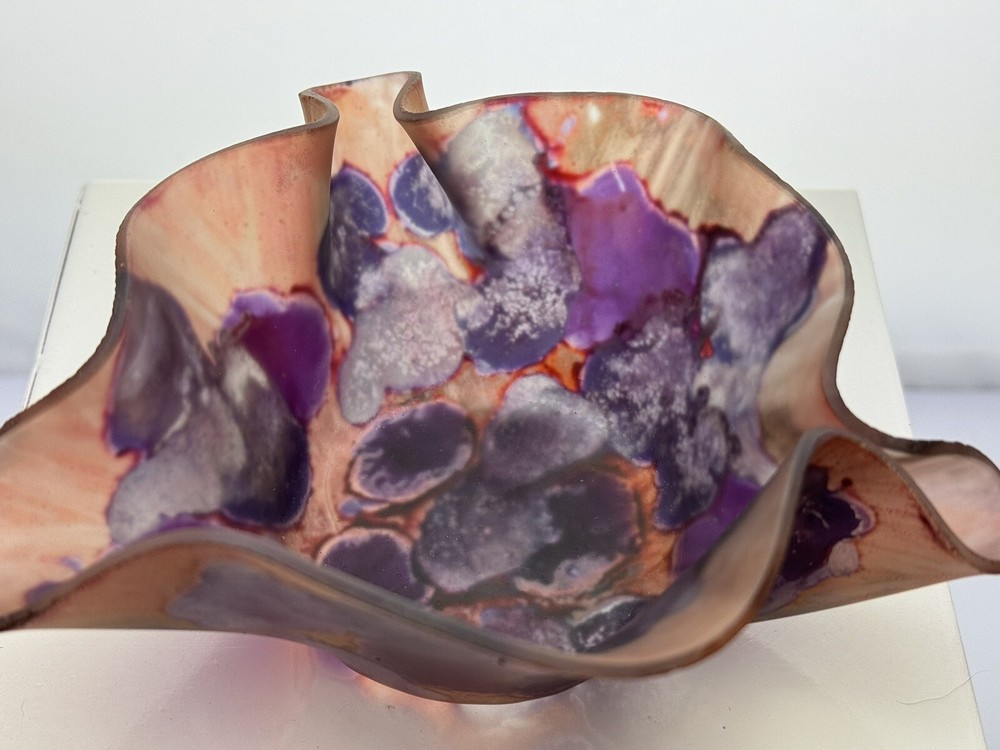 This Rueven Style (may be Rueven but unsure) hand-stained frosted art glass ruffled bowl with abstract iris design is a beautiful vintage piece that will add elegance to any room. The bowl features a unique abstract iris pattern, making it a one-of-a-kind item for collectors of art glass. Made of high-quality glass materials, this stained glass bowl is perfect for decorative use or for storing trinkets. Its abstract shape and ruffled edges make it a standout piece in any home decor. Excellent condition with no chips or cracks, minor scratches to patina that are only noticeable when backlit.