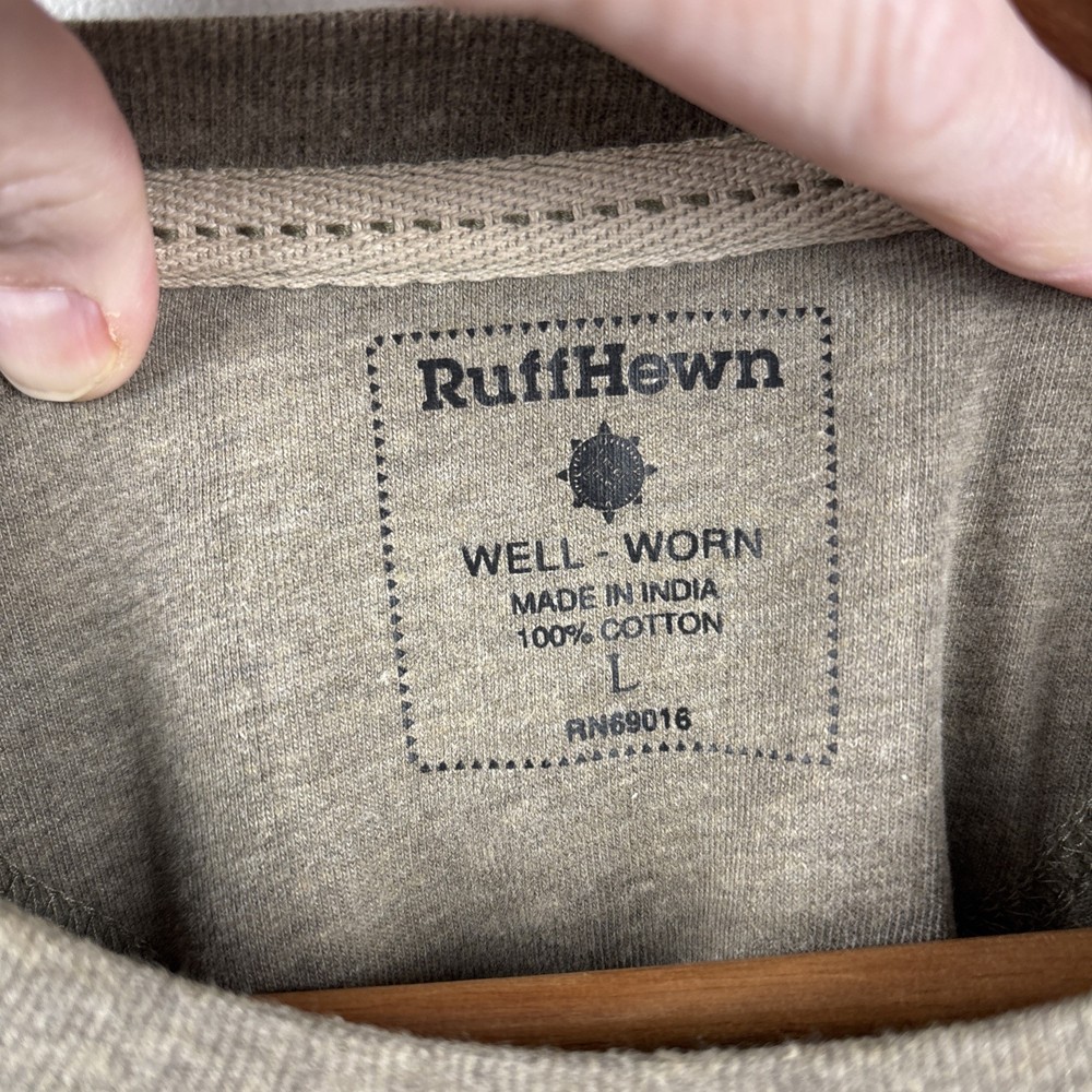 Ruff Hewn T Shirt Mens Large Brown Short Sleeve Cotton Super Soft Classic Tee Super nice and soft shirt Nice brown color Excellent used condition. see photos No significant snags, tears or stains Size. Large Chest width pit to pit 22” Length collar to hem. 27” Sleeve length short Ships fast via USPS