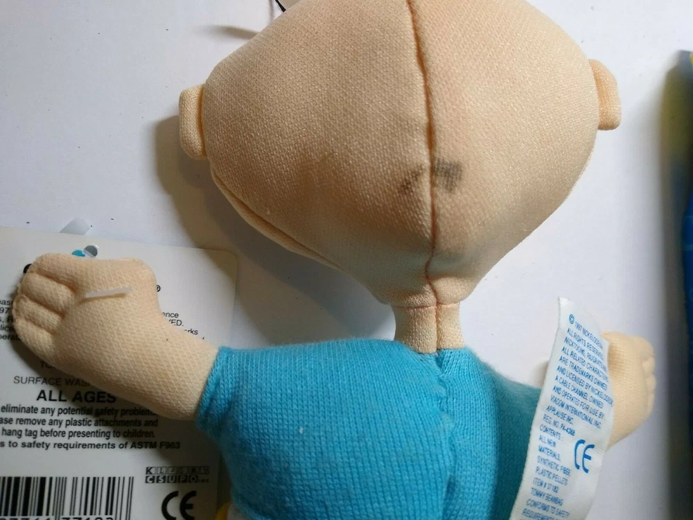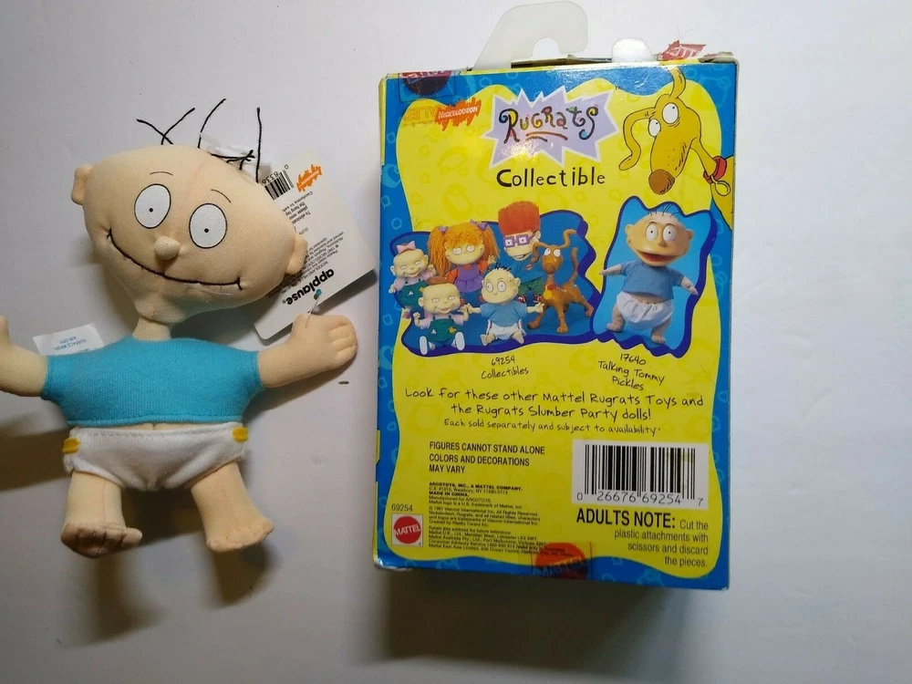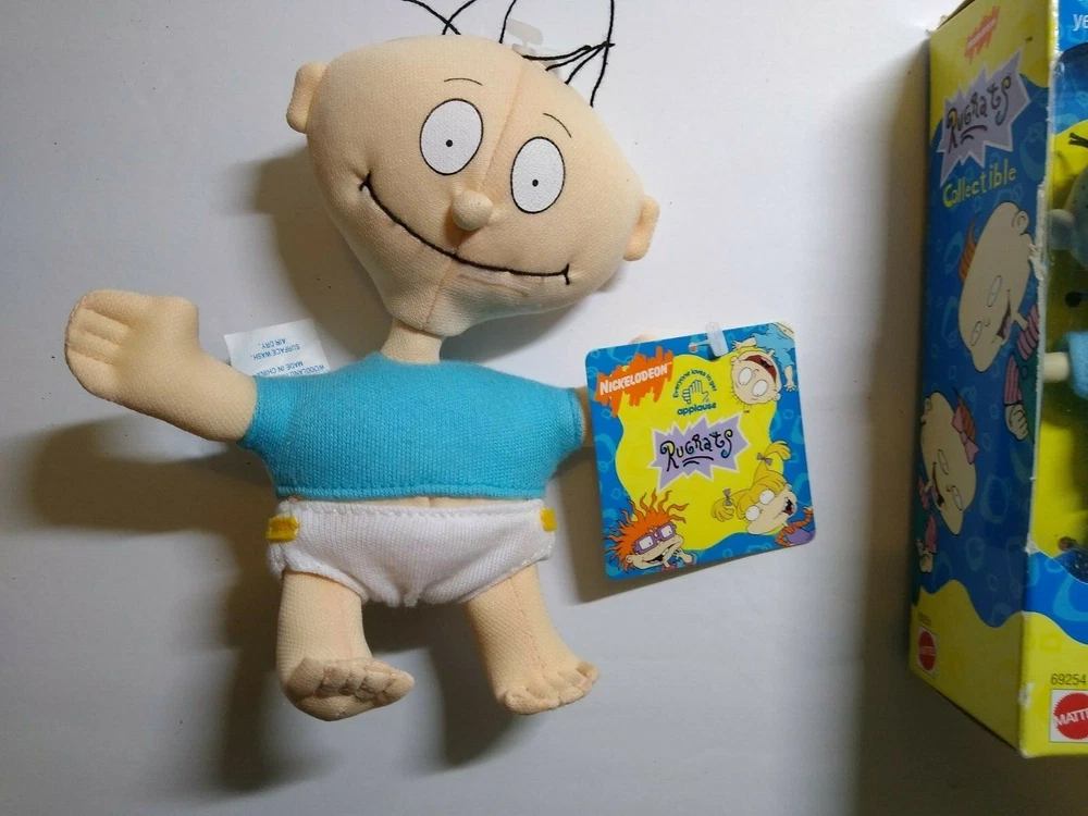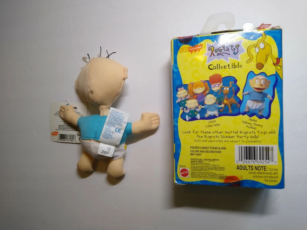 This is a set of two Rugrats plush figures from Mattel, featuring Tommy in his iconic blue shirt and red shorts, and a cute baby animal friend. The figures are still in their original packaging with tags from 1997, making them a great addition to any collection. The colors are vibrant and the attention to detail is impressive, capturing the spirit of the beloved Nickelodeon cartoon. These figures are perfect for fans of all ages and would make an excellent Christmas gift. Set of (2) items. (1) boxed vintage 1997 Rugrat collectible Tommy figure. And (1) Tommy plush figure with tags. Official Nickelodeon items made by Applause. This item has a dark spot of back as shown. Otherwise nice with hang tag. 6.5" tall. The boxed figure has lots of age wear with crushes, dings, sticker wear, creases, and some torn areas. 6.25" tall. Still has the plastic hanger on top with two of the three official tape seals in place so it was never opened. More vintage collectible items for sale in our store. Please review all the photos. Thank you.