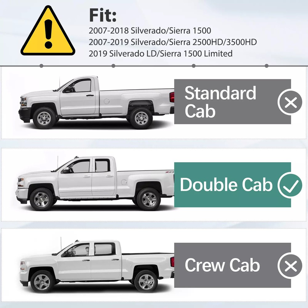 Running Board for 07-18 Silverado/Sierra 1500 Double/Extended Cab Step Side Bar Compatible with: 2007-2018 Chevy Silverado 1500 Double/Extended Cab 2007-2018 GMC Sierra 1500 Double/Extended Cab 2019 Chevy Silverado 1500 LD Double/Extended Cab 2019 Chevy Sierra 1500 Limited Double/Extended Cab 2007-2019 Chevy Silverado 2500/3500 Double/Extended Cab 2007-2019 GMC Sierra 2500/3500 Double/Extended Cab Features: Easy, No-Drill Installation Bolts Right To Factory Mounting Points In Less Than An Hour (Most Models) Designed with 4" drop & 4.8" width step pads can help the elderly, children and women get in and out of the car safely and easily; Running boards will also protect doors and side panels by deflecting road debris kicked up by wheels; Stylish Look- Built for prestige and elegance; Along with the pleasing aesthetic; Fine textured powder coating offers exceptional rust and corrosion resistance; Heavy duty steel frame handles more than 500 LBS load capacity. Packing: 2 x Running Boards 1 x All accessories package kit Note: Any questions, please email us freely About us WANGXIAUTO specializes in providing premium automotive exterior accessories, including spoilers, wings, taillights, and pedals. With rigorous quality control and a focus on material integrity and durability, we ensure every product meets high standards of craftsmanship and compatibility. Customer-centric at our core, we offer expert purchasing support and reliable after-sales service to help every car owner achieve a safe and satisfying vehicle upgrade. Delivery details We ship all orders to the United States via FedEx Ground or Home Delivery. Please provide a physical street address for delivery, as FedEx cannot deliver to PO Boxes. Typical delivery time is 1-6 business days. For sales tax, eBay collects and remits applicable state sales tax for all U.S. orders in accordance with local regulations. For more details, please refer to eBay's help article "Taxes and import charges". Return details We offer a straightforward 90-day return policy from the date of purchase. Should you need to initiate a return or refund, please contact our customer service team within 5 business days of receiving the item. To help us assist you promptly, kindly provide a detailed description of the issue along with supporting photographs for verification. If the item is returned in its original, unused condition, you will receive a full refund with no restocking fees. Should your item arrive incorrect, damaged, or not as described, please contact us immediately. Our team is committed to working with you to promptly resolve any issues and ensure your complete satisfaction. Before completing your order, we strongly recommend confirming all item specifications to ensure compatibility with your vehicle. Our customer service team is available to assist with any product selection questions. Feedback If you're satisfied with your purchase, we'd be grateful if you could take a moment to leave us positive feedback - your support is very important to us! Please contact us before leaving neutral (3-star) or negative (1-2 star) feedback.We'll actively work to address the problem and strive to ensure your satisfaction. Contact us Our working hours are: US Eastern Standard Time | Sunday to Thursday | 21:00 pm to 7:00 am Orders and emails will be processed for you during this time, any questions you can leave a message to us, if we do not have the first time to give you an answer, we hope you can understand, we will be the first time to deal with your problems first when we are at work.