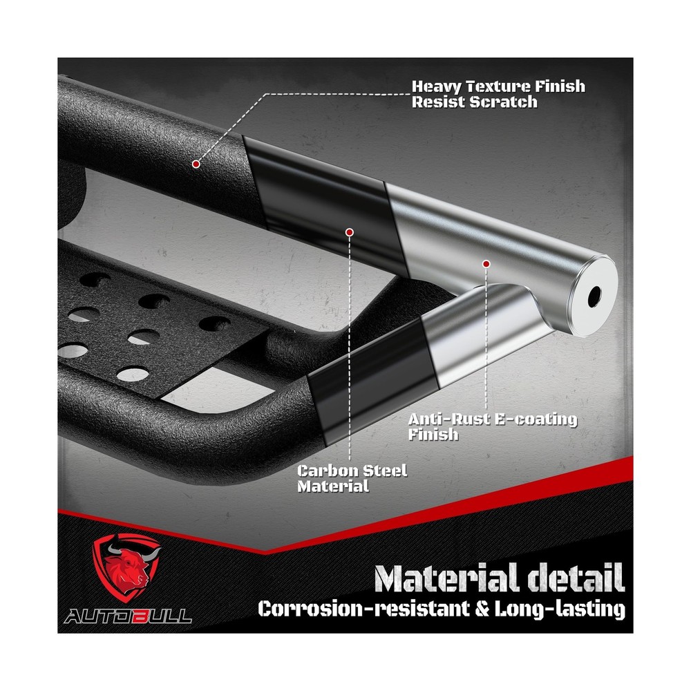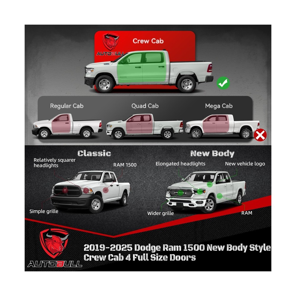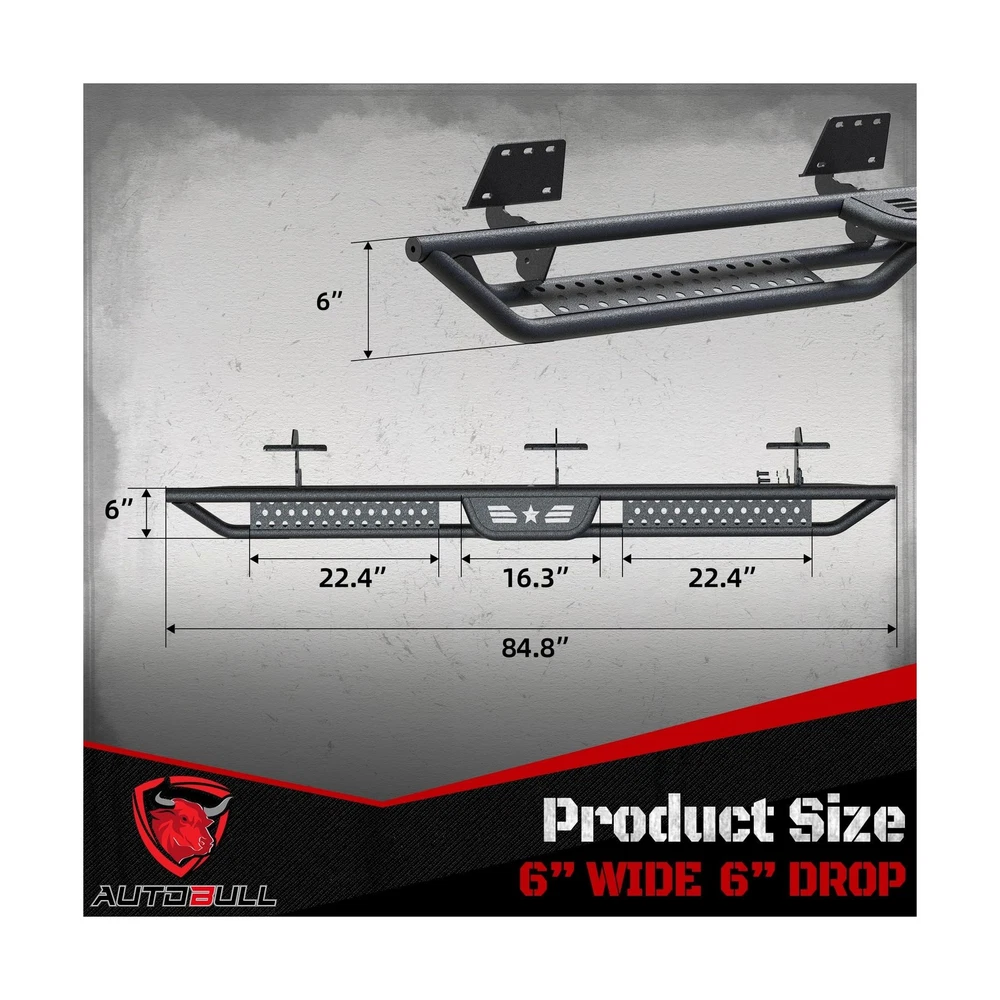 Running Boards Compatible with 2019-2025 Dodge Ram 1500 New Body Style Crew Cab 4 Full Size Doors, 6" 2-Stairs Side Step Rails Coated Black Carbon Steel Nerf Bars Description Features: Fitment:AutoBull running boards feature a distinct drop-down step design thats custom made for 2019-2025 Dodge Ram 1500 New Body Style Crew Cab 4 Full Size Doors only. Please check the cab picture in the listing before ordering. Functionality: The two stairs design provides easy access to your vehicle, making it easier to get in and out of the car, especially for children or elderly individuals. Safety: AutoBull side steps offer an extra step and secure footing when entering or exiting your vehicle, reducing the risk of slipping or falling. Protection: Our running boards help to protect your vehicle's exterior from scratches, dings, and other damages that can occur from debris or minor accidents. Style: The unique two stairs design adds a sleek and modern look to your vehicle, enhancing its appearance and making it stand out on the road. Durability: Constructed with 2 layers coated carbon steel and are designed to withstand various weather conditions and everyday wear and tear, ensuring long-lasting performance. What you get:A pair of side steps, including right and left side. 36 months warranty. Product Details: Color: Carbon Steel-star-black Brand: AutoBull Material: Carbon Steel Exterior Finish: Black Powder Coated Item dimensions L x W x H: 87.01 x 15.16 x 7.09 inches Vehicle Service Type: 2019-2025 Dodge Ram 1500 New Body Style Crew Cab 4 Full Size Doors Item Weight: 75.7 Pounds Automotive Fit Type: Vehicle Specific Fit Manufacturer: AutoBull Color: Carbon Steel-star-black Brand: AutoBull Material: Carbon Steel Exterior Finish: Black Powder Coated Item dimensions L x W x H: 87.01 x 15.16 x 7.09 inches Vehicle Service Type: 2019-2025 Dodge Ram 1500 New Body Style Crew Cab 4 Full Size Doors Item Weight: 75.7 Pounds Automotive Fit Type: Vehicle Specific Fit Manufacturer: AutoBull Model: 2019-2025 Dodge Ram 1500 New Body Style Crew Cab 4 Full Size Doors Item Weight: 75.7 pounds Product Dimensions: 87.01 x 15.16 x 7.09 inches Item model number: ABSS-0019 Manufacturer Part Number: ABSS-0019-FBA Date First Available: August 13, 2024 Delivery We Do Not Ship Outside of the Continental US. Return Policy All items qualify for returns within 30 days of receipt. Buyer is responsible for return shipping on any item that is not damaged. Feedback We take our reputation seriously, we buy and sell online, so we understand the value of trust. If you are unsatisfied with your order, please contact us and we will work with you to resolve it to your satisfaction.