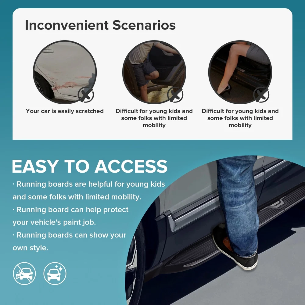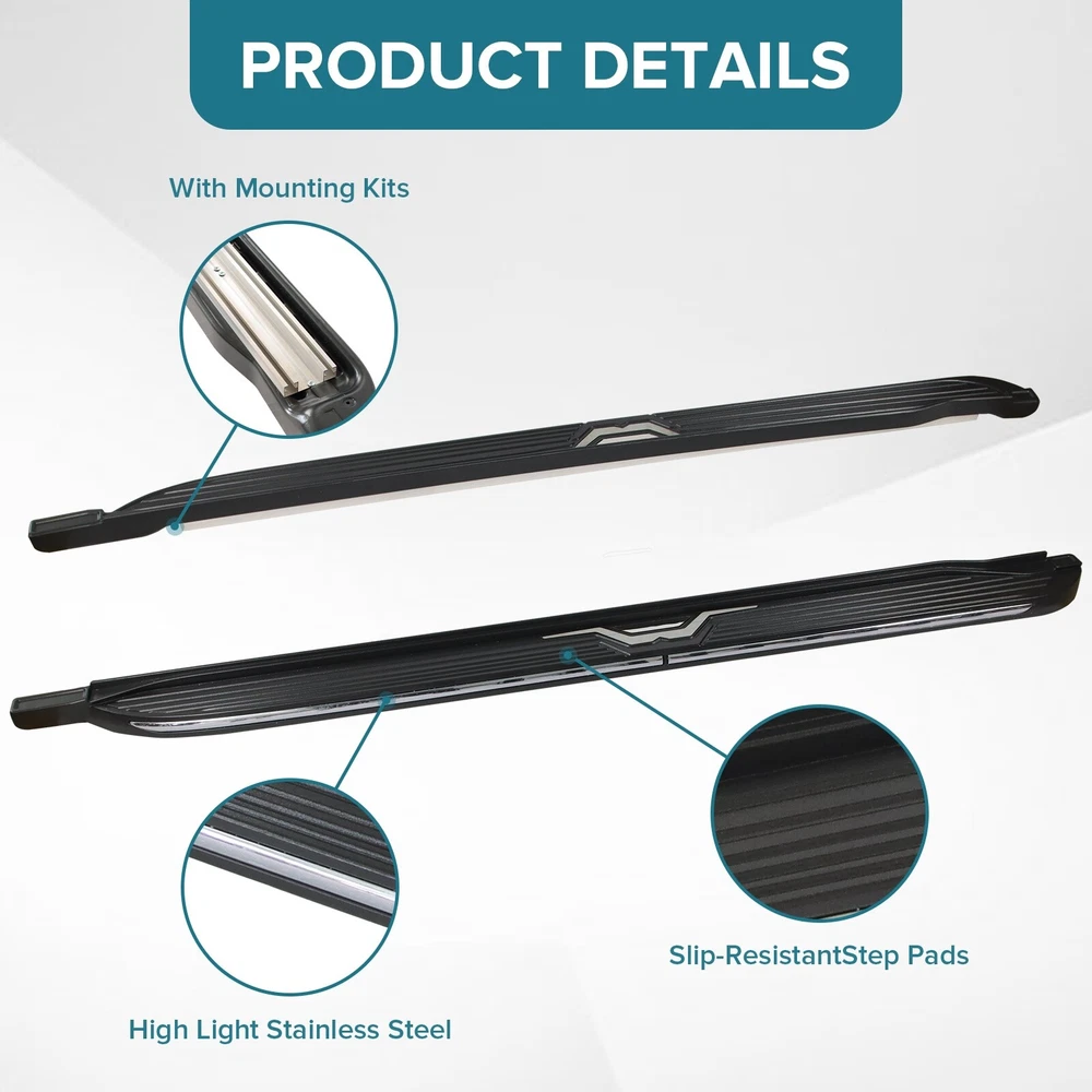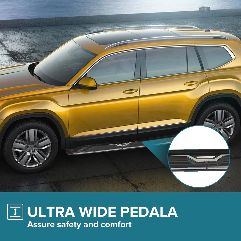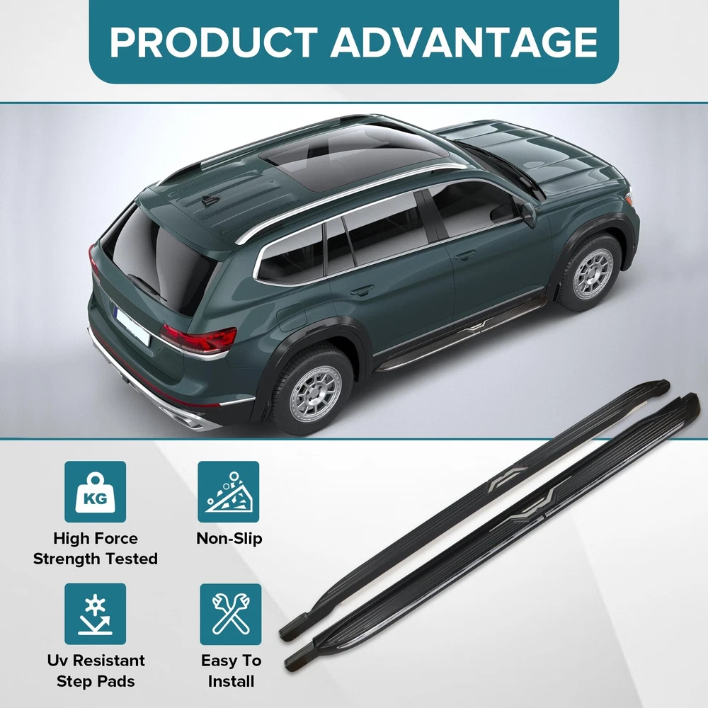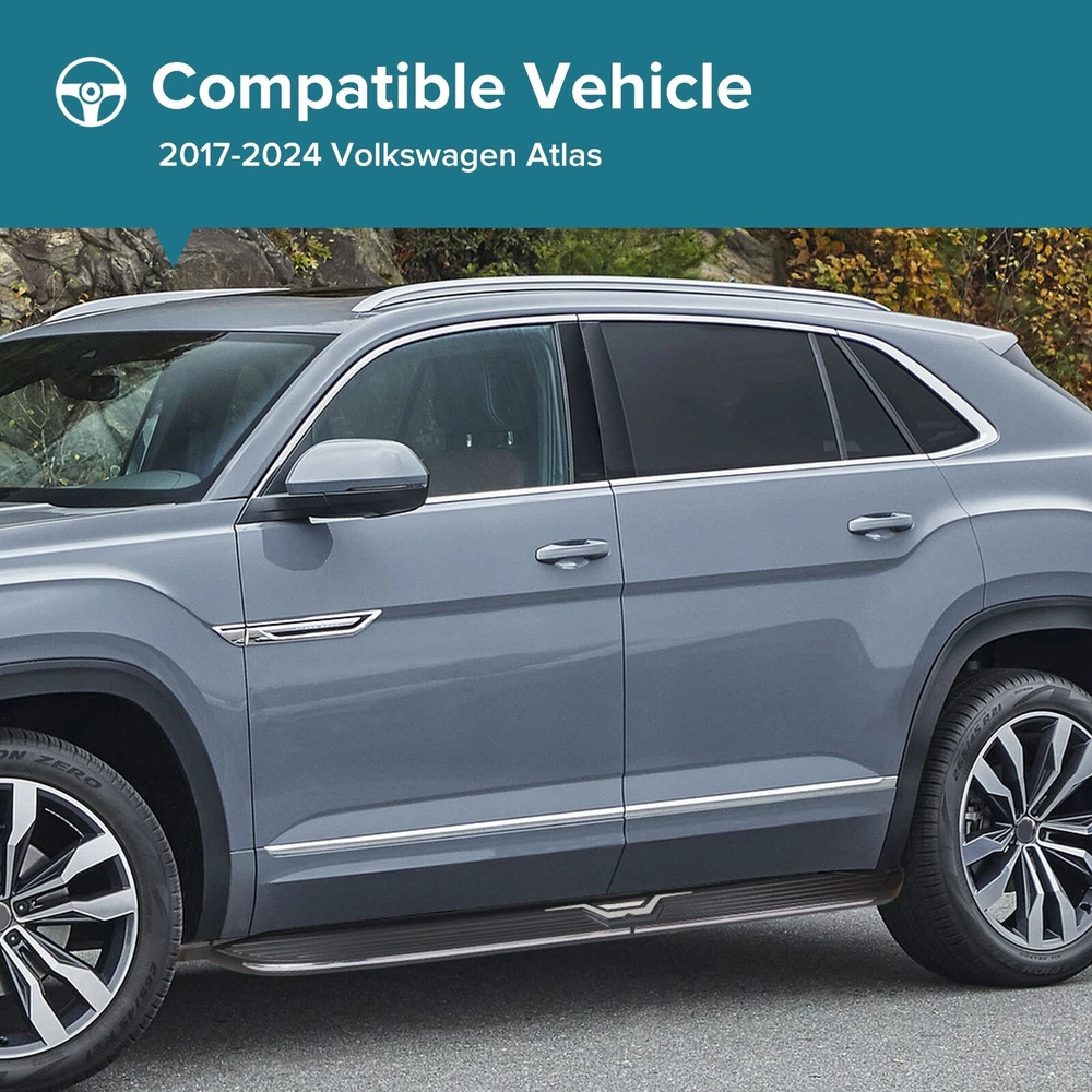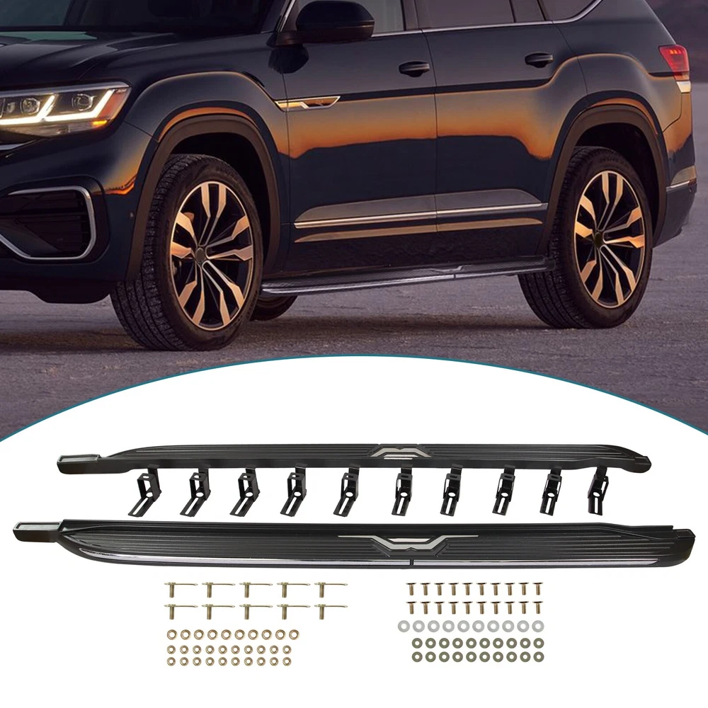 Specification Color: Black+silver Type: Step Nerf Bar Placement on Vehicle: Left, Right Fitment Type: Performance/Custom Material: Stainless Steel,ABS Shape: Rectangular Mounting Hardware Included: YES Package Size: 85.43*9.65*6.69 Package Weight: 31.75 Fitment 2018-2024 Volkswagen Atlas Features & Benefits 1. PREMIUM QUALITY MATERIAL: The Running Boards are constructed from aircraft grade extruded value Stainless Steel. This high-quality build ensures rust-resistance and the ability to support up to 500lbs, promising a long-lasting performance. 2. EASY INSTALLATION: The package includes all necessary mounting parts and an installation instruction manual. Designed to fit seamlessly into your VW Volkswagen Atlas 2018-2022 2023 2024's existing mounting points, these side steps require no drilling, making the installation process smooth and hassle-free. 3. SAFETY-ORIENTED DESIGN: The Running Boards feature a slip-proof step pad, ensuring secure and easy access into and out of the vehicle for you, your family, and friends. 4. VERSATILE APPLICATION: These Running Boards are not just functional but also add a stylish touch to your VW Volkswagen Atlas. Suitable for models from 2018 to 2024, they serve as a valuable addition to your vehicle. On Nov 19, 2024 at 01:36:25 PST, seller added the following information: On Nov 22, 2024 at 02:00:46 PST, seller added the following information:
