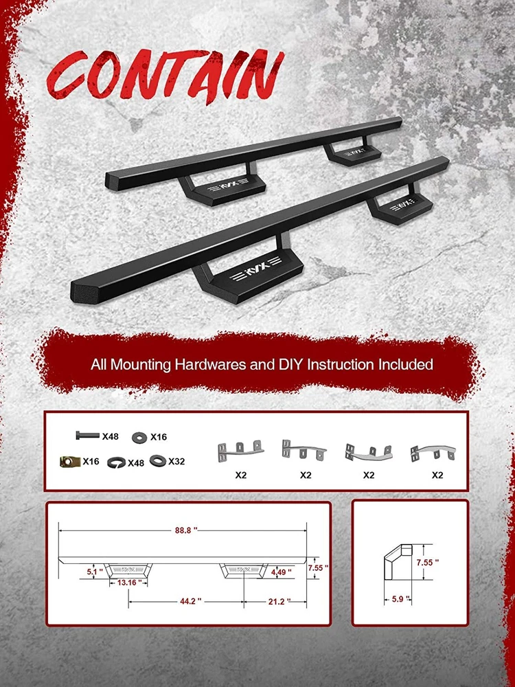 You may like (2)Running Board 6" Bars Side Step for 2007-2018 Chevy Silverado 1500 Crew Cab USD183.99 2pc Aluminum Running Boards New For 2016-2021 Honda Pilot Side Step USD106.99 Running Boards Side Steps Bars For 2019-20 Jeep Gladiator JT 4 Door 3.6L USD119.99 6" Running Board Nerf Bar Side Steps For 2018-2023 Jeep Wrangler JL 4-Door 2Pcs USD158.99 Running Boards For 2014-2019 Toyota Highlander Side Steps 2pcs USD107.99 DURABLE & BRAND NEW US WAREHOUSE FAST & FREE SHIPPING LIFETIME WARRANTY Feature FITS PERFECTLY: Compatible with 2019 2020 2021 2022 2023 For Chevy Silverado/For GMC Sierra 1500/2500/3500 Crew Cab and Dress up your vehicle (Please check the cab size before purchase) PATENTED DESIGN: Exclusive design provides an extraordinary appearance for your vehicle and convenience for getting on/off the car with an extra step area and proper ground clearance UP TO 500Lbs STABILITY: With Top-Grade Steel, KYX Running Boards can easily provide extra protection for the car side and safety protection for your family to get on/off EASY 1-HOUR INSTALLATION: 100% bolt-on design, no drilling needed, can be easily installed at home using common garage tools. All mounting hardware and instruction are included 5-YEAR DURABILITY: With seamless welding high-grade sturdy steel, powder-coated surface and slip-resistant design, features rust- and slip-resistance, which ensures a super long lifespan Fitment 2019-2023 For Chevy Silverado 1500/ For GMC Sierra 1500 Crew Cab /2500 HD 3500 HDCrew Cab (Excl. 2019 Silverado Sierra 1500 LD) SPECIFICATIONS: Material: Q235A Color: Black Powder Coated CONTENTS IN THE BOX: 2 * KYX 2019 2020 2021 2022 2023 For Chevy Silverado/For GMC Sierra 1500/2500/3500 Crew Cab Running Boards 1 * Mounting Hardware Set 1 * Installation Manual MAINTENANCE TIPS: 1.To protect your investment, we recommend waxing this product after installation and at regular intervals thereafter to add a protective layer and prolong lifespan. Do not use products that may contain abrasives that could damage the finish of the Silveardo Side Steps. 2.Aluminum polish may be used for stainless steel to polish small scratches and scuffs on the finish, and a mild soap may be used also to clean the Nerf Bars. For gloss black finishes, mild soap only may be used to clean the Side Bars. WATERPROOF SILVERADO NERF BARS The high-quality steel silveardo running board has a textured black powder-coated finish. Waterproof, dustproof, and rust-proof, to ensure the dry and non-slip side treads, and extend the service life of the board even under the harshest conditions. RUSTPROOF DOOR STEP RAILS KYX For Chevy Silverado Nerf Bars are made of carbon structural steel Q235A, which has strong impact resistance; using pickling and electrophoresis processes, it can effectively achieve dual protection of rust and scratch resistance, and has real off-road practicability. PATENTED RUNNING BOARDS This silveardo side bar, designed in the United States, is the latest step bars from KYX, and provides your vehicles with rugged protection. KYX For Chevy Silverado Step Rails have independent design and appearance patents, which make the truck boards more concise and unique. IMPACT-RESISTANT SIDE STEPS While meeting the 500LBS load-bearing capacity, KYX nerf bars offer the best in collision protection with durability. 100% welded construction creates a true 1-piece assembly that allows for the ultimate in strength and rigidity. and provides extra side protection to the vehicle. Payment Shipping Return Policy Contact Us Important Points 1) we accepts all major credit cards via PayPal: MasterCard, Visa, American Express and Discover. 2) We will only ship to the confirmed PayPal shipping address given with the payment. Please make sure your PayPal and eBay address is correct. If not, please correct it before payment. Thank you. 3) If you want to ship to another address, please change your PayPal shipping address before you make payment. 4) To avoid initiating an unpaid item claim, please pay within 7 days. 5) Custom duties, taxes, or charges are not included in the cost you pay to us. We only ship this item to United States ! 1. We ship to your eBay address. Each package will be shipped by UPS or Fedex with tracking number. 2. Ship within 1 business day once payment completed. Orders placed on weekend will be shipped within 3 days. 4. Seriously promise: Refund or resend will be offered if item still not arrive in 7-10 business days. Just send us an email ,we will give you a satisfied solution as soon as possible. If you send us an e-mail, it will be answered within 48 hours during our working hours. Please feel free to contact us if you have any questions: Dear my friend,we appreciate your support.And our goal is service you well and give you a pleasant shopping time in our store. ✅Dear customer, when you want to return or exchange goods (Please contact us first, instead of directly initiating a dispute) 1: Contact the seller first 2: Send pictures: outer packaging&scanned labels&item itself&with complete accessories, etc necessary condition Rule A: The original packaging of the item is in an unused state. Rule B: The outer packaging must not have any damage. 3: Obtain return label 4: Delivered Projects - Payment Repayment ✅A 15% restocking and shelving fee will be charged for returns or exchanges that are not caused by the seller and are in good condition. Exchange will not charge restocking fees or shipping fees due to transportation errors ✅Priority In case of the following reasons, the freight will be borne by the buyer 1: Unexpected order 2: Find a better price 3: Change your mind 4: Buy more items/make mistakes/misread model information ✅Please note Missing accessories/quality issues/transportation damage, etc Please contact us first to obtain a good solution, rather than directly opening a return dispute. Thank you very much for your understanding. I hope we have a pleasant cooperation! Contact us if you have any question