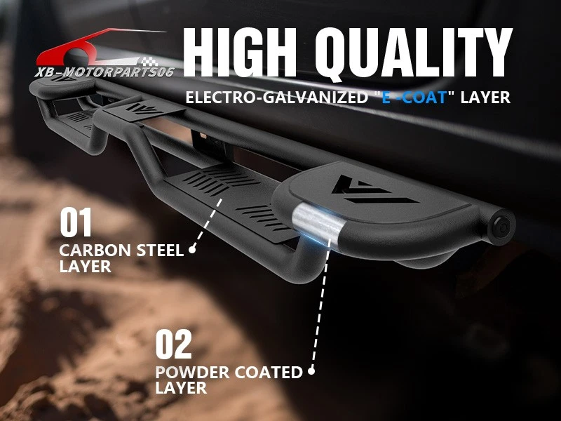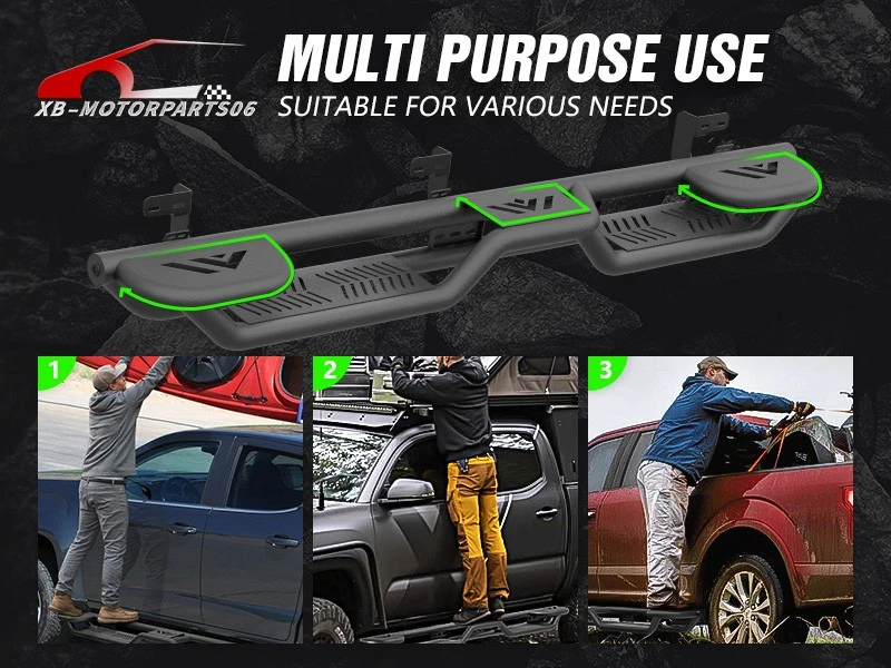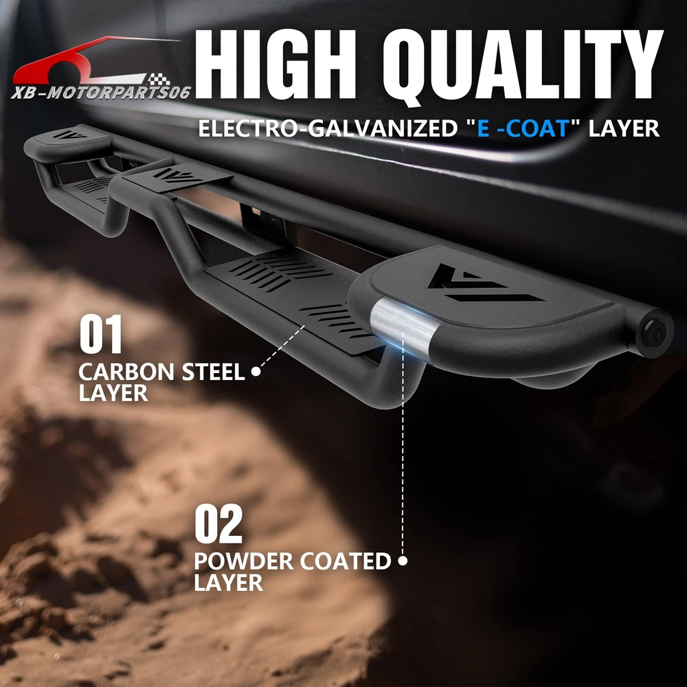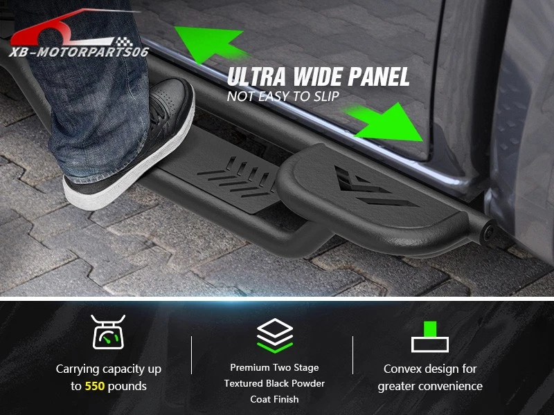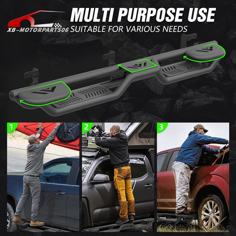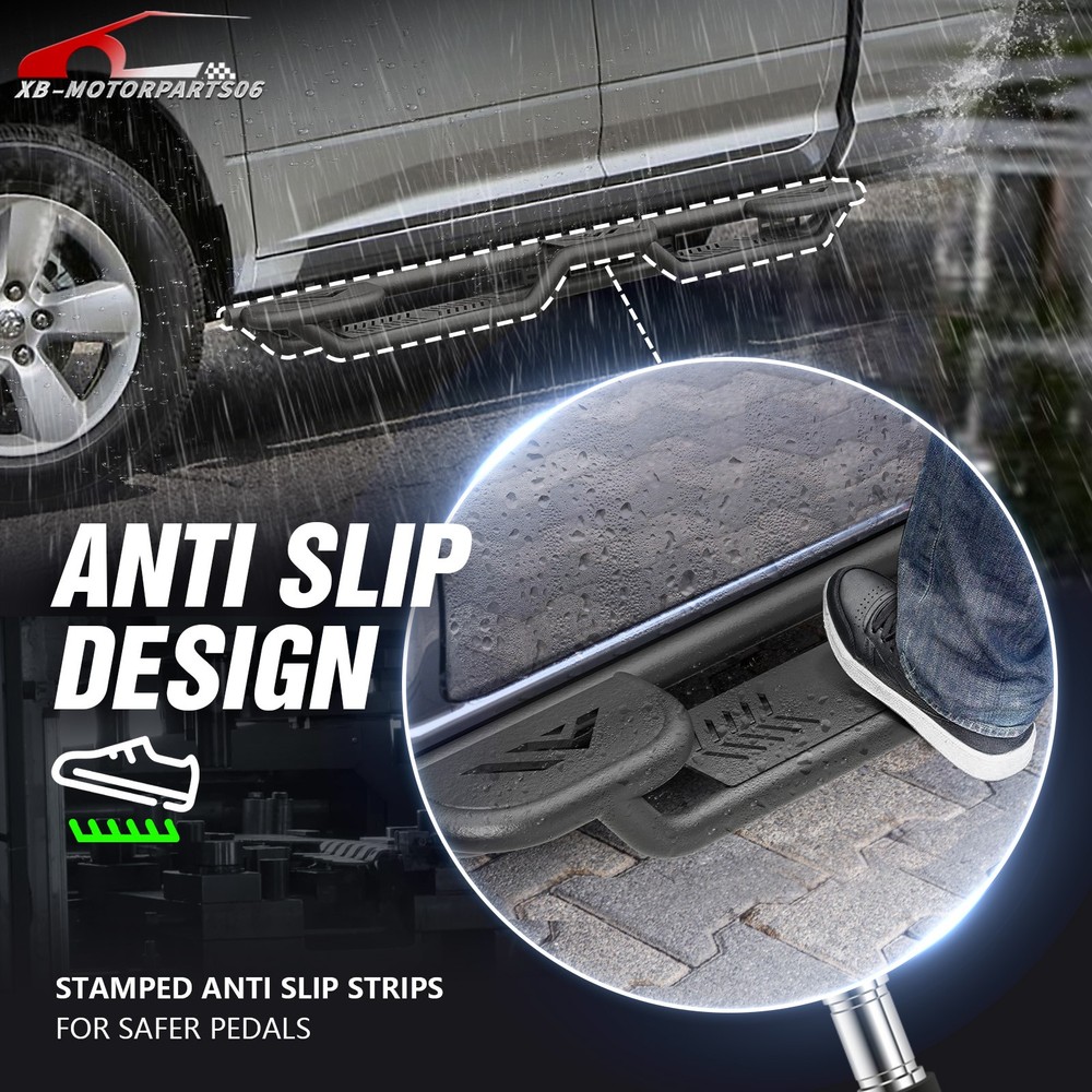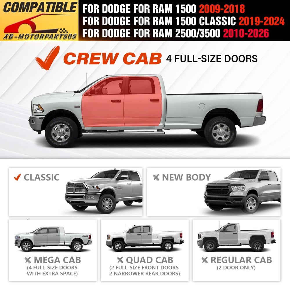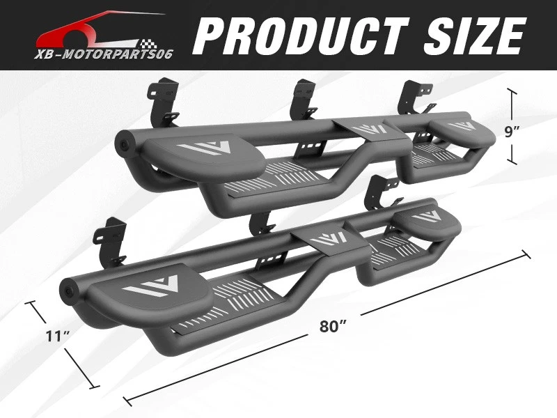 Running Boards For 2009-2018 Ram 1500 & 2010-2026 Ram 2500&3500 Crew Cab Suitable Models : Compatible with 2009-2018 Dodge Ram 1500 Crew Cab, 2019-2024 Ram 1500 Classic, 2010-2026 Ram 2500 & 3500 Crew Cab (4 Full-Size Doors) Package Includes : 2 x Running Boards Side Steps, brackets, instructions, and all necessary hardware Product Information : Product Dimensions: 80 x 11 x 9 inches Installation mode: Bolt-On Weight Limit: 550LBS Placement on Vehicle: Left and Right Item Weight: 79.77 pounds Material: Carbon Steel Color: Black (hand measurements may have an error of 2-3 mm/0.078-0.118 in) Feature: ① Three Raised Steps for easy access to the roof, allowing multiple users to work on the vehicle simultaneously; ② Dual-layer Layout provides enhanced convenience for vehicles equipped with lift kits and oversized tires, offering easier access to the roof while maintaining sufficient ground clearance; ③ The high-quality black powder coating provides outstanding rust and corrosion resistance. Constructed from heavy-duty 2mm carbon steel, each side can withstand a weight of 550 pounds. Precision laser cutting and stamping techniques contribute to a non-slip step surface and enhanced traction; Warranty Period : 2 year Standard Shipping (FedEx Ground or FedEx Home Delivery) Will usually ship within 3 business days of receiving cleared payment Suitable Models : Compatible with 2009-2018 Dodge Ram 1500 Crew Cab, 2019-2024 Ram 1500 Classic, 2010-2026 Ram 2500 & 3500 Crew Cab (4 Full-Size Doors) Package Includes : 2 x Running Boards Side Steps, brackets, instructions, and all necessary hardware Product Information : Product Dimensions: 80 x 11 x 9 inches Installation mode: Bolt-On Weight Limit: 550LBS Placement on Vehicle: Left and Right Item Weight: 79.77 pounds Material: Carbon Steel Color: Black (hand measurements may have an error of 2-3 mm/0.078-0.118 in) Feature: ① Three Raised Steps for easy access to the roof, allowing multiple users to work on the vehicle simultaneously; ② Dual-layer Layout provides enhanced convenience for vehicles equipped with lift kits and oversized tires, offering easier access to the roof while maintaining sufficient ground clearance; ③ The high-quality black powder coating provides outstanding rust and corrosion resistance. Constructed from heavy-duty 2mm carbon steel, each side can withstand a weight of 550 pounds. Precision laser cutting and stamping techniques contribute to a non-slip step surface and enhanced traction; Warranty Period : 2 year
