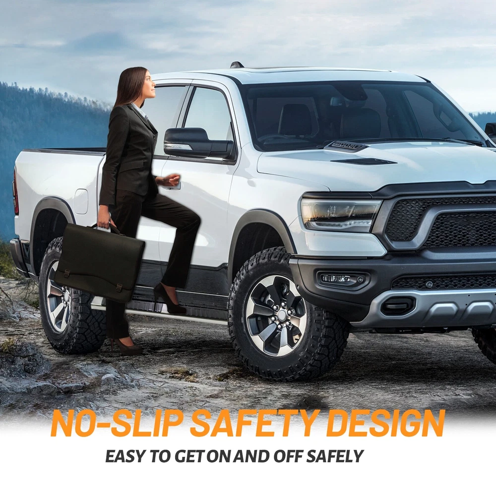 Specification Placement on Vehicle: Left+Right Material: Stainless Steel,ABS Only Fit: Quad Cab Item Weight(lbs): 45.19 Package Dimensions(LengthxWidthxHeight:inch): 79.53x9.45x8.66 Package Weight(lbs): 47.4 Condition: New Vehicle Service Type: Truck Style: OE Style Installation Instruction: Not Included Fitment Type: Direct Replacement Manufacturer Warranty: 1 Year Color: Black, Silver Package Include: 1x Pair of Running Boards (Left + Right) Brackets on Each Side Mounting Hardware Sealing End Cover: Yes Tread(inch):6 " Fitment 2019-2024 Dodge Ram 1500 Quad Cab/Extended Cab (Only fit new body,do not fit classic.) Description 1. Made with durable, heavy-duty high light stainless steel and ABS plastic. Seamless joined ABS plastic tread with powder coated body surface to achieve great UV rays, rust, and slippery resistance. 2. Our running boards are made from the finest aluminum alloy, which is sturdy, durable, wear-resistant and rust-resistant. After repeated tests, they can resist the corrosion of salt spray, and withstand UV radiation without discoloration. 3. To a certain extent, they also help protect the paint on the side of the car from being scratched. At the same time, you can easily reach the top of your car when you need it, such as accessing the luggage rack or cleaning the rooftop. 4. Slider Design, Able to adjust position on vehicle forward & backwards for better customization. the whole closed end design make your running board inside clean. 5. Whatever finish you choose, the result is a smooth, finished look that complements your factory chrome and trim perfectly. 6. Running Boards & Side Steps make your life safe and simple for taking your coworkers to the job place, take your pets go out or carpooling the kids to school both. You have a very solid under foot feeling thanks to the Anti-slip tread surface and rugged construction. 7. Easy bolt-on installation: No cutting or drilling. On Nov 18, 2024 at 05:36:27 PST, seller added the following information: On Nov 22, 2024 at 02:00:55 PST, seller added the following information: