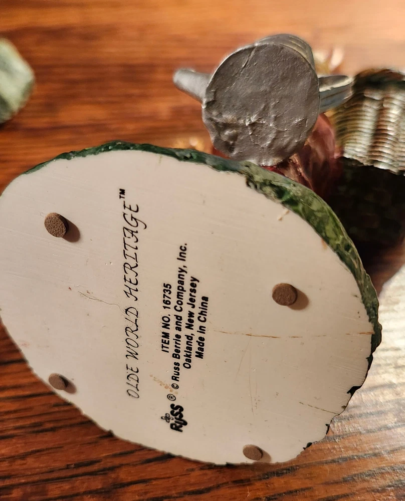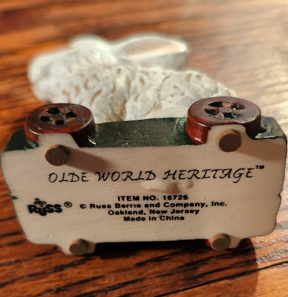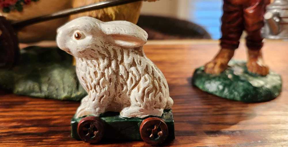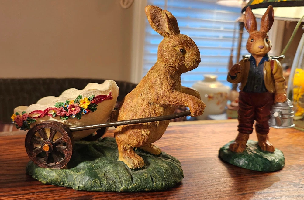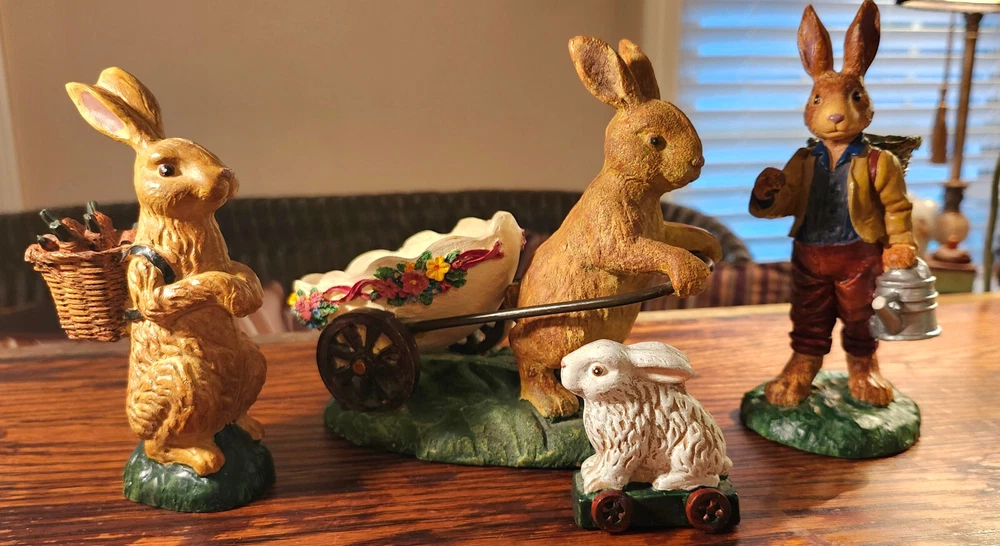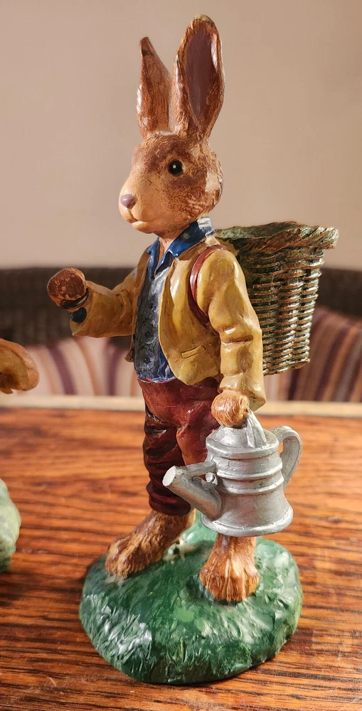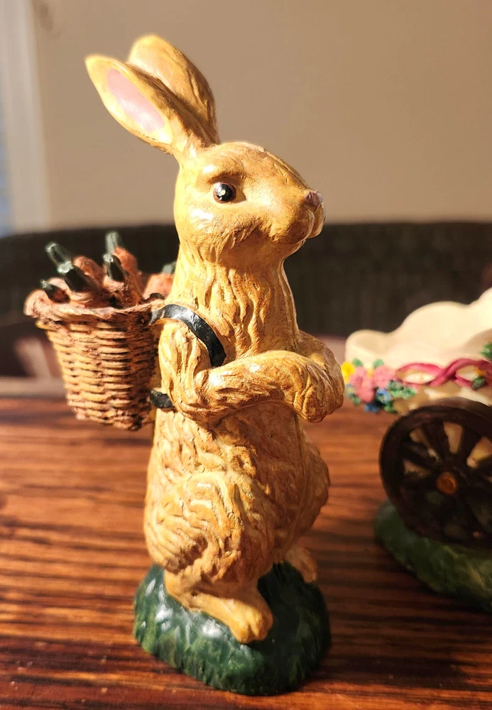 Russ Berrie "Olde World Heritage" Series! Lot of 4 Rabbits Bunnies Figurines: 16737- Bunny pulling Egg Basket 7.25" x 6" 16735- Bunny with Basket & Watering Can 6.75" x 2.75" (TOP OF WATERING CAN IS BROKEN) 16733- Bunny with backpack Basket of Carrots 5.25" x 1.75" 16726- Small White Bunny on Skateboard 2.25" x 2.25"