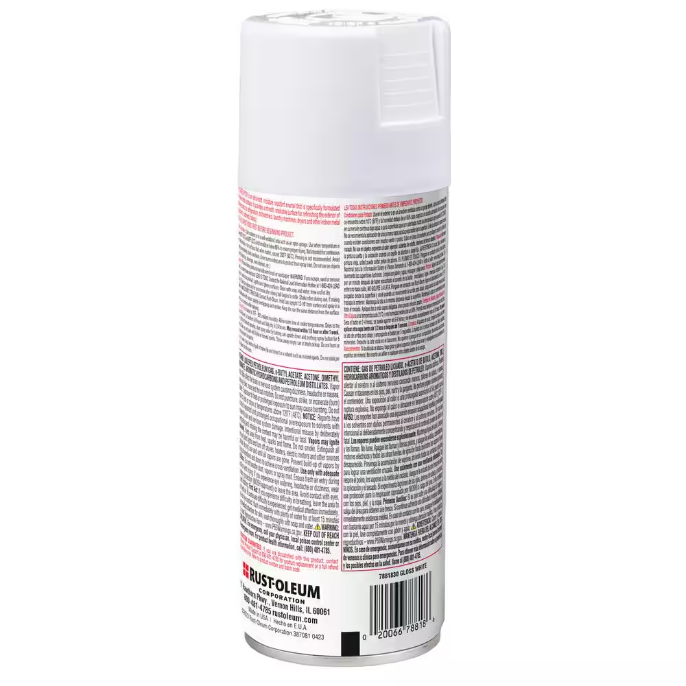 Rust Oleum 12 Oz. Appliance Epoxy Gloss White Spray Paint 6 Pack Rust-Oleum Specialty 12 oz. Epoxy Gloss White Appliance Spray Paint (6 Pack) is specifically formulated for use on indoor metal surfaces. It comes in a glossy color that provides a smooth, washable surface for appliances, such as refrigerators, dishwashers, laundry machines and more. The epoxy dries to the touch in 2 hours for use indoors and the 12 oz. can works on areas up to 15 sq. ft. Tough, durable epoxy coating is formulated for the special needs of appliances, cabinets and other indoor metal applications, for use on indoor metal surfaces Superior abrasion and scratch-resistance Washable and moisture resistant finish and dries to the touch in as little as 2 hours One 12 oz. can provides up to 15 sq. ft. of coverage; no primer needed for application Gloss finish Self-leveling formula for a smooth, factory-like finish Provides a washable, moisture-resistant surface Clean up with mineral spirits