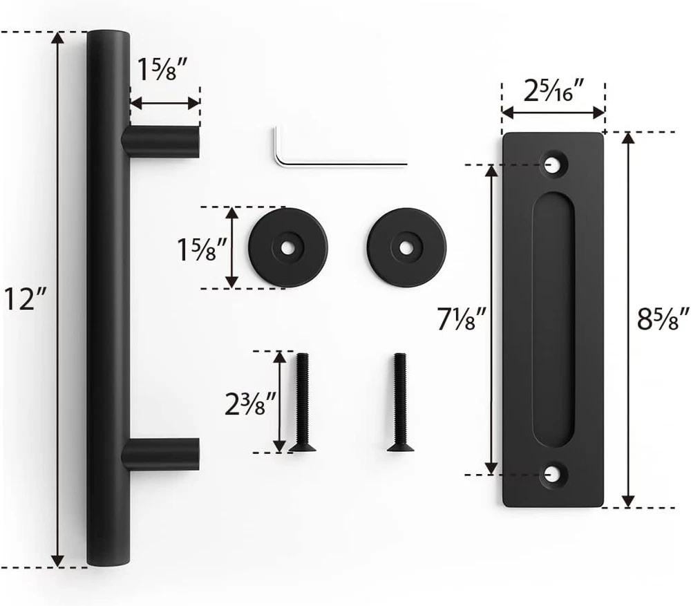 Easy to Install: The SMARTSTANDARD Heavy Duty Barn Door Handle Set comes with all the necessary hardware for a straightforward installation on your door. Simply drill two holes to securely attach the handle and finger pull using the provided screws. Finger Pull Size: Dimensions for the finger pull are L 8 5/8 inches x W 2 5/16 inches x H 1/4 inches (depth 1/4 inch). The pull handle measures L 12 inches with a diameter of 1 inch. Versatile Door Panel Compatibility: This handle set is designed for door panels with thicknesses of 3/4 inch to 1-3/4 inches. For thicker doors, longer screws can be purchased separately. If the handle pillar becomes loose or requires removal, a small wrench is included for easy tightening. Wide Application: Ideal for both interior and exterior doors, this handle set can be mounted on a variety of materials including wood, glass, and aluminum. It is suitable for use on doors, gates, garages, barns, sheds, closets, and sliding doors, making it a versatile addition to your home. Package Includes: The set includes 1 finger pull, 1 pull handle, 2 screws (length: 2 3/8 inches), 2 pads (diameter: 1 3/4 inches, thickness: 7/32 inches), and 2 wrenches. Please note that only the hardware is included; the door is not part of the package. Product Description Durable Black Finish The black finish of this handle set is achieved through a burnishing process that provides exceptional corrosion resistance. This protective coating not only enhances the aesthetic appeal but also ensures long-lasting durability, making it an ideal choice for various environments. Enhanced Safety and Security Crafted from high-quality carbon steel, this handle set is designed with both security and durability in mind. The edges are meticulously polished to prevent hand injuries, ensuring that you can use the handle safely and comfortably.