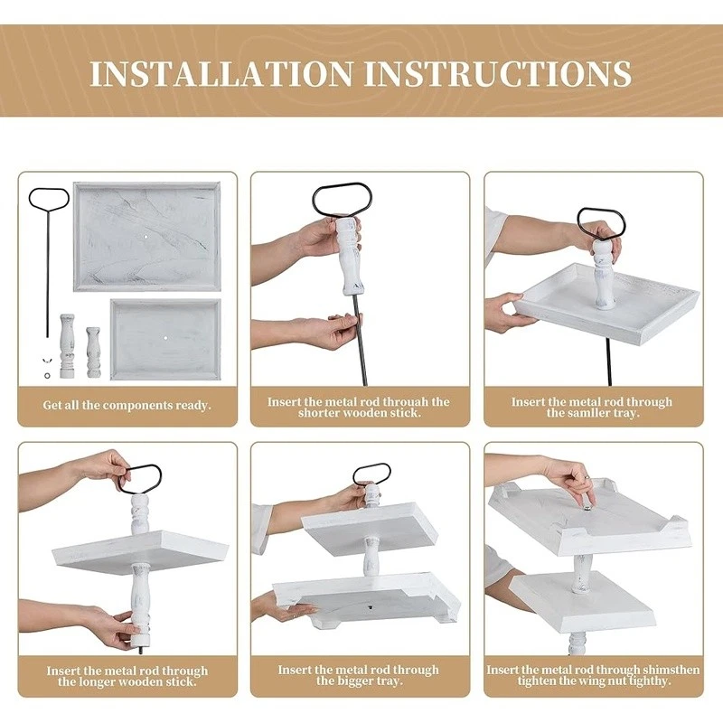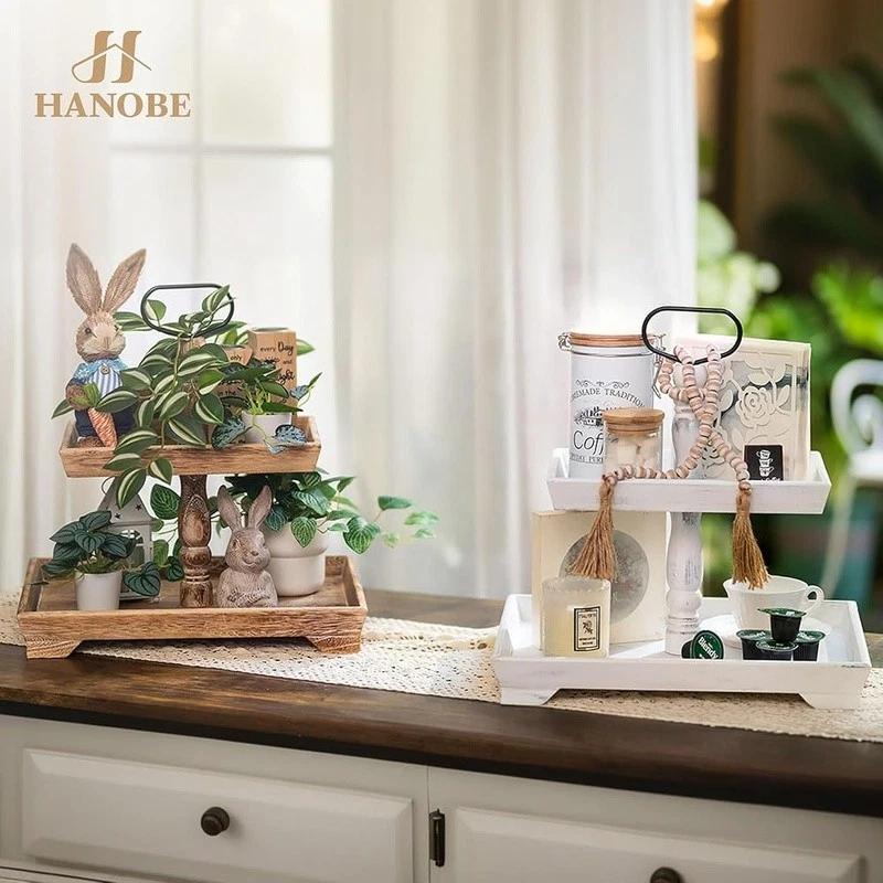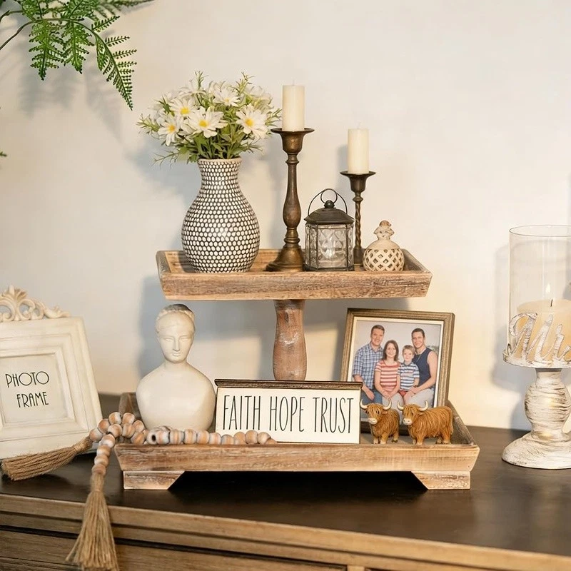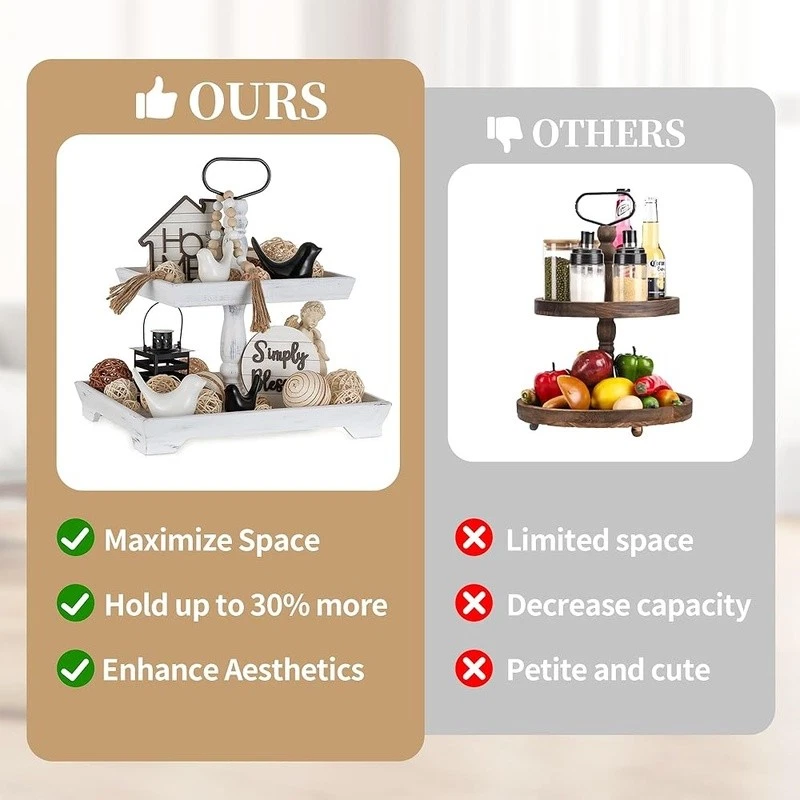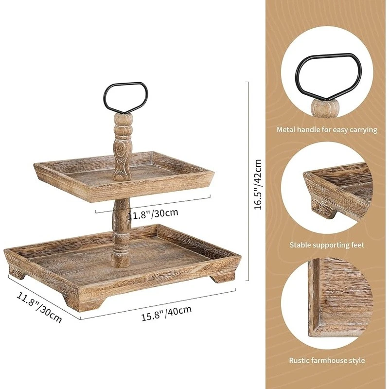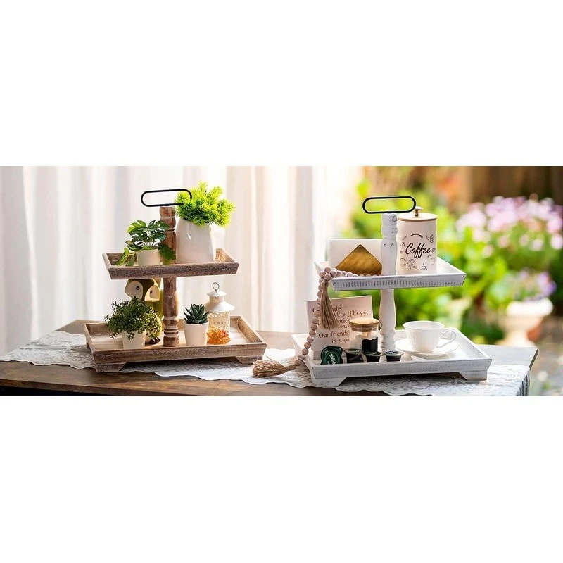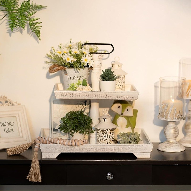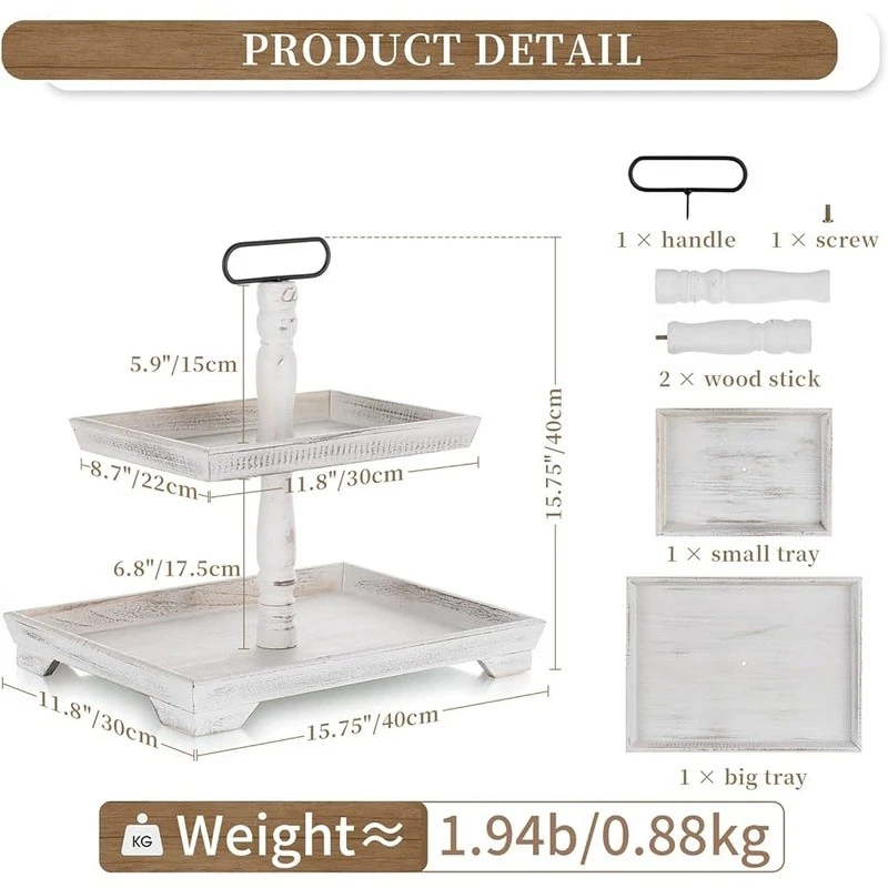 About this item Timeless Farmhouse Elegance : The whitewashed finish of our two-tiered tray serving stand adds a touch of timeless elegance to your home decor. It's the perfect backdrop for displaying cherished items, from cups to candles, plants to picture frames, and everything in between Versatile Celebration Hub : Our 2-tiered tray decor is the heart of every celebration. Whether it's Valentine's Day or Thanksgiving, this farmhouse tiered tray stand is your go-to for seasonal charm. It's the centerpiece that adapts to every festive mood, making your decor pop with rustic appeal Maximize Space, Enhance Aesthetics: The decorative tiered display stand's rectangular design is both space-efficient and aesthetically pleasing. It offers more room for your decor while taking up less counter space. This smart, farmhouse-style stand can hold up to 30% more, making it the perfect addition to any room Perfectly Sized for Display: With dimensions that allow for ample display space, our tray stand ensres that your decor items are the stars of the show. The bottom tray's 15.8"x 11.8" and the top tray's 11.8"x 8.7" provide plenty of room, while the 15.8" height and 7" gap between trays accommodate even taller pieces Rest easy knowing our uwavering commitment to support is just a message away, with a promise to resolve your queries within 24 hours. Purchase with complete confidence! Brand: Color: White Material: Engineered Wood Product Dimensions: 15"L x 12"W x 1.9"H Shape: Rectangular