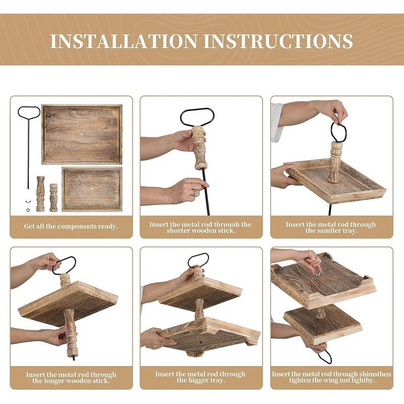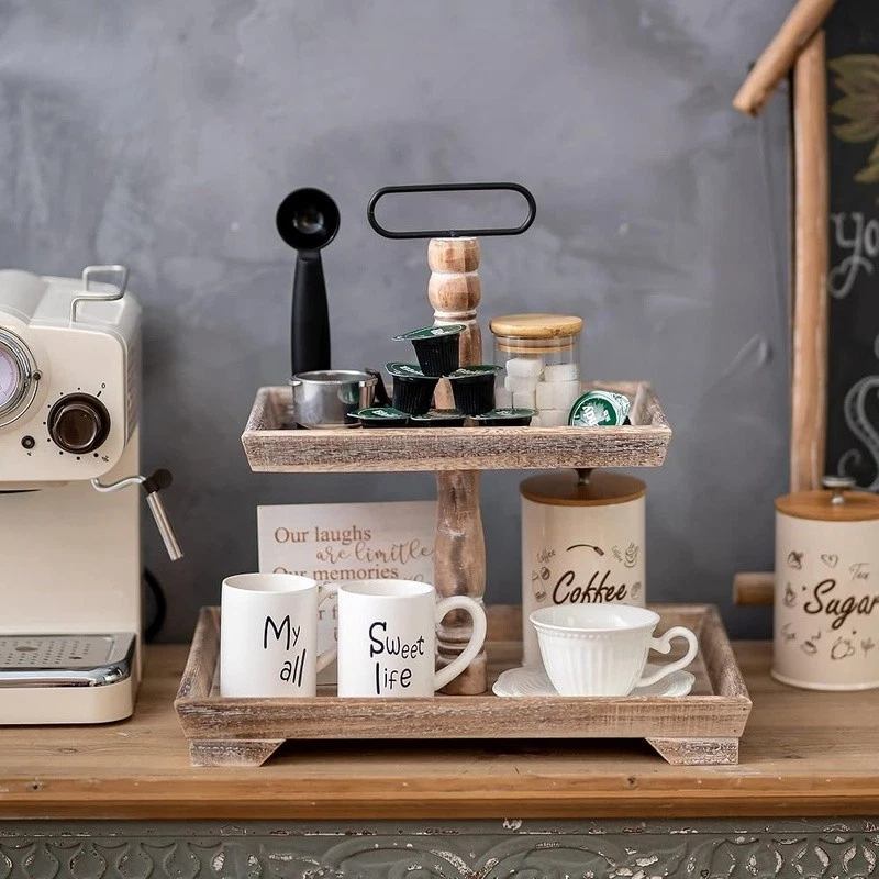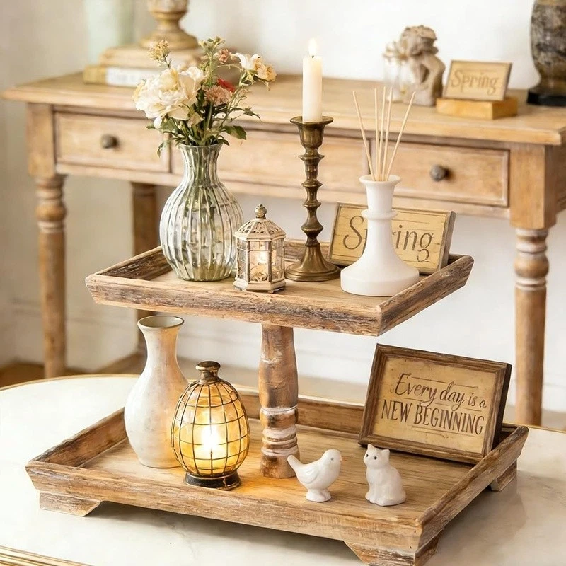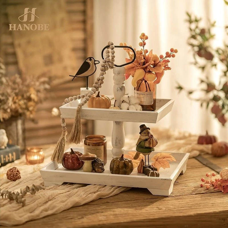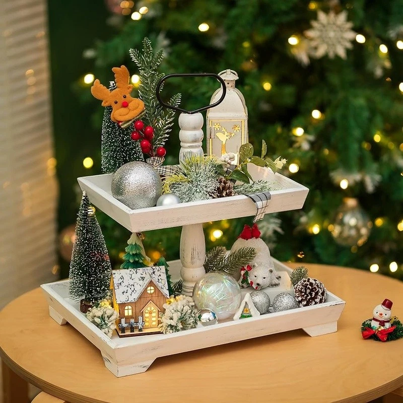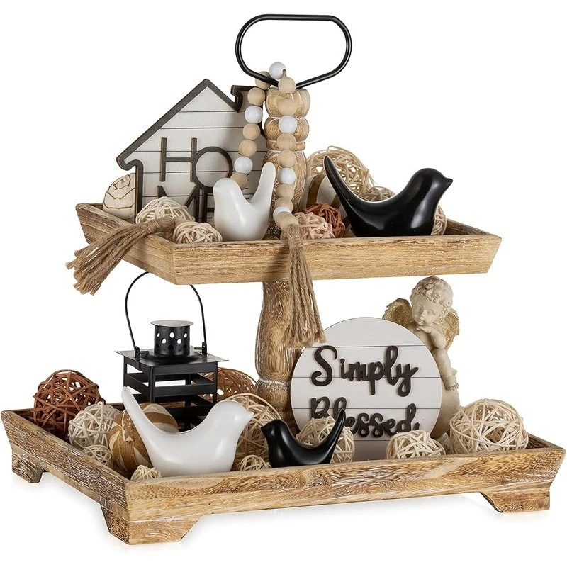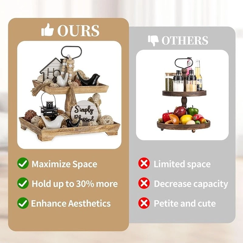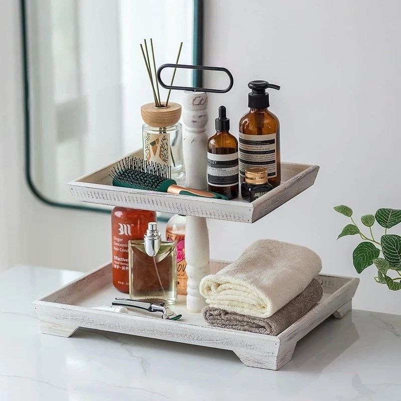 About this item Timeless Farmhouse Elegance : The whitewashed finish of our two-tiered tray serving stand adds a touch of timeless elegance to your home decor. It's the perfect backdrop for displaying cherished items, from cups to candles, plants to picture frames, and everything in between Versatile Celebration Hub : Our 2-tiered tray decor is the heart of every celebration. Whether it's Valentine's Day or Thanksgiving, this farmhouse tiered tray stand is your go-to for seasonal charm. It's the centerpiece that adapts to every festive mood, making your decor pop with rustic appeal Maximize Space, Enhance Aesthetics: The decorative tiered display stand's rectangular design is both space-efficient and aesthetically pleasing. It offers more room for your decor while taking up less counter space. This smart, farmhouse-style stand can hold up to 30% more, making it the perfect addition to any room Perfectly Sized for Display: With dimensions that allow for ample display space, our tray stand ensres that your decor items are the stars of the show. The bottom tray's 15.8"x 11.8" and the top tray's 11.8"x 8.7" provide plenty of room, while the 15.8" height and 7" gap between trays accommodate even taller pieces Rest easy knowing our uwavering commitment to support is just a message away, with a promise to resolve your queries within 24 hours. Purchase with complete confidence! Brand: Color: White Material: Engineered Wood Product Dimensions: 15"L x 12"W x 1.9"H Shape: Rectangular