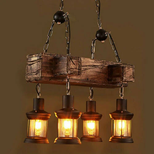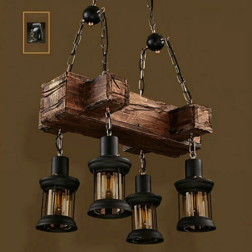 Rustic 4 Heads Chandelier Wood Industrial Ceiling Lamp Pendant Light Fixture USA