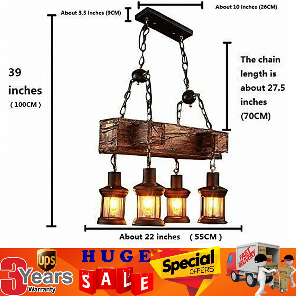 Rustic 4 Heads Chandelier Wood Industrial Ceiling Lamp Pendant Light Fixture USA Description Description This is a creative antique country wood pendant light made of solid wood and metal. The unique shape and style make it extraordinarily eye-catching. As a creative decorative light, it not only has a beautiful appearance but also has a wide range of light. In addition, the wood and metal material are solid and durable. It is suitable for homes, bars, cafes, restaurants, hotels, bookstores, clothing stores, studios, etc. Key Features Great Durability: This wood pendant light is made of wood and metal, so it is very strong and durable. And the solid metal chains can make the whole light very firmly fixed in the ceiling, so there is little risk of falling. And the surface of the lampshade is coated with black paint, which prevents the metal surface from rusting. Creative Retro Design: This light has a very retro appearance, made of wood with a black metal lampshade and thick metal chains, looks very retro. Fitted with this light, your room will look warm and beautiful. High Stability: The light uses two thick chains and a metal mount to hold it to the ceiling, so it has good weight-bearing capacity and balance. The light is strong and stable without falling down risk. Chain Adjustable: The chain length of this light can be adjusted according to the ceiling height of your room. So you can choose the most suitable installation height. Wide Applications : This light is very unique and beautiful. It can be used for both lighting and decoration, so it is suitable for a variety of places, such as homes, bars, cafes, restaurants, hotels, bookstores, clothing stores, studios, etc. Easy to Clean: This light has dustproof shades on all 4 bulbs. The dust will not easily enter the inside space, so it is very easy to clean. You just need to wipe off the dust on the surface of the lampshades with a towel. Easy to Replace: The bulb base uses a standard E26 connector. If one day your bulb is broken, you can easily replace it with the E26 bulbs. Guaranteed Customer Service: We aim to provide quality products and services. If you have any problems, please feel free to contact us. We will reply and solve the problem for you as soon as possible. Details Lantern Glass Shades: All 4 bulb bases are equipped with highly transparent lantern glass shades. The lantern shades look very antique and charming. The glass has high light transmission, ensuring the brightness of the lighting, while also protecting the bulb inside. Unevenly Designed Wood Board: We carved the uneven grain on the wood board of this light specifically to make it look more antique and beautiful. So please do not feel that the board is broken after you receive the goods, it is just a special design. Application The recommended use area for this light is 8-15m²/86-161ft² for homes, bars, cafes, restaurants, hotels, bookstores, clothing stores, studios, etc. Specification Shade Material: Glass Shade Color: Clear Shape: Lantern Chain Adjustable Or Not: Chain/Cord Adjustable Bulb Type: LED/Incandescent/Fluorescent Bulb Base: E26 Number Of Bulbs: 4 (Not Included) Wattage Per Bulb: Max 40W Chain Length: 70cm/27.5inch Metal Base Size: 26*9cm/ 10*3.5inch Fixture Height: 38cm/15 inch Fixture Width: 55cm/21.5inch Suitable Area: About 8-15m²/86-161ft² Package Included 1* Wood Pendant Light 1* English Instruction Manual All Accessories Needed for installation Notes Please notice that the bulbs are not included. Please check all parts after opening the box, installation of this product should be carried out by a qualified electrician. Please install this product in a dry and ventilated place. Not for use in wet conditions. In order to increase the life span of the lamp, please wear gloves when installation and keep the product surface clear by clearing the lamp with a soft cloth. Please ensure all connections are tight after finishing the installation. In order to avoid shipping damage, this light is not assembled, you need to install it yourself. Please allow the slight color difference caused by the shooting light and 1-3 cm error due to manual measurement, and make sure you do not mind before ordering. Payment Delivery details Terms of sales About us Contact us Payment We accept ebay payment 。 Fees such as import duties, taxes are not included in the item price or shipping costs. These charges are the buyer's responsibility. Delivery details Shipping: 2-9 working days to: USA Terms of sales We maintain high standards of excellence and strive for hundred percent customer satisfaction. Feedback is very important to us. We hope that you contact us immediately before you give neutral or negative feedback, so that we can address your concerns. It is impossible to address issues if we do not know about them! About us Your satis faction is our ultimate goal. We work hard to earn your trust and future business. Our certified technicians have tested each item before shipping. The unit comes with 1 year limited warranty on all manufacturing defects. a) If you receive a defective item, you may return it or ask for a discount. Please contact us within 14 days after you receive the package. b) What you returned must be intact and in its original packaging as re? u. Customer is responsible for shipping costs of the returned item. c) We will cover the cost of shipping back t with the shipping rate indicated in the registration page. We will send you a new unit or refund the full payment you paid. Thank you. Contact us Business Hour Business Hour: Monday To Friday: 8:30 AM to 5:00 PM (Beijing China time) Due to time zones, our reply to your questions may not be immediately. But within above working time, we will reply your email within 24 hours. If it's non-workdays, please kindly be patient and wait till Monday. Please contact us with ebay message. Please feel free to contact us if you have any questions. Monday To Friday: 8:30 AM to 5:00 PM (Beijing China time) D