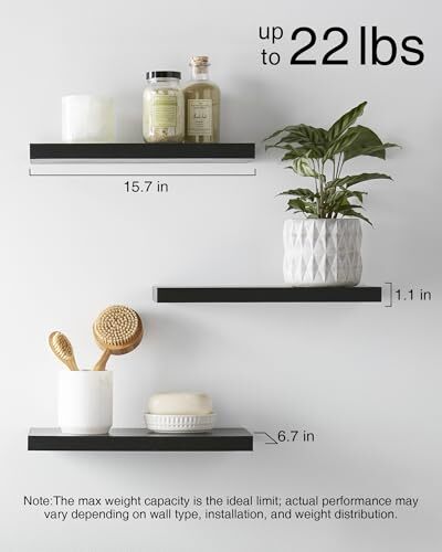 Return Policy Fast Delivery Trusted seller Floating Shelves for Wall, Wall Mounted Rustic Wood Shelves for Bathroom, Bedroom, Living Room, Kitchen, Hanging Shelf for Books/Storage/Room Decor with 22lbs Capacity (Black, Set of 3, 16in) Product Description Engineered Wood Modern & Simplistic - Create a personalized display with our sleek wooden floating shelves that offer a contemporary design Protection Sealing - Each shelf is treated with a protective sealant to prevent warping or damage Versatile Design - These shelves can be easily placed in any room, from your cozy bedroom to your functional kitchen or home office,christmas decoration Increased Load-Bearing - Our shelves can hold up to 22 lbs, allowing you to display your favorite objects with confidence Larger Size - Measuring 16 inches in length, our shelves provide ample space for both storage and decoration Shipping Returns Payment Shipping Shipping is FREE to all addresses other than APO/PO boxes in the lower 48 states. All our stock ships from US-based warehouses. Shipped via USPS or UPS (depending on location and package weight) Unless stated otherwise, all orders will ship within 24-72 hours of your payment being processed. Check our feedback to see the great reviews of FAST shipping we offer. Returns Seller does not accept returns Payment We currently accept payment via eBay managed payments only. Once payment is cleared, we will dispatch your shipment within 1-3 business days. Please refer to the "Shipping" tab for more information regarding shipping speed to your destination.