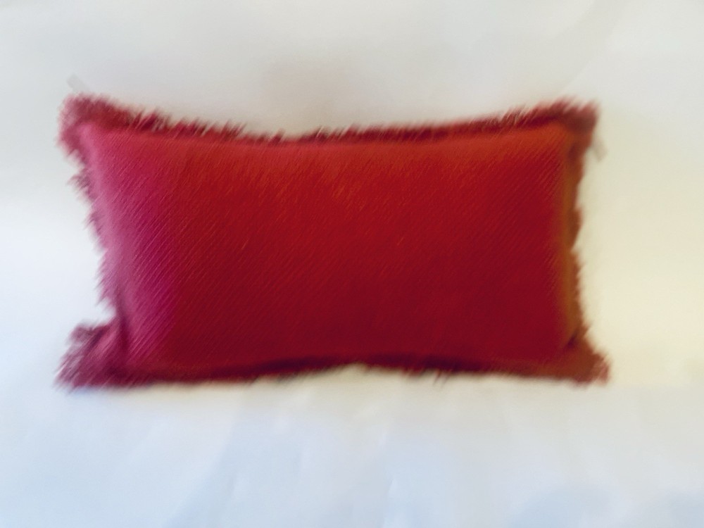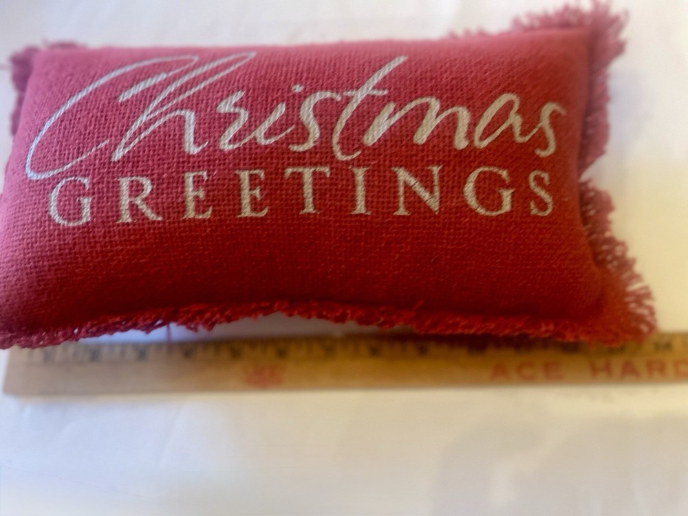 Rustic “Christmas Greetings” is printed in cursive on this precious Accent Christmas Pillow Red. Add this piece to your Holiday Decorations with this Rustic Pillow with its fringed edges. Color: Red Fabric: Woven Size: Approx. 8 x 12” Features: Fringed Edging Condition: Excellent Smoke - free home No box