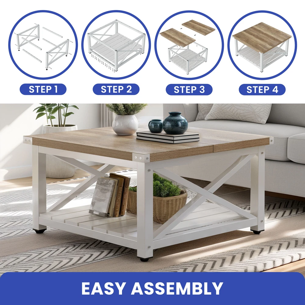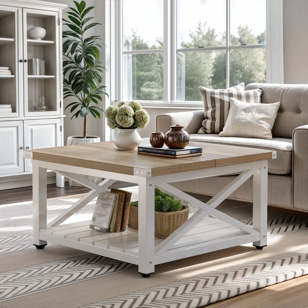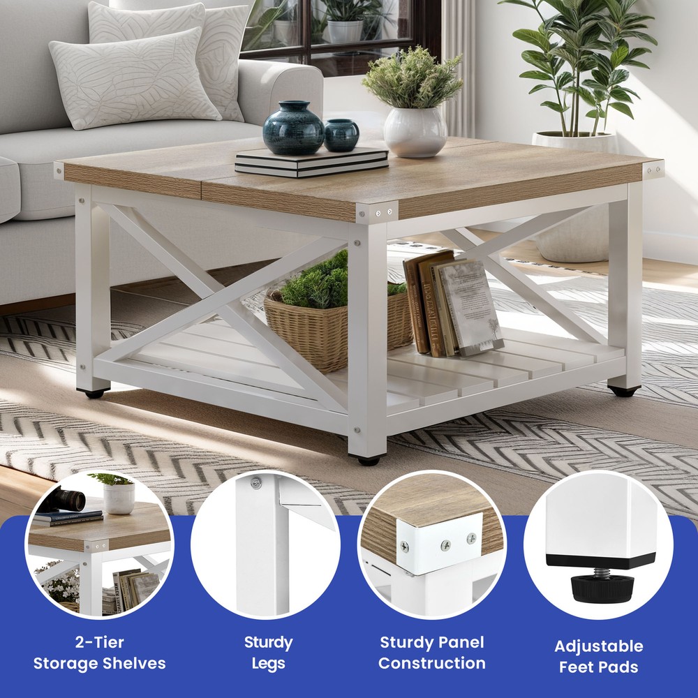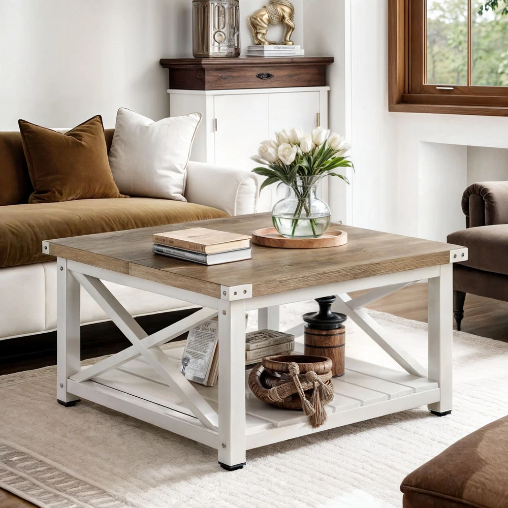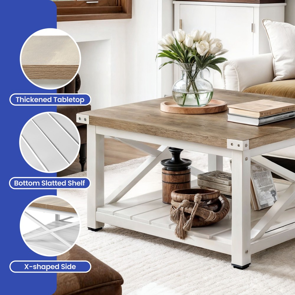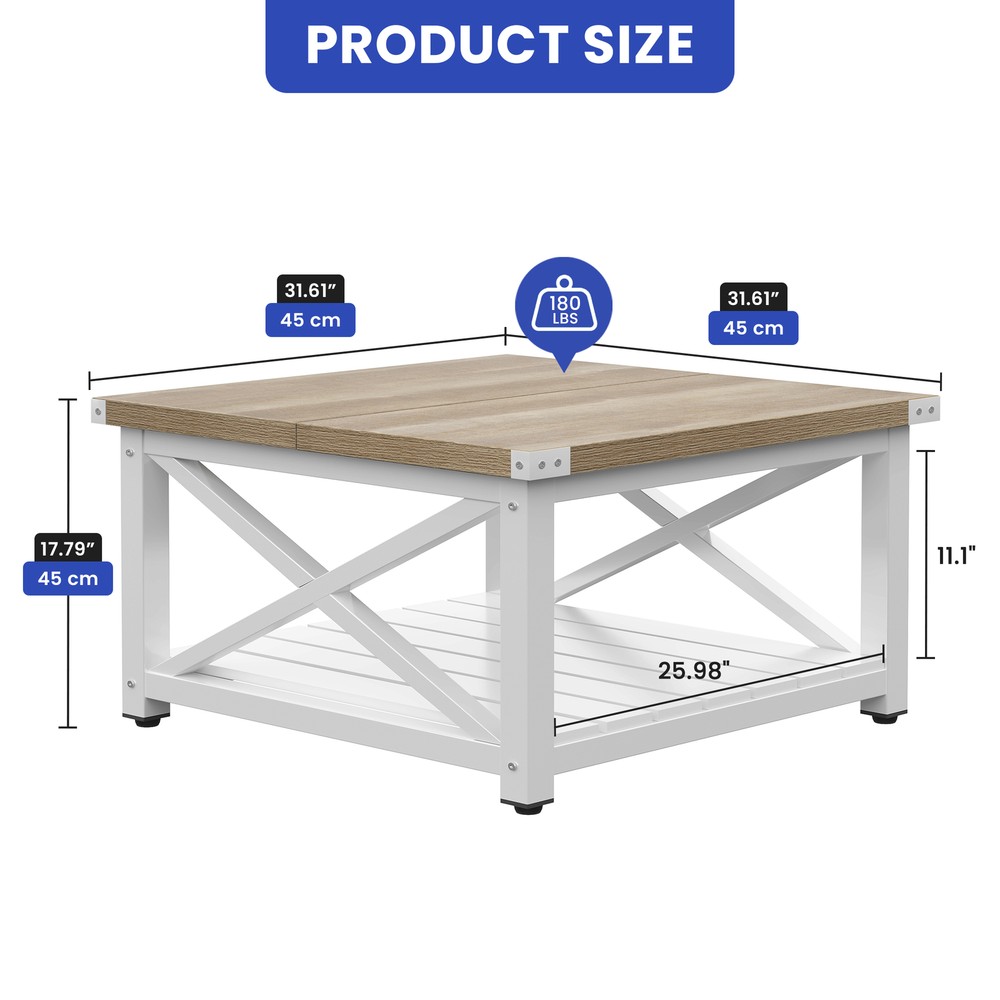 Square Farmhouse Coffee Table Wood Open Storage & Anti Slip Pad for Living Room Product Description NOTE: Professional Installation would be Highly Recommended. Description: 1. Color: Gray Wash 2. Material: P2 Certified Particle Board, Metal 3. Room Type: Bedroom, Living Room, Family Room, Den, Home Office/Study, Entertainment Area, Sunroom 4. Feature: 2-Tier Storage Shelves, Sturdy Legs, Sturdy Panel Construction, Thickened Tabletop, Bottom Slatted Shelf, X-Shaped Side Panel, Spacious Tabletop, Open Compartment Underneath, Waterproof, Scratchproof, Easy to Assemble, Easy to Clean, Protective Foot Pads. Features: 1. Sturdy 2-Tier Storage Coffee Table with Adjustable Feet This sturdy coffee table offers ample 2-tier storage for essentials and décor. Its strong panel construction and sturdy legs ensure durability, while adjustable feet pads provide perfect stability on uneven floors. A reliable and functional addition to any living space. 2. Stylish Coffee Table with Slatted Shelf & X-Shaped Design Featuring a thick tabletop and a slatted bottom shelf, this table enhances both durability and storage. The X-shaped side panels add superior structural support while giving a stylish, modern touch to any living space. 3. Premium Thickened Tabletop Coffee Table (1.18-inch thick) Experience superior durability with this coffee table's thickened 1.18-inch tabletop—nearly double the standard! This provides a solid, premium feel and makes it ideal for heavy use, ensuring a long-lasting and robust centerpiece for your home. 4. Easy Assembly Coffee Table (4 Simple Steps, No Tools Needed) Get your new coffee table ready in no time! Designed for convenience, this table can be assembled in just four simple steps. Clear instructions make setup quick and hassle-free, with no specialized tools required. Enjoy effortless setup! 5. Compact & Durable Coffee Table (Supports 180 lbs) This space-efficient coffee table is both sturdy and practical, supporting an impressive 180 pounds. Its well-proportioned dimensions make it ideal for small living areas or as a versatile accent piece in larger rooms, offering durability in a compact form. Dimensions: 1. Product Dimensions: 31.61" L x 31.61 " W x 17.79" H 2. Open Storage Dimensions: 25.98" L x 25.98" W x 11.1" H 3. Maximum Weight Capacity: 180 lbs 4. Weight: 47.39 lbs Package Included: 1 x Coffee Table 1 x Instruction 1 x Accessory Kit Note: 1. During assembly, do not tighten screws until all holes are aligned. 2. Confirm the appropriate furniture size for your needs prior to purchase. 3. There may be a slight color discrepancy between the product as seen on your monitor versus in real life. 4. Do not expose the product to extreme sunlight. To extend product lifetime, cover when not in use. 5. Contact us immediately if any components are missing or damaged upon arrival. Our customer service team will resolve your issue right away. Shipping 1. Normally the item will be dispatched within 1 business day if payment is cleared before 12pm PST. 2. Please verify the correct shipping address in your PayPal account before making the payment. We only dispatch the item to the address that is sent to us at the time of checkout. 3. We don't ship to Hawaii, Alaska, Puerto Rico, APO/FPO/PO Boxes. 4. We don't provide local pick-up service. 5. Normally we will use USPS, UPS, FedEx & LTL to dispatch items. Payment 1. We accept PayPal and credit card. 2. We will ship to the confirmed Paypal shipping address that is provided with the payment only. Return 1. 30 days Money Back Guarantee. 2. Please contact our customer service to receive a RMA form first if want to return the item. 3. All returned items MUST in new condition with the original package. Contact If has any problem, please contact us by sending an ebay message. Our customer service will resolve the problem as soon as possible. On Mar 17, 2025 at 00:05:27 PDT, seller added the following information: On Jun 11, 2025 at 03:58:51 PDT, seller added the following information: