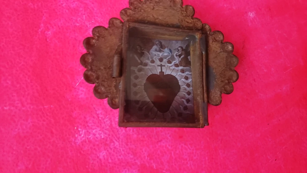Beautiful tin ornament nicho, wall hanging made in San Miguel de Allende. Rustic, rusty, Nicho with image of flaming Sacred Heart with roses Size 3.75" tall x 4" wide, handmade, The nicho has a glass door that opens, Please check photos great work. San Miguel de Allende, it is a famous colonial mexican city, famous not only for the beautiful colonial buildings and churches but also by its huge international creative community, one of its more important crafts it is the work of tin since many many decades ago, in its origins almost 100% of it was devotional art, specially nichos, but know the craft has become more wide in its subjects like folk art and decorative wall hangings. Thanks for buying, for more than 14 years our objective at "Los Naguales" has been to provide with handmade treasures that will help bring beauty to your live, so thank you so much for your support.