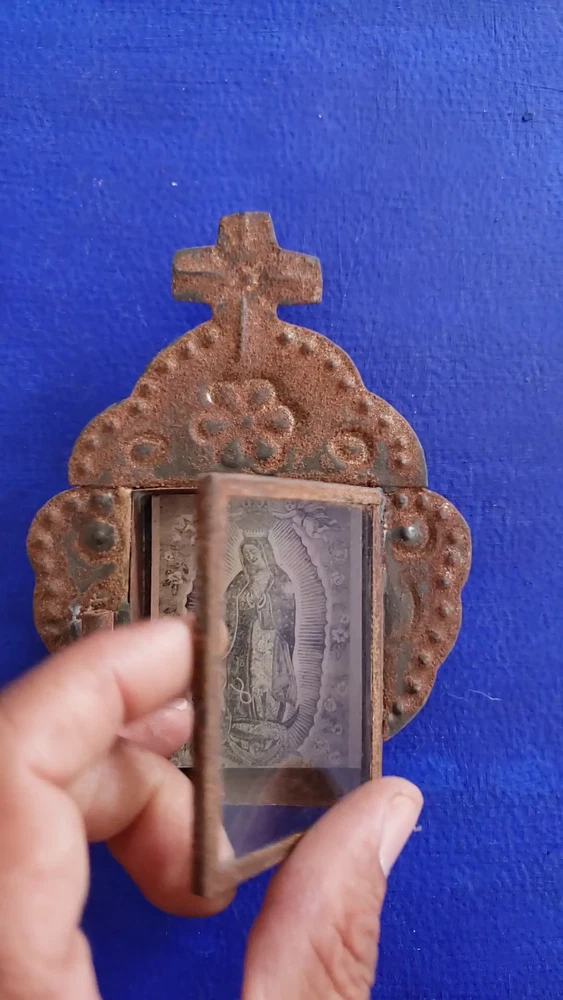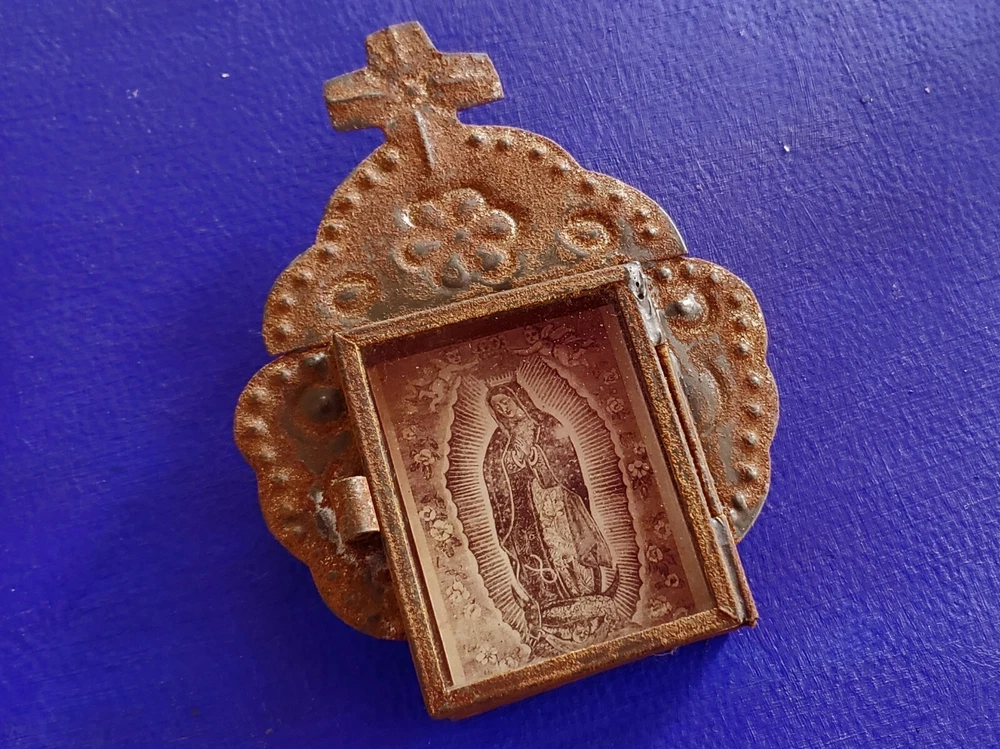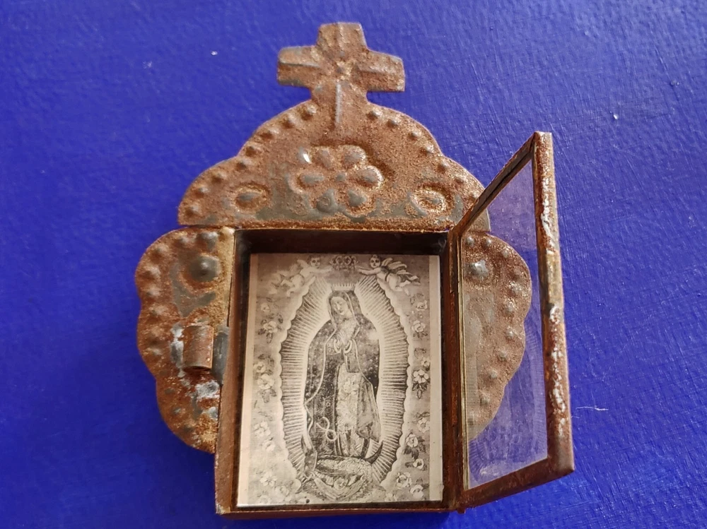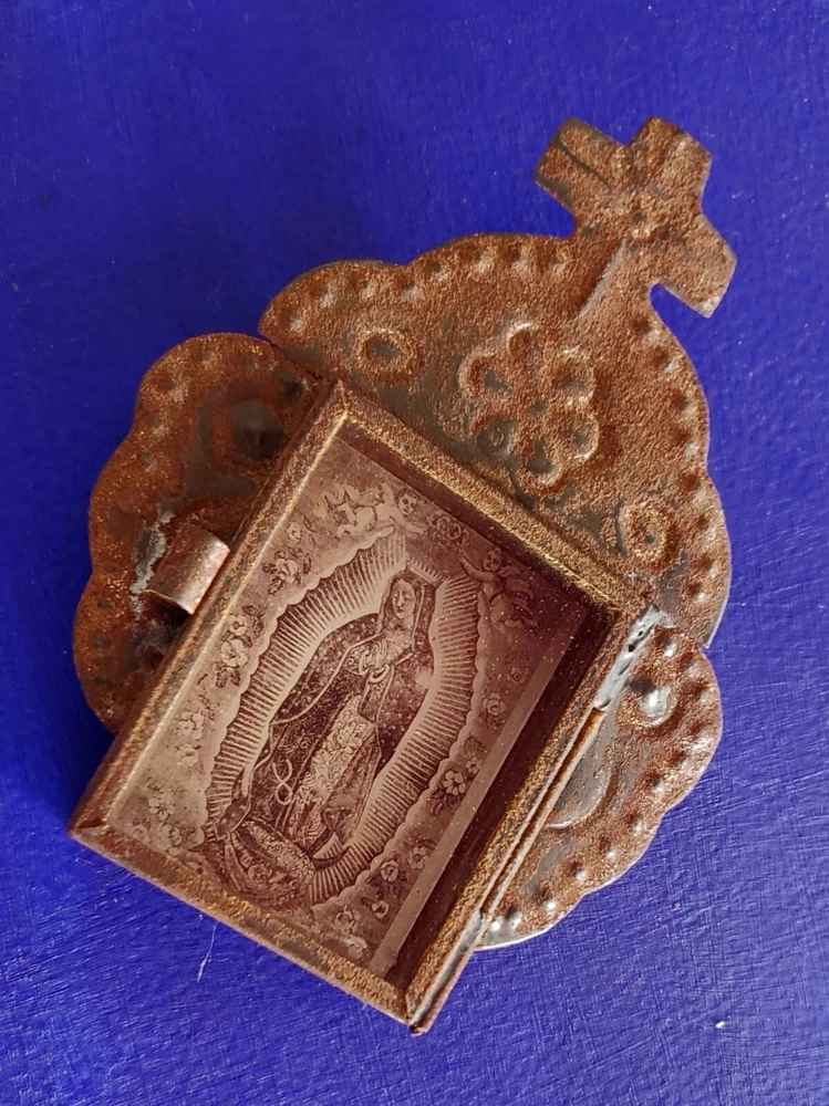 Beautiful tin ornament nicho, wall hanging made in San Miguel de Allende. Rustic, rusty, Nicho with image of Our Lady of guadalupe Size 5" tall x 4" wide, handmade, The nicho has a glass door that opens, Please check photos great work. San Miguel de Allende, it is a famous colonial mexican city, famous not only for the beautiful colonial buildings and churches but also by its huge international creative community, one of its more important crafts it is the work of tin since many many decades ago, in its origins almost 100% of it was devotional art, specially nichos, but know the craft has become more wide in its subjects like folk art and decorative wall hangings. Thanks for buying, for more than 14 years our objective at "Los Naguales" has been to provide with handmade treasures that will help bring beauty to your live, so thank you so much for your support.