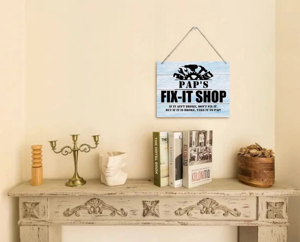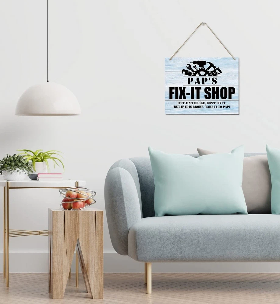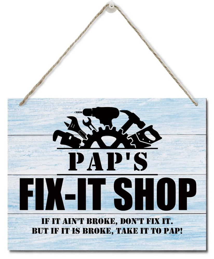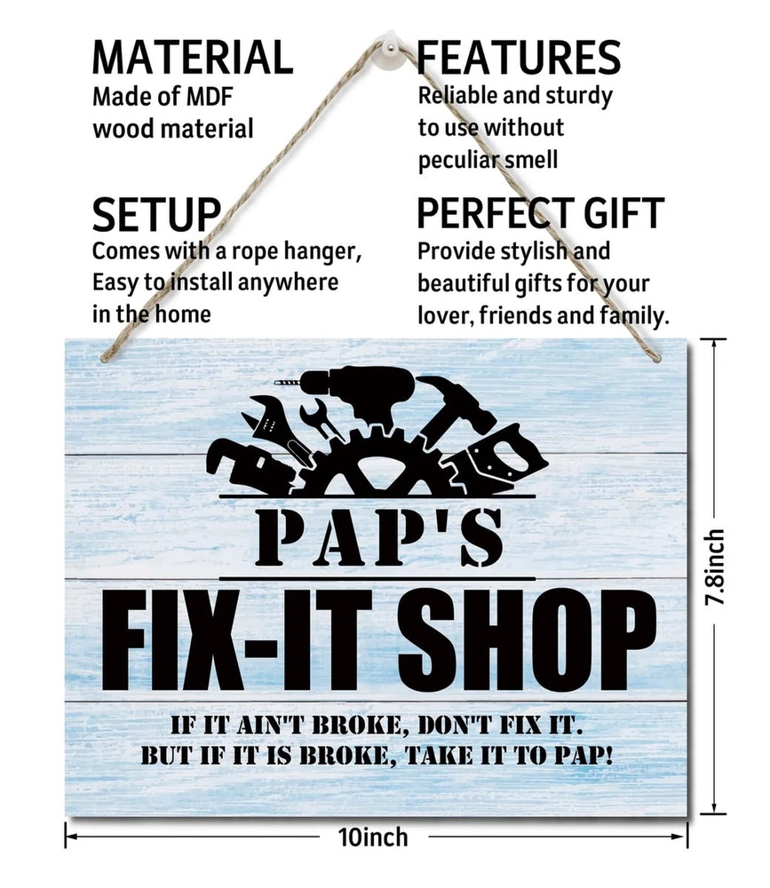 Rustic "Pap's Fix-It Shop If It Ain't Broke, Don't Fix It." Wall Art Sign, Hanging Printed Wall Plaque Wood Signs, Farmhouse Decor, Home Decor, Father's Day Gift for Grandpa 10 X 7.8 inch Product Details Style: Paps Fix-It Shop Brand: AUII JO DESIGN MPN: 1 UPC: Does not apply EAN: Does not apply Color: white Brand: AUII JO DESIGN Material: Engineered Wood, Wood Theme: Rustic,Farmhouse Mounting Type: Wall Mount Product Dimensions: 10"L x 0.12"W Shape: Rectangular Style: Paps Fix-It Shop Item Weight: 3.84 ounces Manufacturer: AUII JO DESIGN Country of Origin: China Item model number: 1 Material: Made of high quality MDF wood material with hemp lanyard, the decoration is odorless, not easy to fade, very durable and not easy to damage. Size is 10 x 7.8 x 0.12 inch, 26 x 20 x 0.3 cm Easy to use: The wooden wall sign is equipped with a hemp rope hanging strap, which is convenient and simple for you to quickly and easily do wall installation, perfect for your home, office, business, garage, dorm, game room, kitchen or anywhere you want to display this unique logo. Beautifully Crafted: Our signs make a great gift, our wooden signs are beautifully printed and durable, we have hundreds of different designs to choose from to give your house a chic finish; suitable for indoor use, can also be used outdoors, as long as the environment is not humid. BEST GIFT: Our wooden signs will look great in your home and friends' homes. This is a versatile gift for Christmas, Thanksgiving, outdoor or indoor parties, birthday parties, New Years decorations, and a great decorative gift for friends or family; hope it will give you encouragement and joy or remind Size: 10 x 7.8 x 0.12 inch; Material: Made of MDF wood material; If you are looking for a unique gift for your home or friends who want to give them positive energy, this is the one for you.