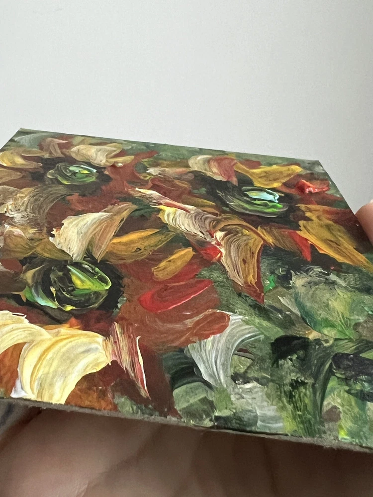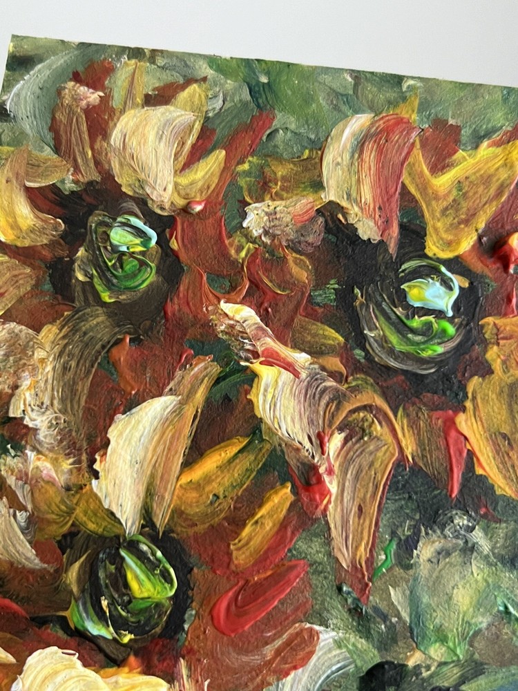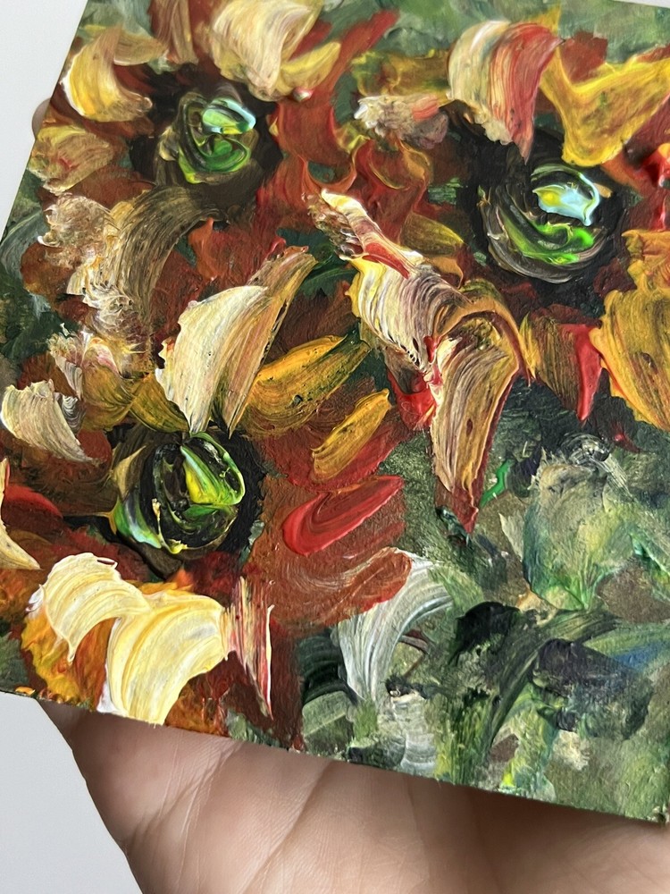 ๐ŸŒฟ Sunflowers acrylic painting. 100% hand painted Plein air impressionist art. Small floral painting. Original flowers art decor. ๐ŸŒฟ Original author's acrylic painting on thick cardboard . Unframed. Need a decorative frame. ๐ŸŒฟ Size: about ~ 10x12 cm / ~ about 4x5 inches ๐ŸŒท Signed from the back by Kateryna Oliynyk . ๐ŸŒฟ Materials: professional acrylic paints, cardboard ,. Unframed . Need a decorative frame. Or you can use a small stand / miniature easel.