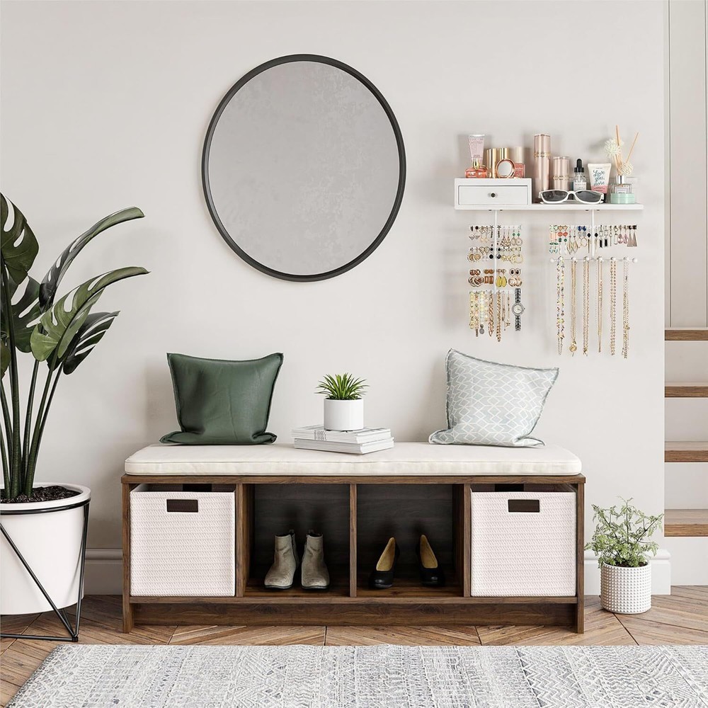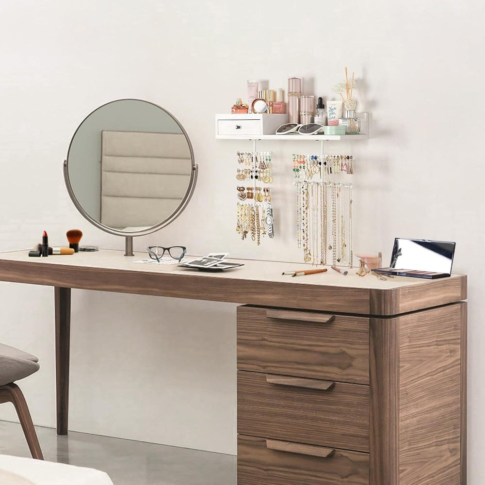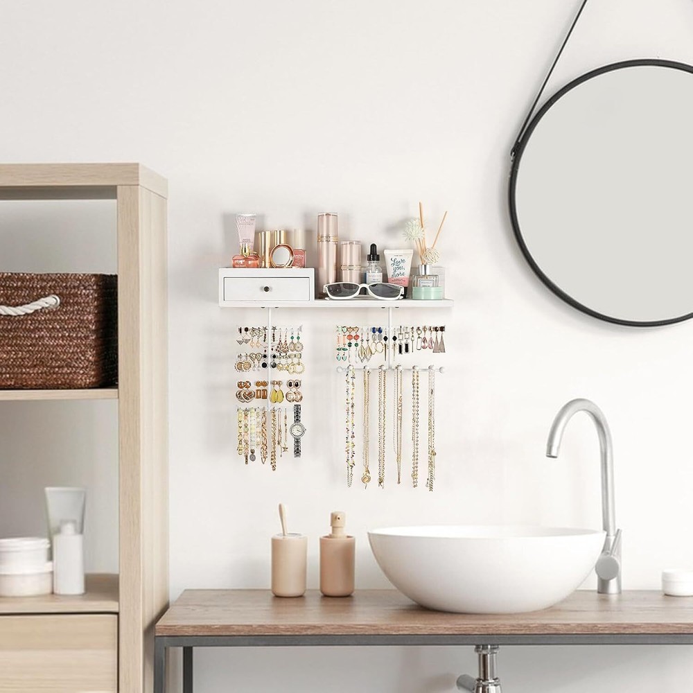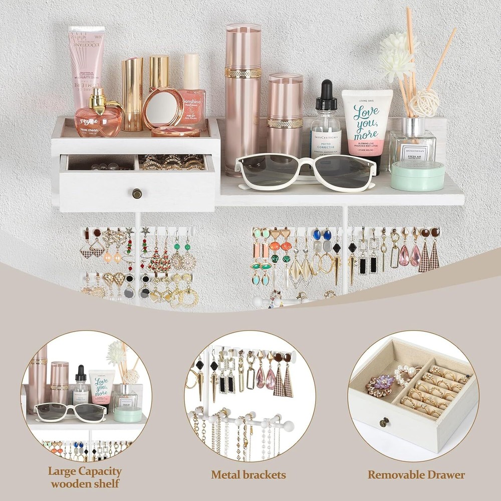 About this item Innovative Improved Jewelry Organizer:Totally 6 rods,allowing you freely place earrings,necklaces,bracelets,watches,eye glasses etc..Large capacity earring organizer:58 slots instead of holes,directly place and fetch;Necklace organizer:branched rods instead of single rod,avoid tangling,directly get the piece you want;Ring&brooches organizer:wood drawer,lined with soft fine linen,divided compartment for rings and brooches;Ample space shelf for storing cosmetic,perfume bottles,display decor items Wall Mounted Jewelry Organizer: Jewelry wall organizer is made of rustic wood with carbonized finish, creating a rustic and stylish look that complements a variety of decors. No tangled necklaces, no missing earrings, easily pick the right accessories for the day Large Capacity Jewelry Organizer: Wooden storage drawer for your percious ring and brooches, a shelf for perfumes, watches and eye glasses, 58 earring slots & 6 bracelet rod for storing all shapes and sizes of jewelry including rings, necklaces, bracelets, sets, large hoop earrings. It's time to show off your collection, outstanding hardwood made organizer for hanging all jewelry, perfect for storing your favorite jewelry Excellent Gift For Women: Every female have their own jewelry,and jewelry organizer is a necessary and lovely gift. This exquisite jewelry organizer is absolute a ideal gift for birthday, Christmas, New Year, Valentine's Day, anniversary and the perfect gift for mom, daughter, wife, girlfriend and female friend Enjoy Easy Setup: Wall mounting screws and anchors are included for easy quick installation, all you need to do is mount it on the wall with installed mounting brackets. The drawer lined with fine linen to keep your jewelry from scratching, plenty of divided space and organizers, greatly save your space, you can fit on your bedroom, closet, or bathroom wall. Get this jewelry organizer and say goodbye to the lost earrings and tangled necklaces