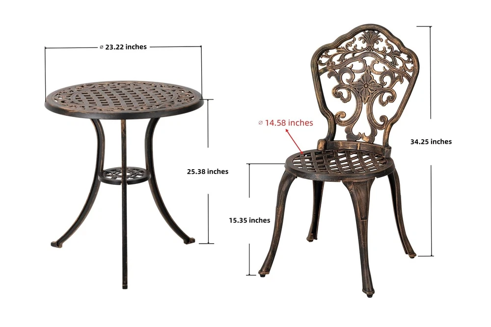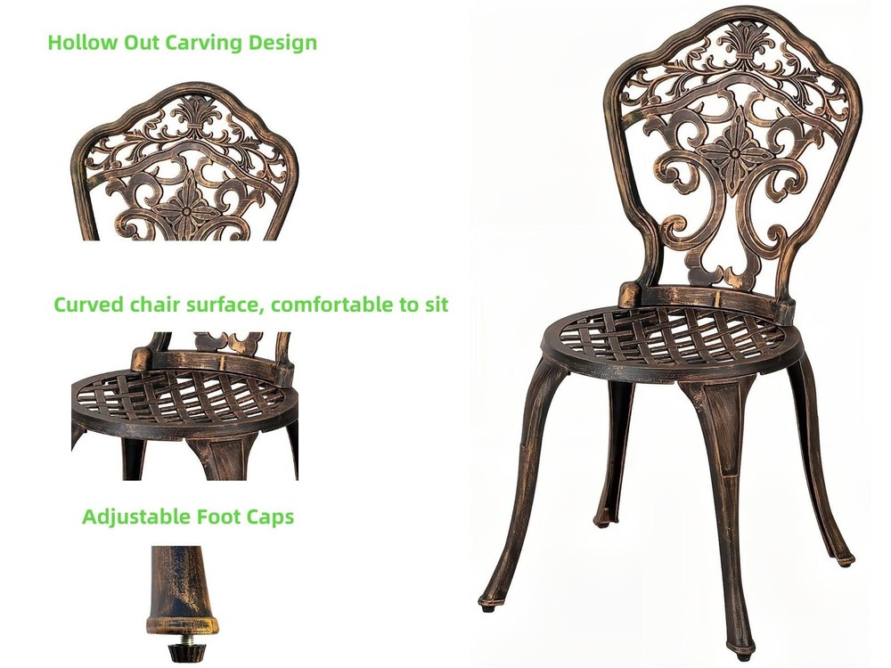 Our bistro set includes 1 garden table and 2 carved chairs, which are powder coated. Dignified classical style adds a touch of color to your garden and patio.Cast aluminum table and chairs are concise, beautiful and sturdy that you can enjoy quality time with family or friends in your garden.This patio bistro sets rust-proof, water-resistant and easy-to-clean, which takes your mind off trying to protect them. These table without umbrella hole and carved chairs also have adjustable pads on foot and the joint for protection. This outdoor furniture is worth having. 【Bistro Sets】 Includes a round table, two chairs. Table size: 23.22 inches(Diameter) x 25.38 inches(H); Chair size: 15.68 inches(Diameter) x 33 inches(H); Chair weight capacity: 290 pounds; Table weight capacity: 190 pounds. 【Classical Design】 Wide and thick panels on the seat and back make it comfortable and strong. Every leg of the chairs is equipped with adjustable foot caps, that can regulate the balance and prevent scratching the floor. 【Easy to Assemble】 Although there are many accessories, it is relatively easy to assemble with the video and the simple instruction manual. You can download the video from the product page. 【Heavy-duty Materia】 Powder coated cast aluminum frame structure, rust-resistant. Perfect for outdoors, light and sturdy that easy to carry. 【After Service for You】What if you have questions about the product? Locate your order and click on Problem with Order; choose your topic from list displayed and click on Contact. We'll give you feedback within 24 hours.